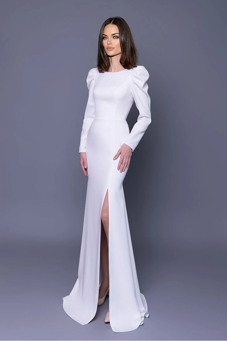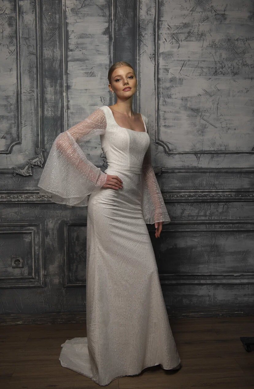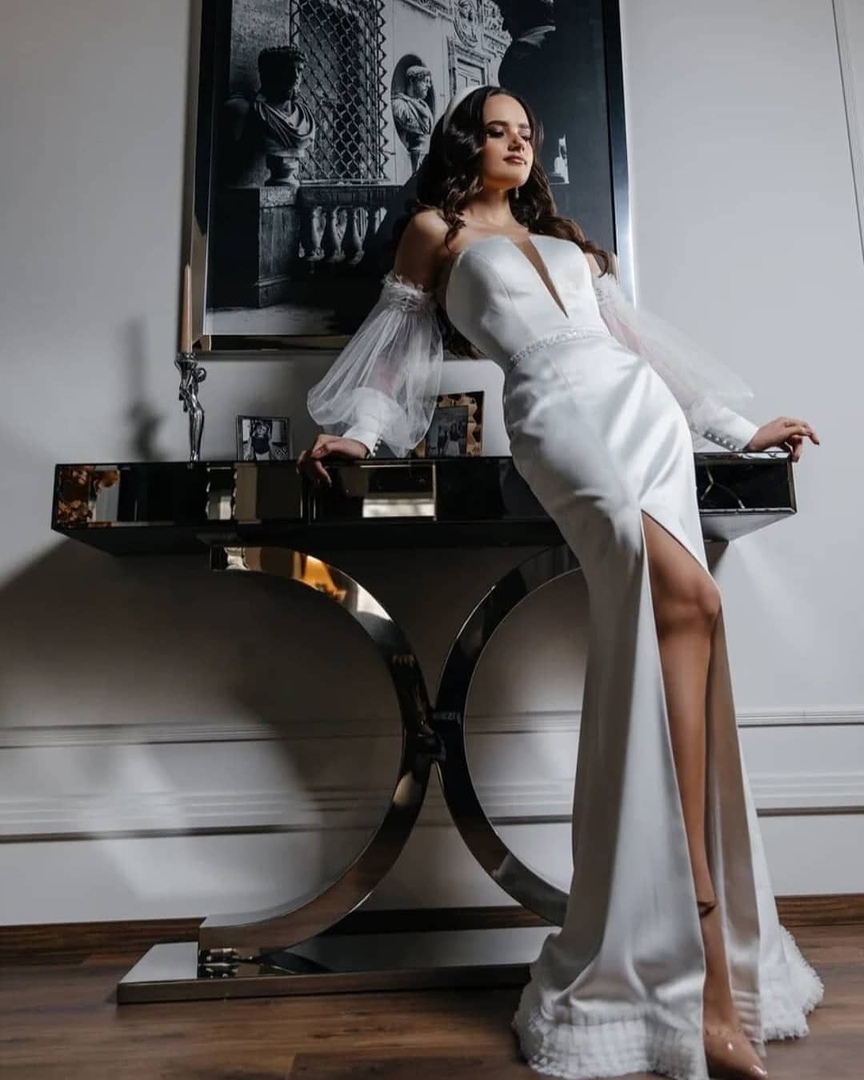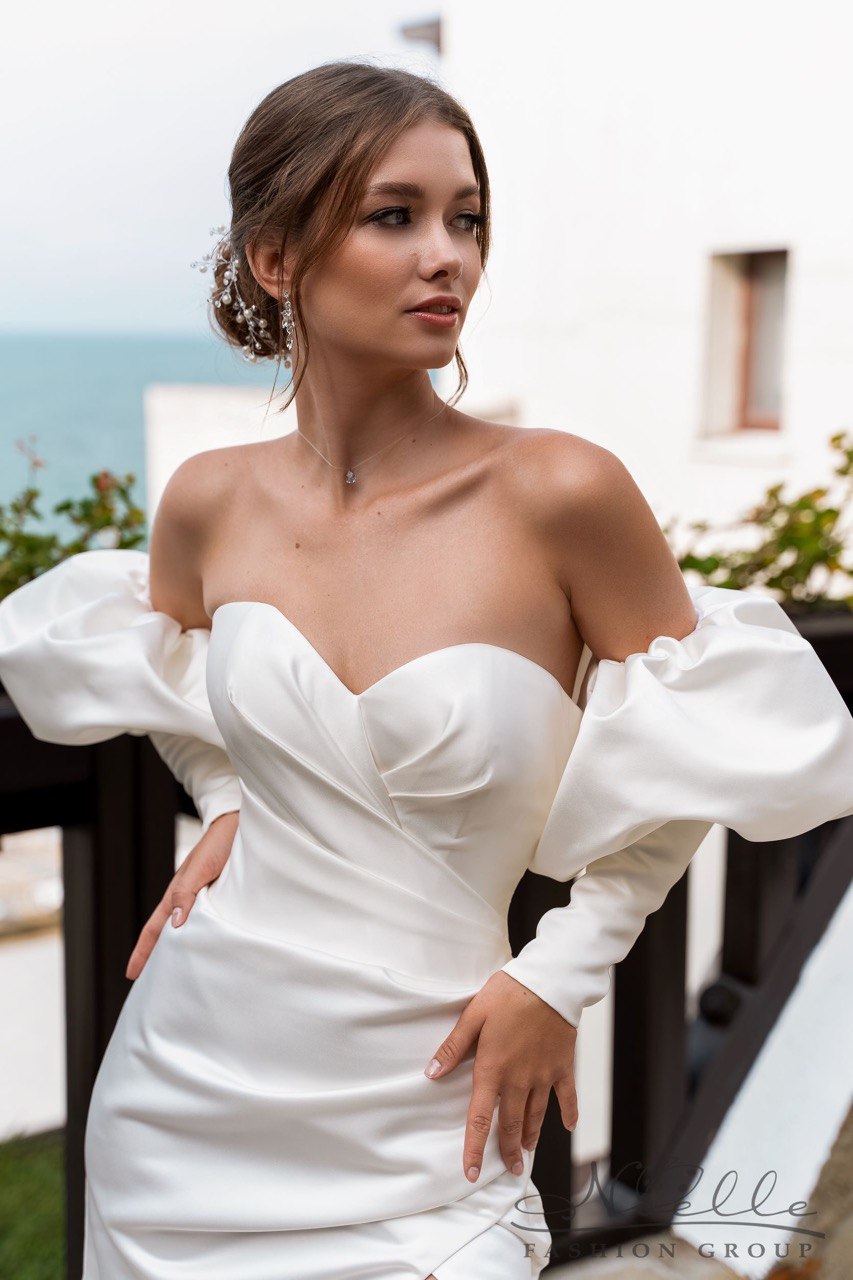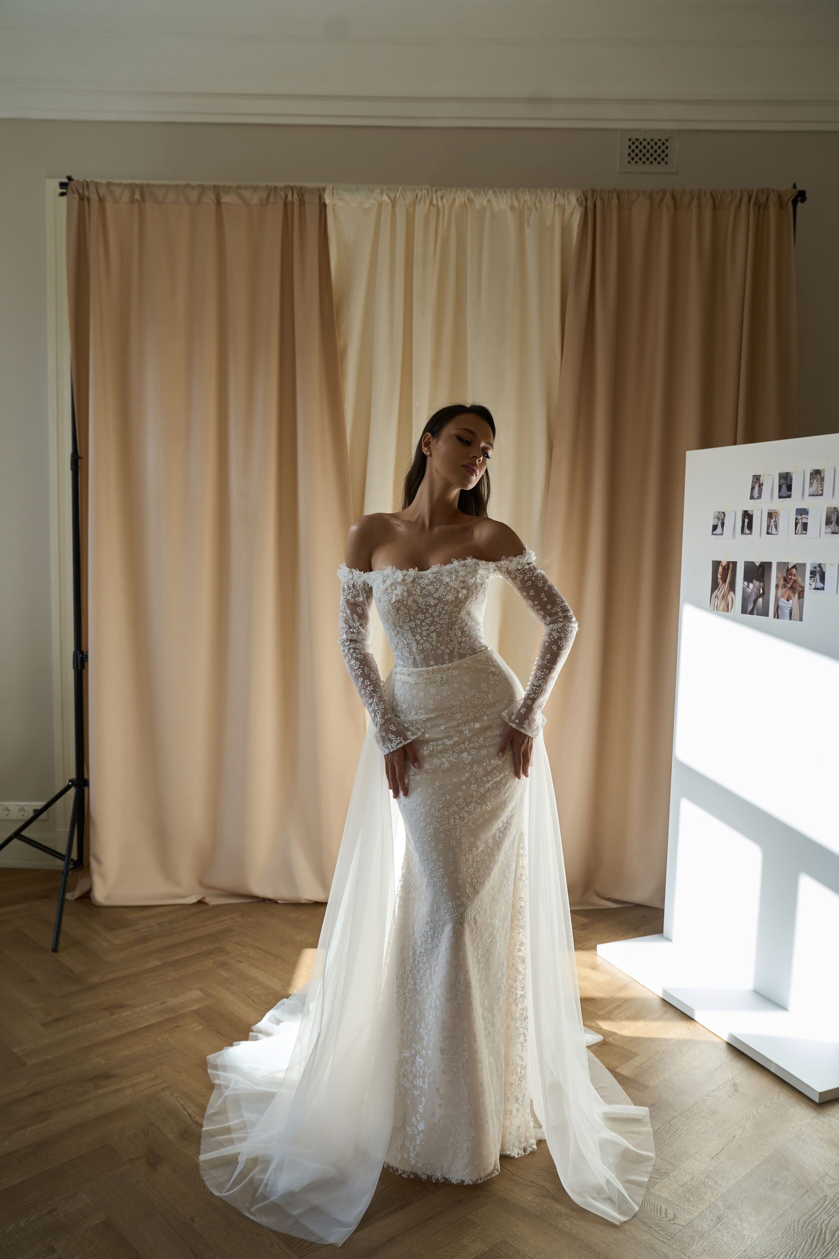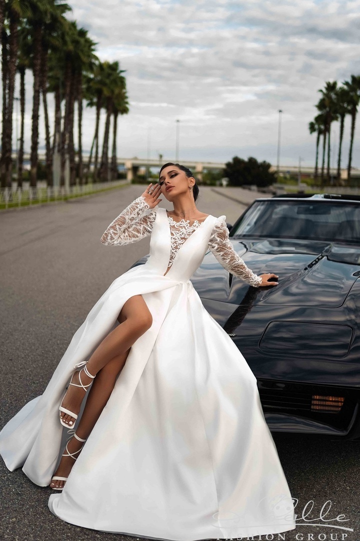 Потрясающее свадебное платье, силуэта рыбка с рукавами, приоткрытой спиной, обладающее собственным характером. Яркой деталью этой модели является шикарный вырез в зоне декольте, вытягивающий силуэт. Открытые плечи и длинные рукава создают притягательное ощущение контраста. Длинная облегающая юбка, выгодно демонстрирующая фигуру, оснащена эффектным глубоким вырезом.