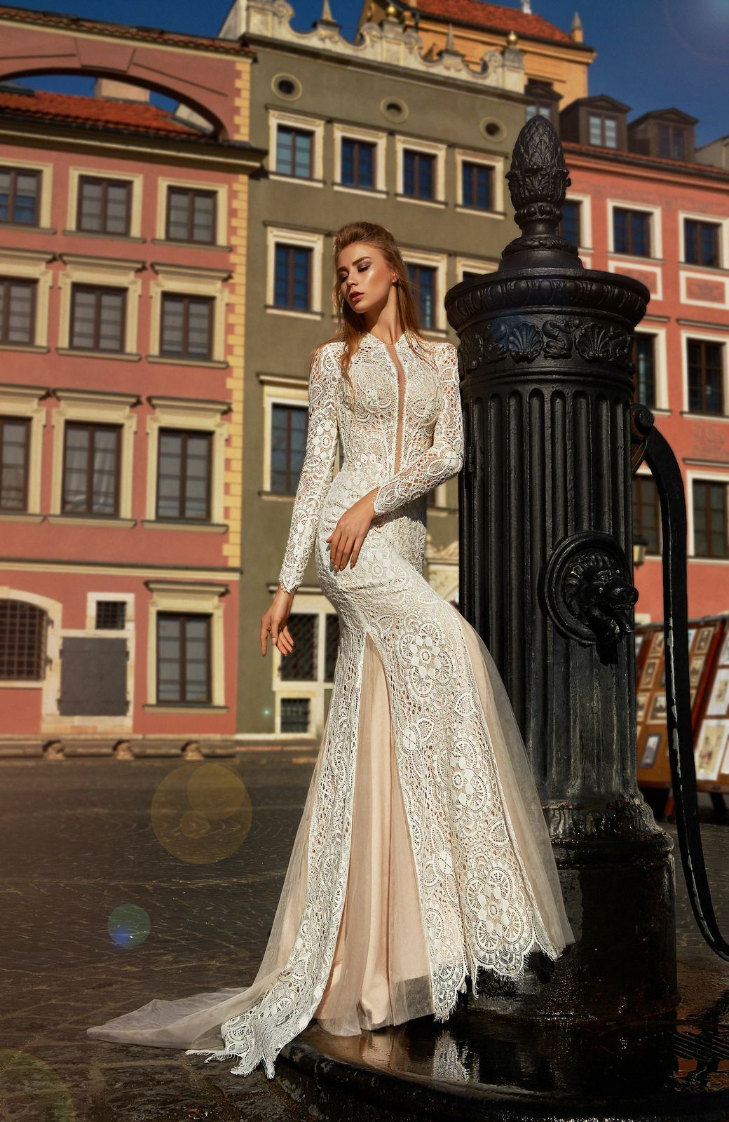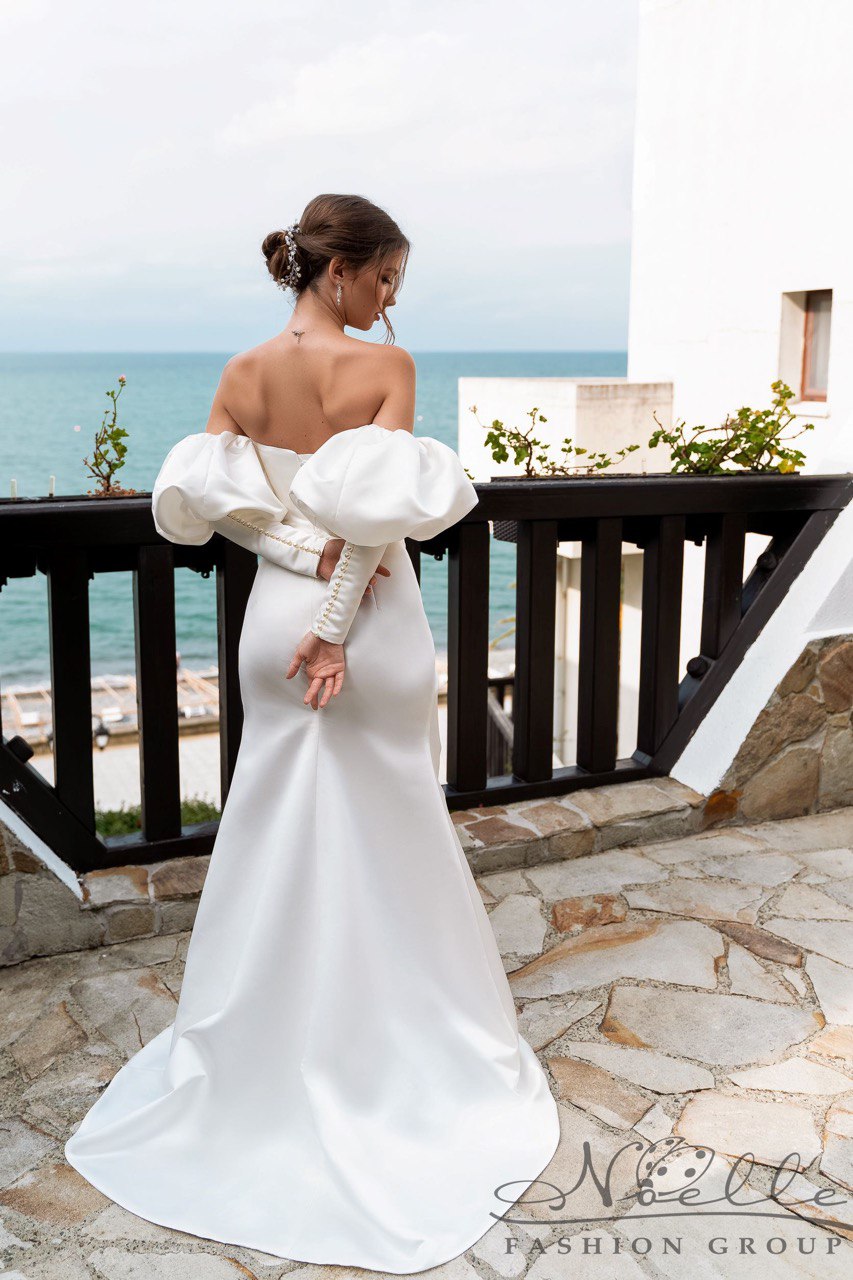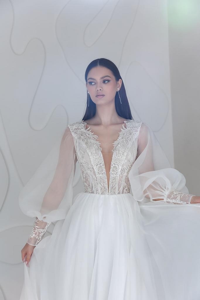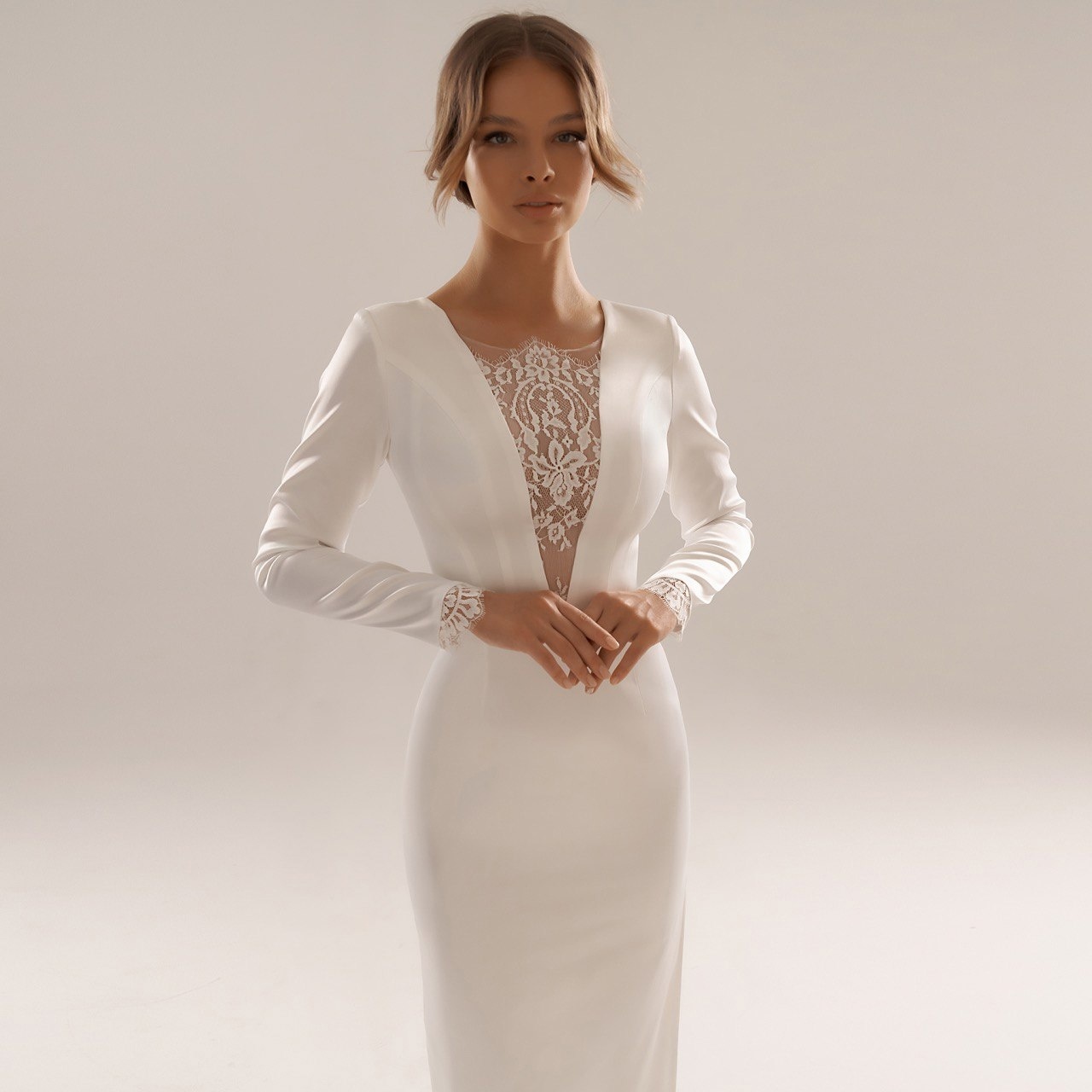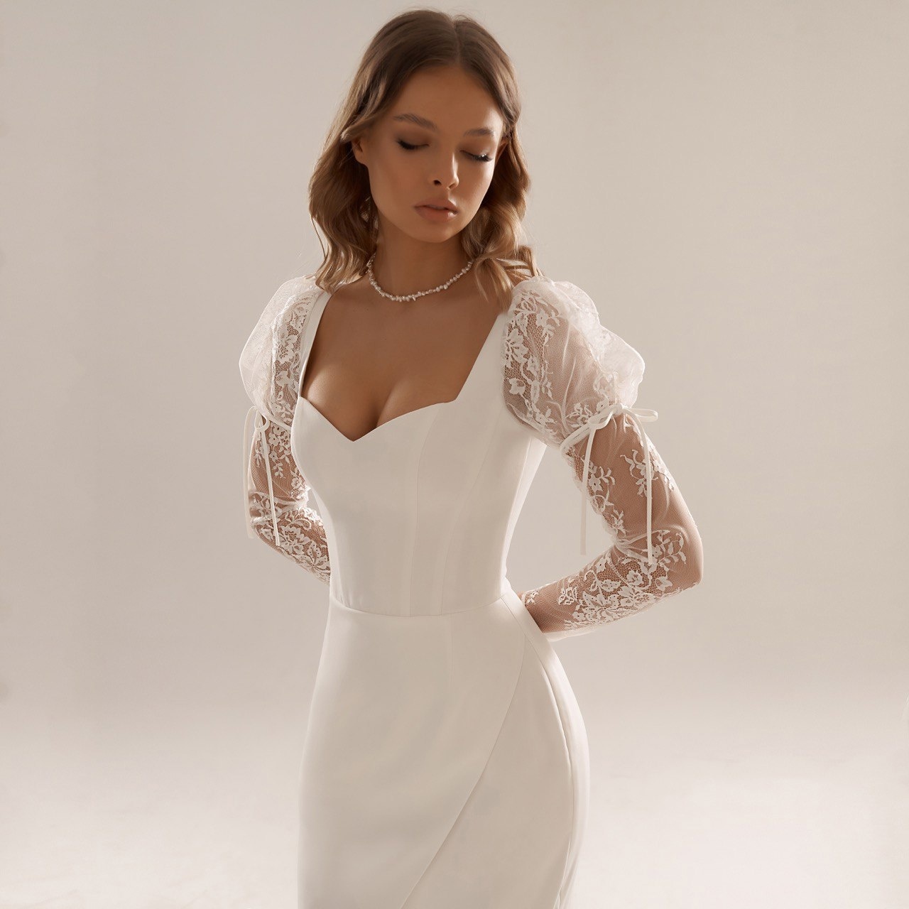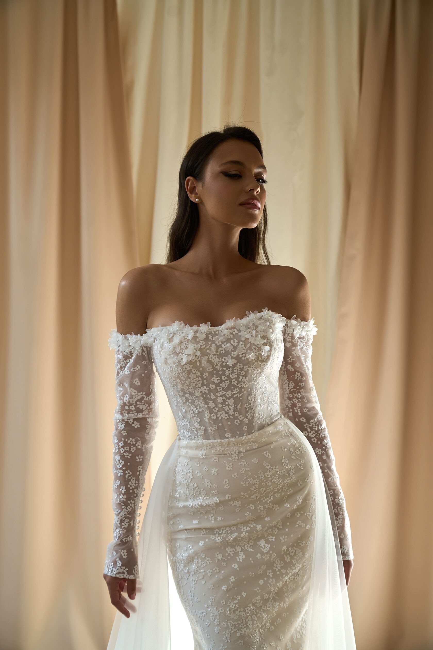 Потрясающее свадебное платье, силуэта рыбка с рукавами, приоткрытой спиной, обладающее собственным характером. Яркой деталью этой модели является шикарный вырез в зоне декольте, вытягивающий силуэт. Открытые плечи и длинные рукава создают притягательное ощущение контраста. Длинная облегающая юбка, выгодно демонстрирующая фигуру, оснащена эффектным глубоким вырезом.