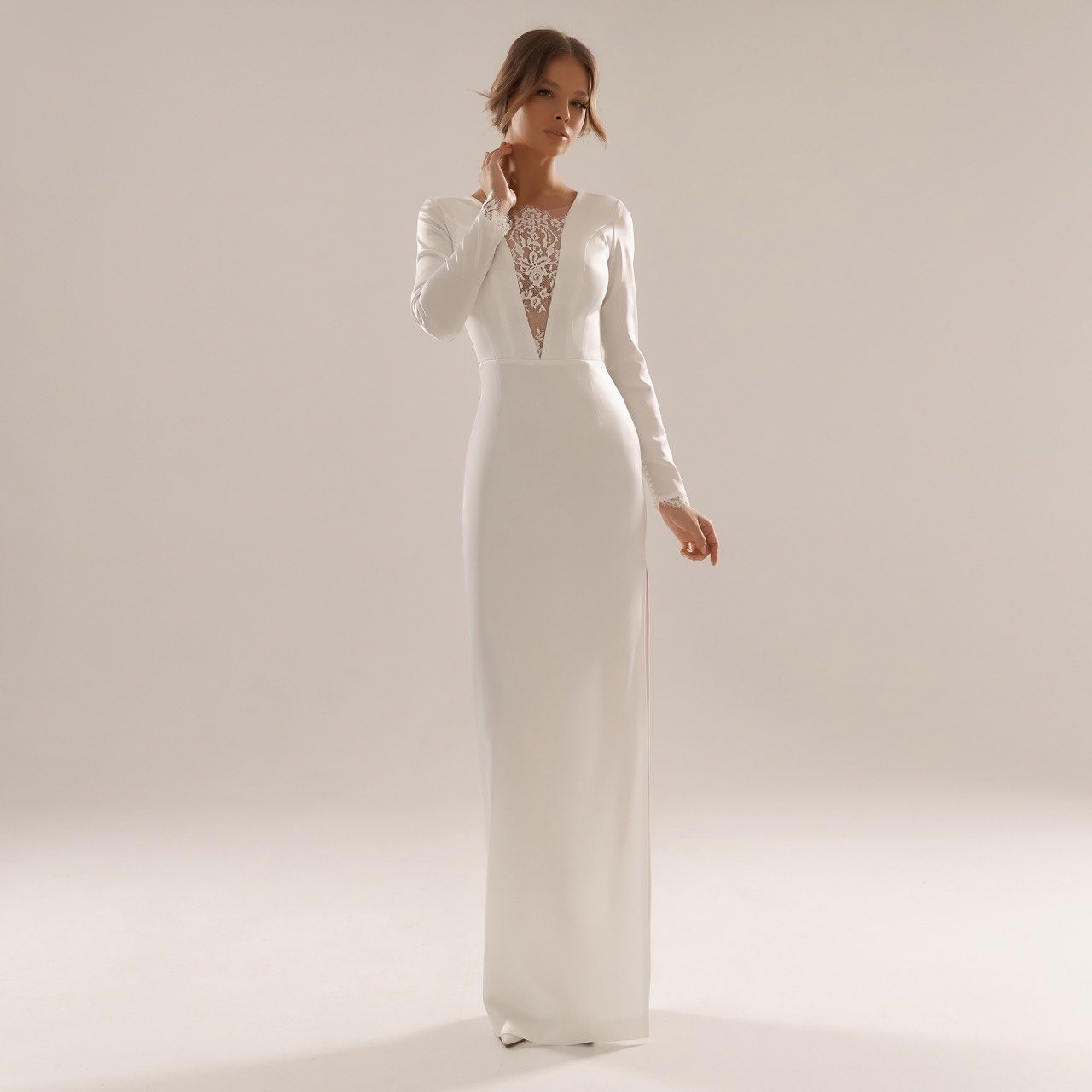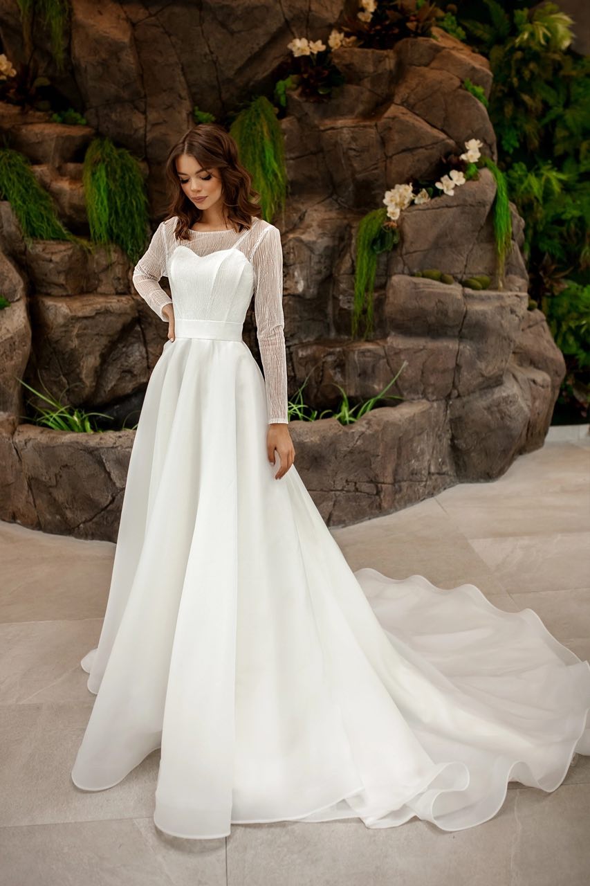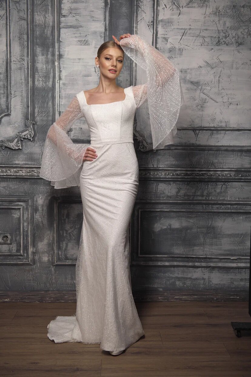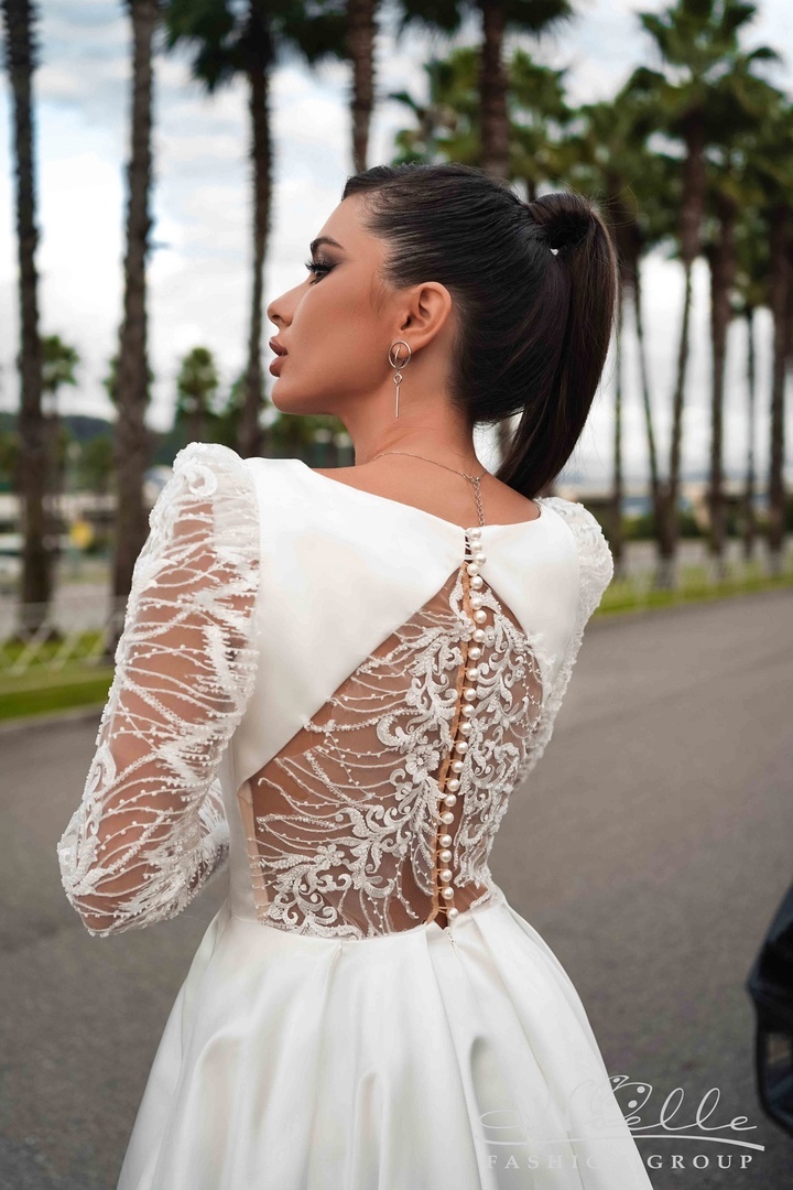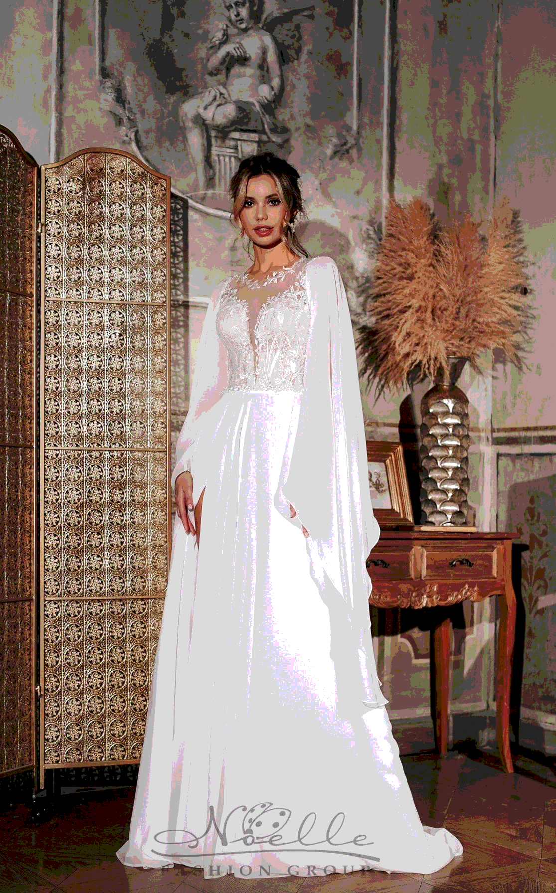 Потрясающее свадебное платье, силуэта рыбка с рукавами, приоткрытой спиной, обладающее собственным характером. Яркой деталью этой модели является шикарный вырез в зоне декольте, вытягивающий силуэт. Открытые плечи и длинные рукава создают притягательное ощущение контраста. Длинная облегающая юбка, выгодно демонстрирующая фигуру, оснащена эффектным глубоким вырезом.