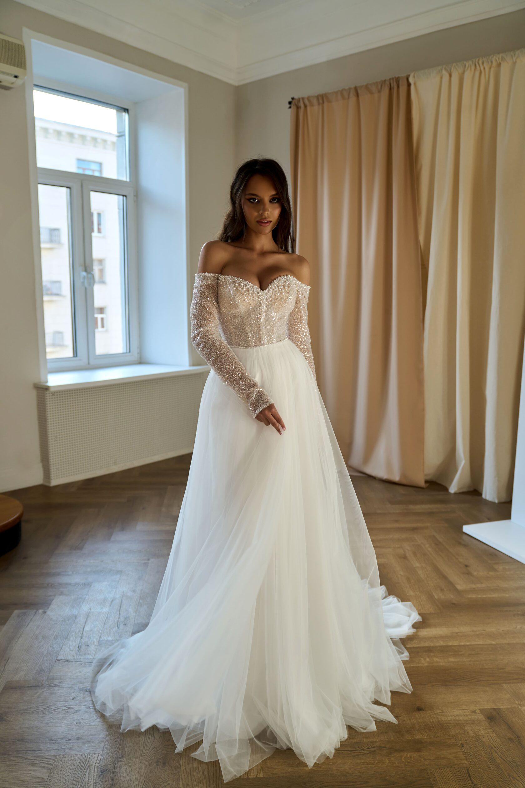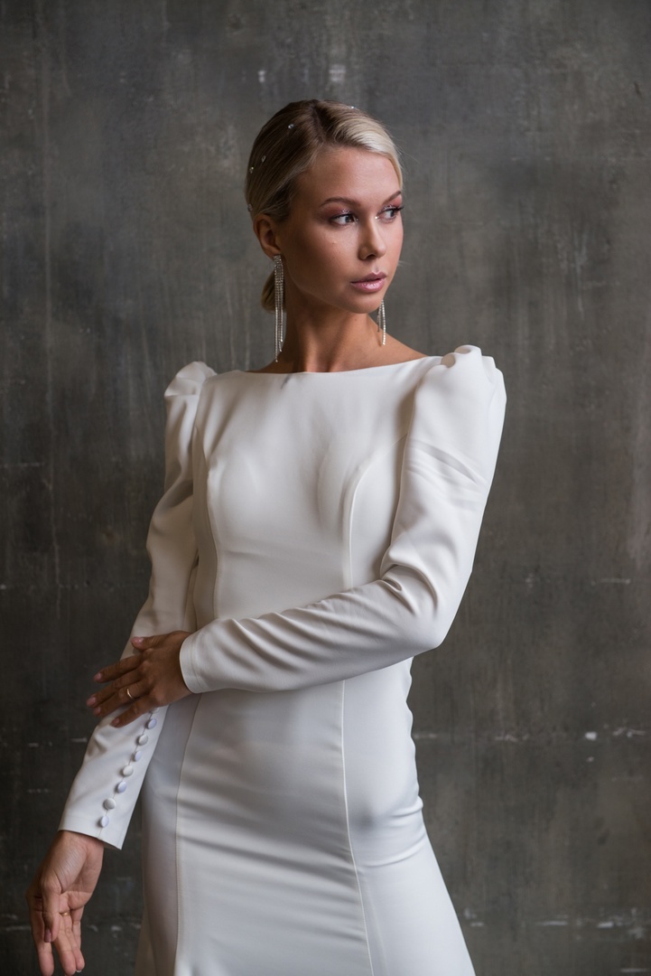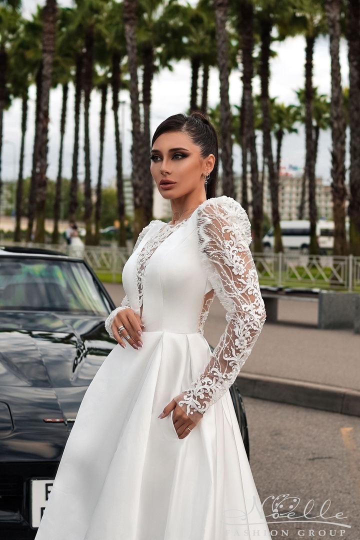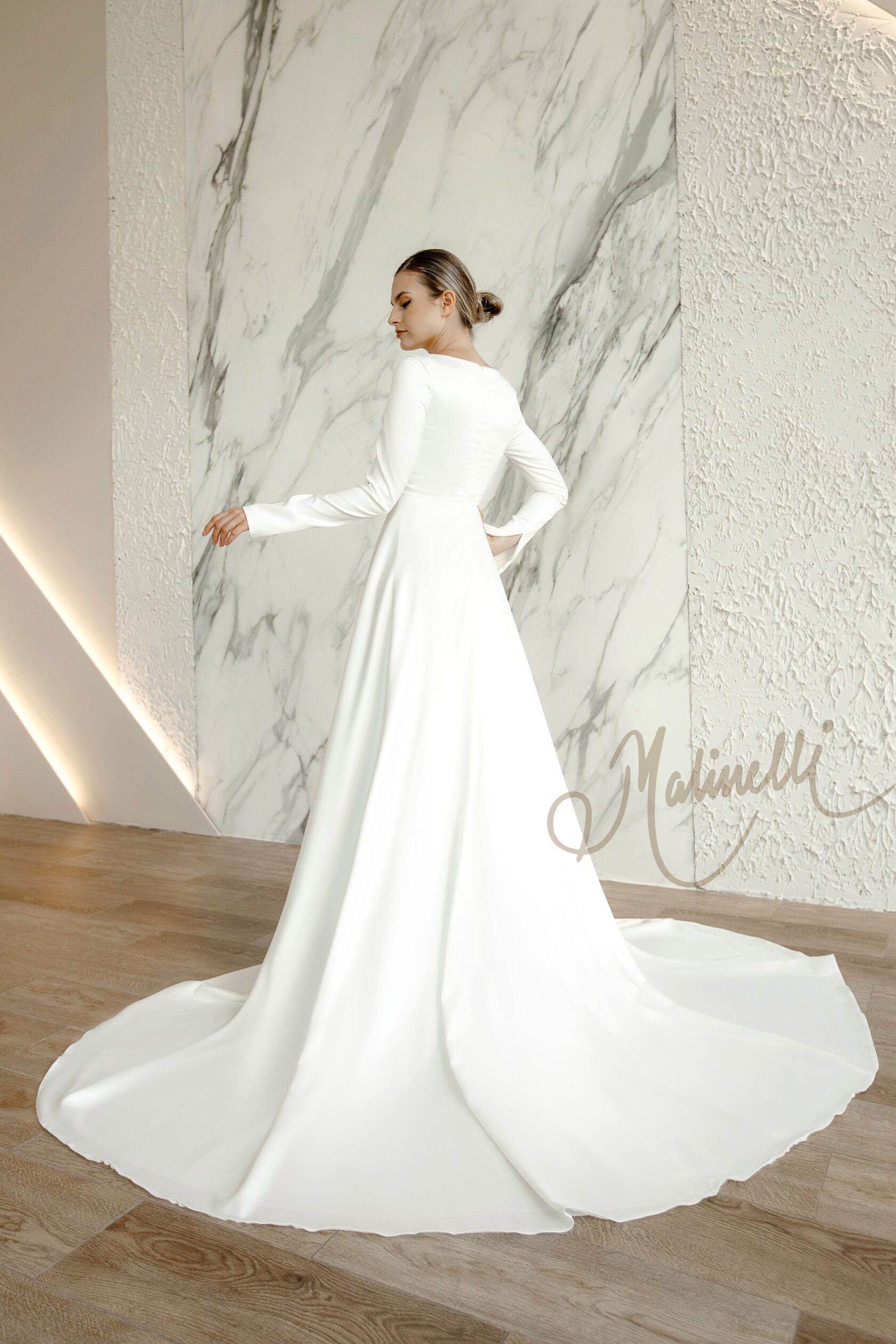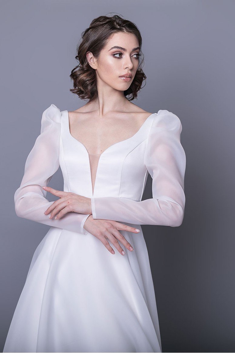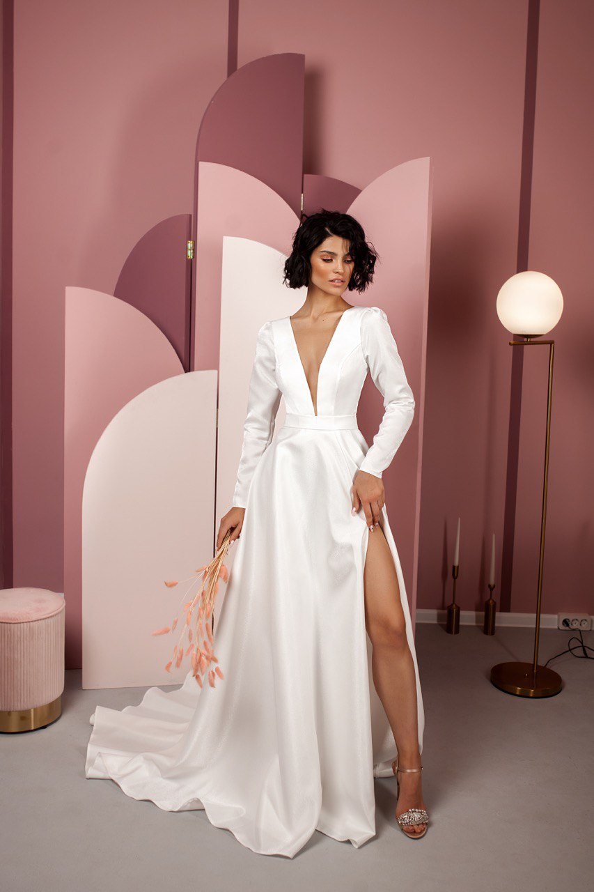 Потрясающее свадебное платье, силуэта рыбка с рукавами, приоткрытой спиной, обладающее собственным характером. Яркой деталью этой модели является шикарный вырез в зоне декольте, вытягивающий силуэт. Открытые плечи и длинные рукава создают притягательное ощущение контраста. Длинная облегающая юбка, выгодно демонстрирующая фигуру, оснащена эффектным глубоким вырезом.