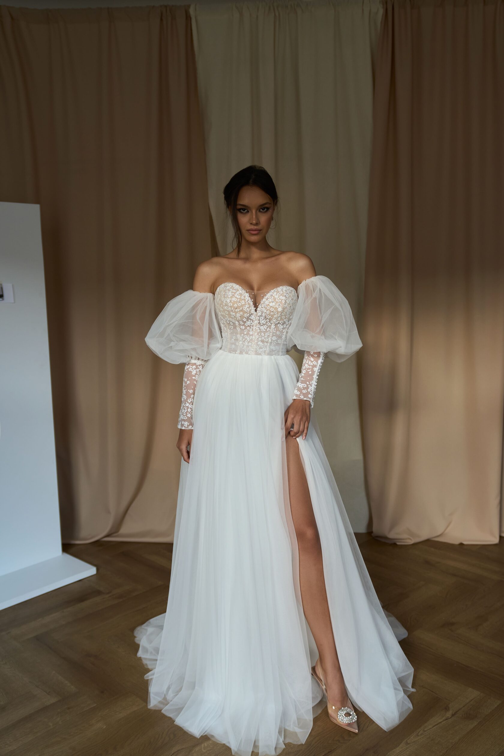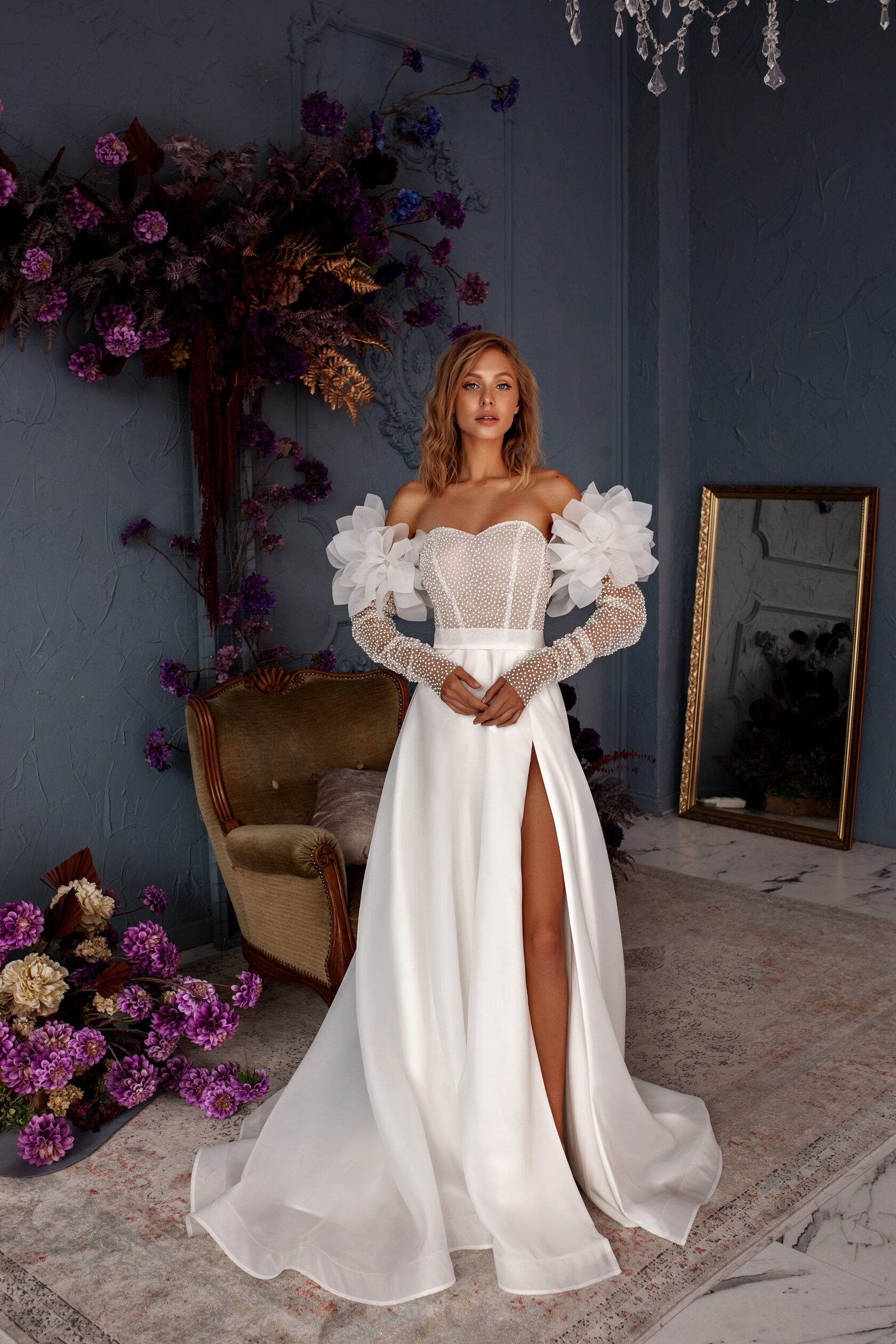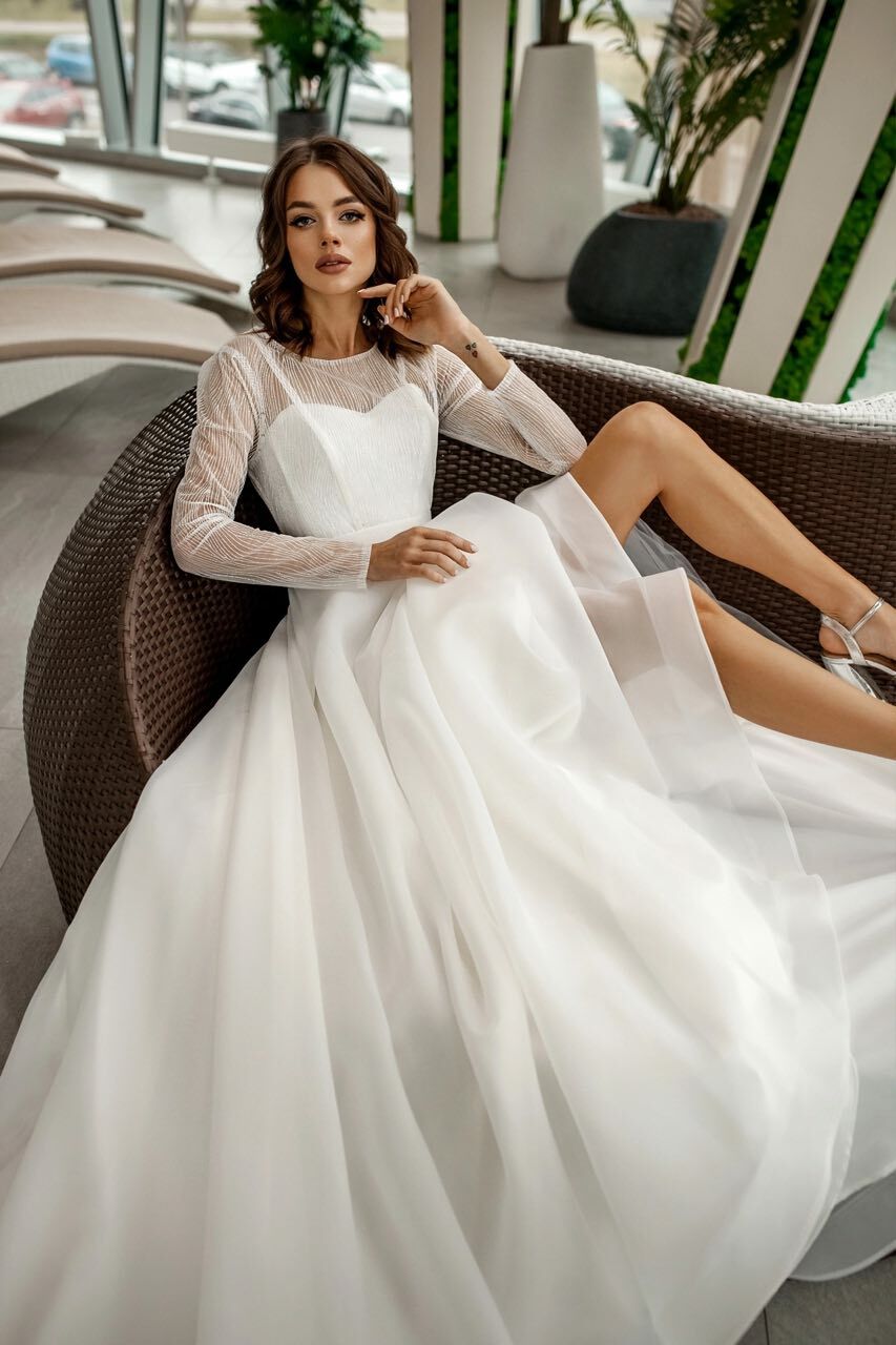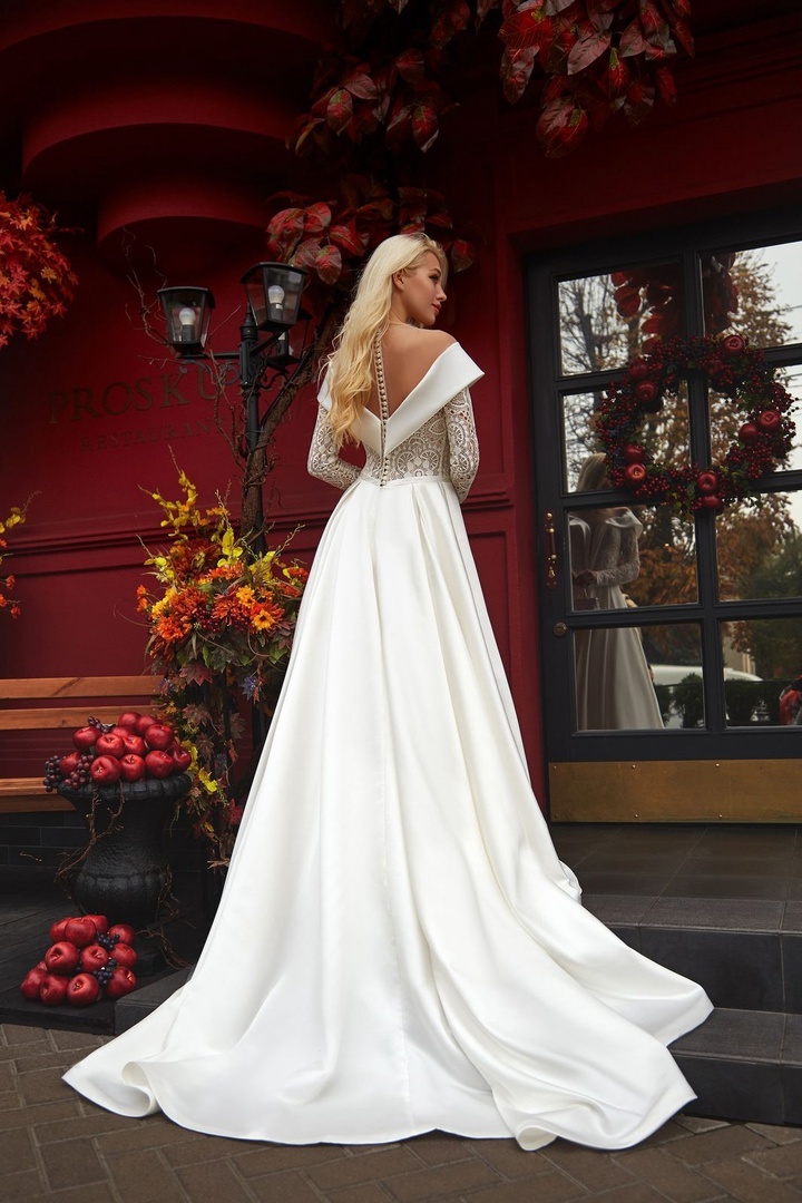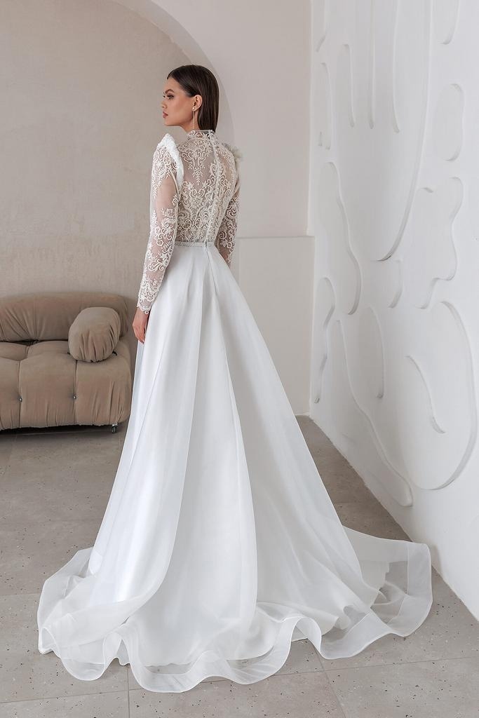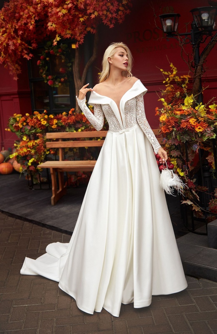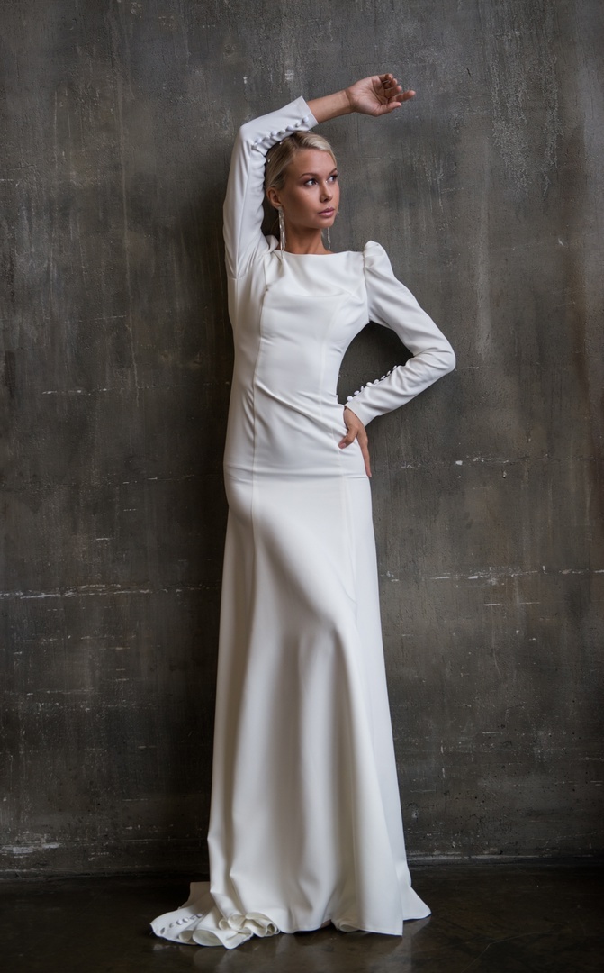 Потрясающее свадебное платье, силуэта рыбка с рукавами, приоткрытой спиной, обладающее собственным характером. Яркой деталью этой модели является шикарный вырез в зоне декольте, вытягивающий силуэт. Открытые плечи и длинные рукава создают притягательное ощущение контраста. Длинная облегающая юбка, выгодно демонстрирующая фигуру, оснащена эффектным глубоким вырезом.