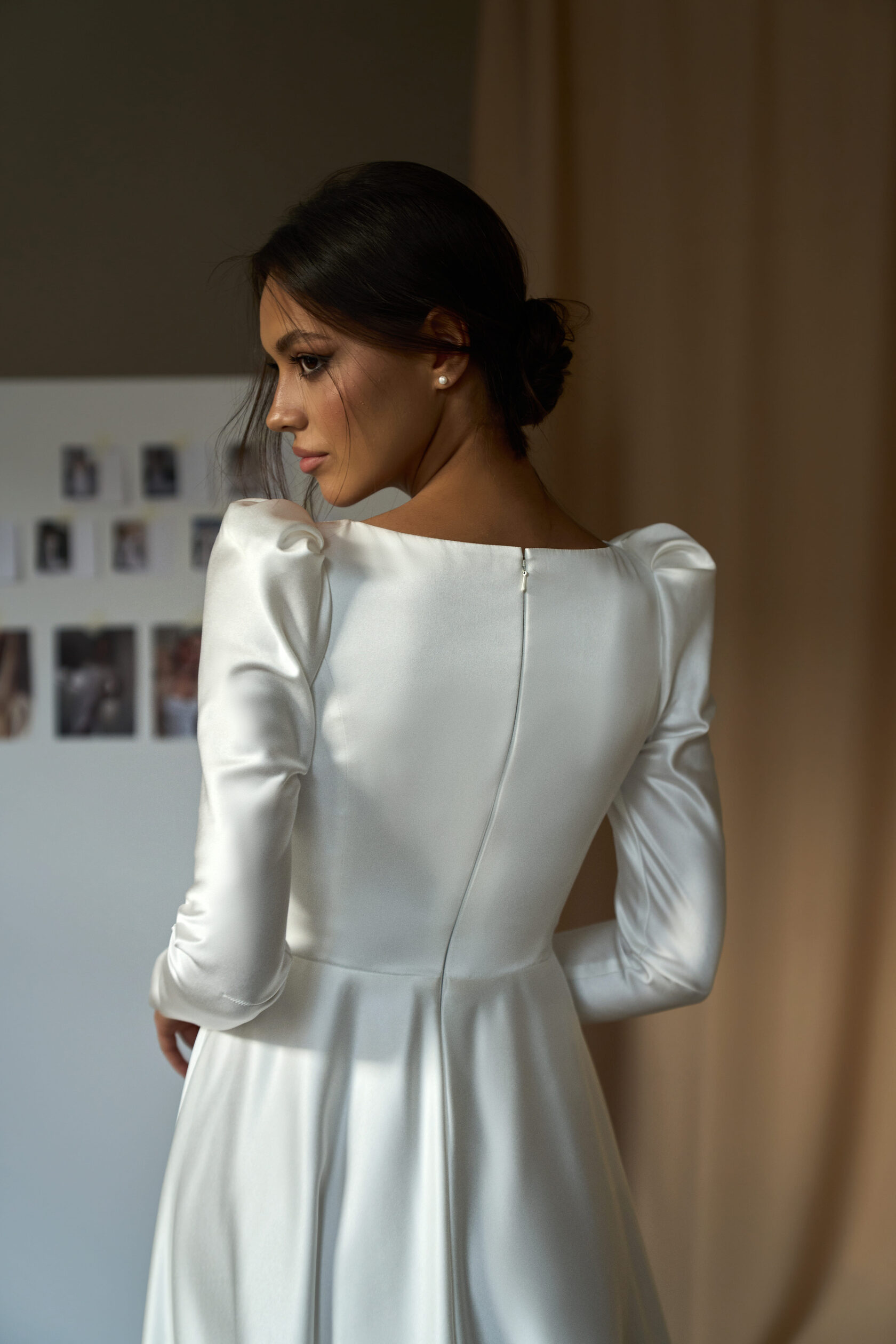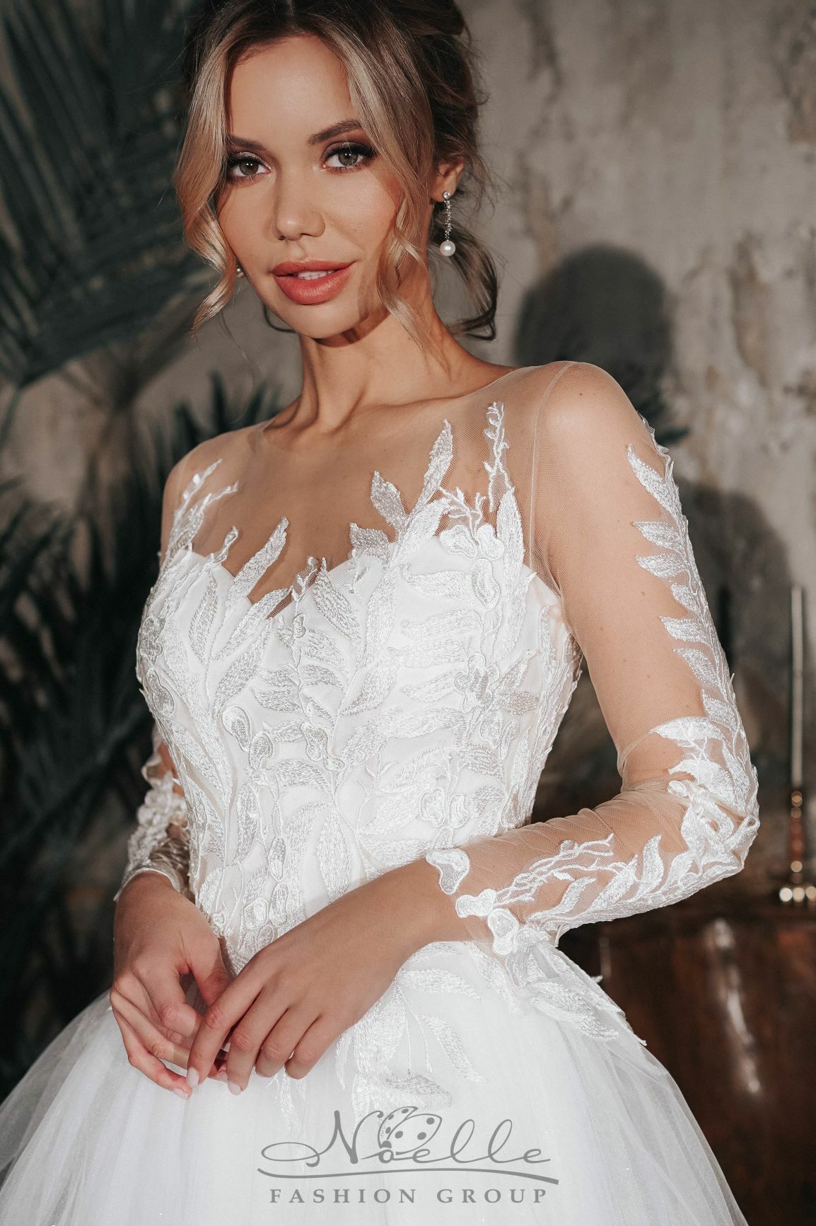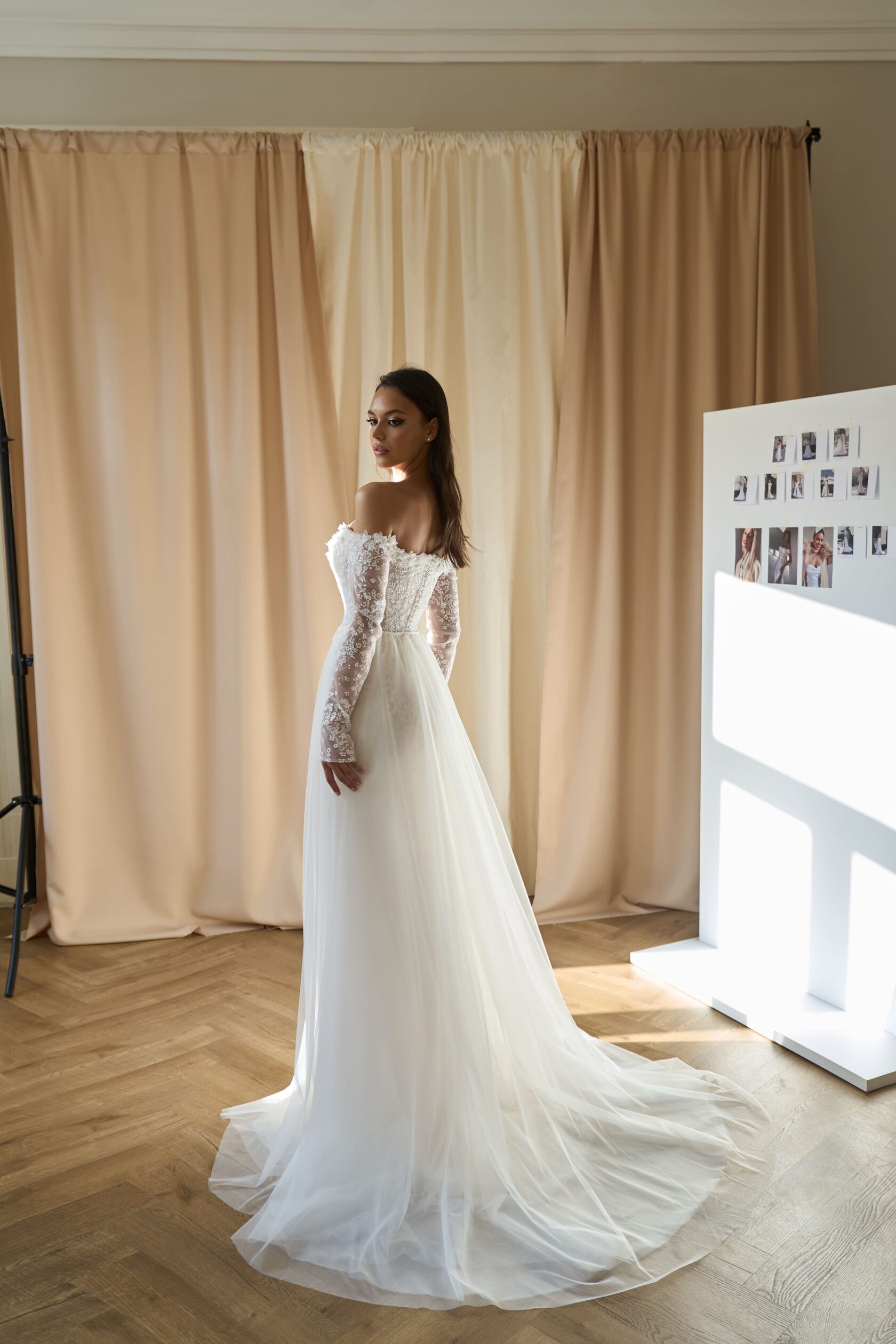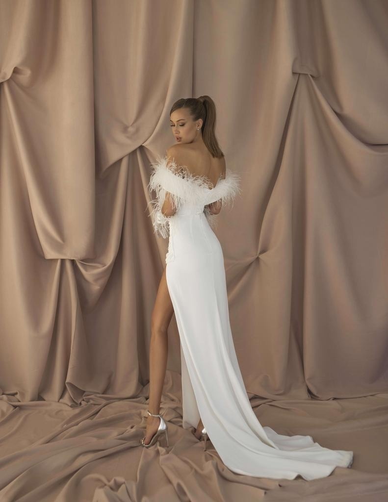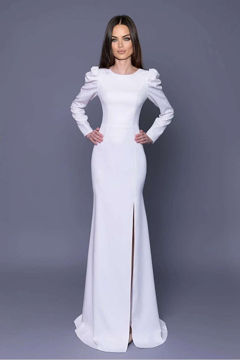 Потрясающее свадебное платье, силуэта рыбка с рукавами, приоткрытой спиной, обладающее собственным характером. Яркой деталью этой модели является шикарный вырез в зоне декольте, вытягивающий силуэт. Открытые плечи и длинные рукава создают притягательное ощущение контраста. Длинная облегающая юбка, выгодно демонстрирующая фигуру, оснащена эффектным глубоким вырезом.