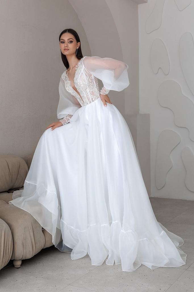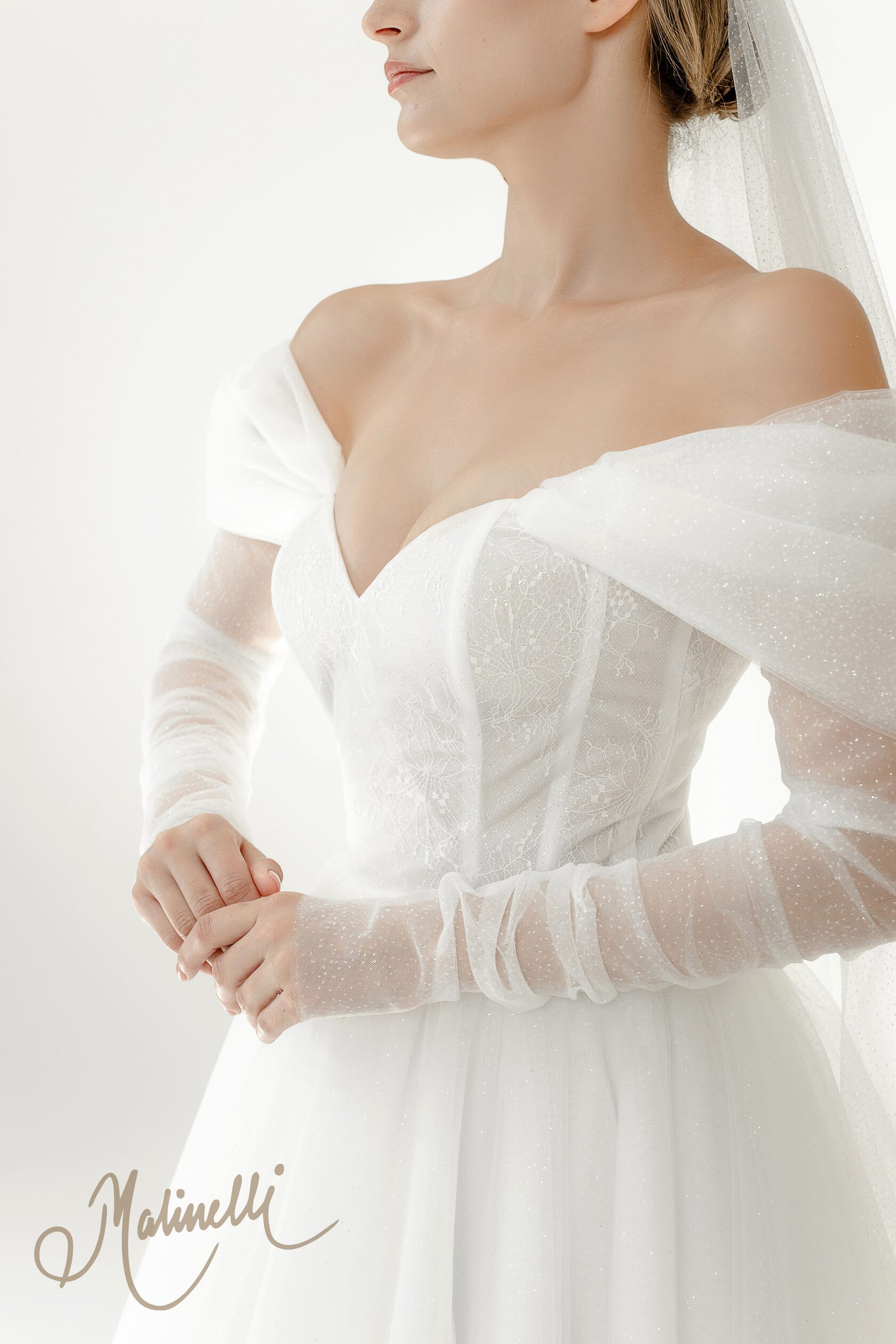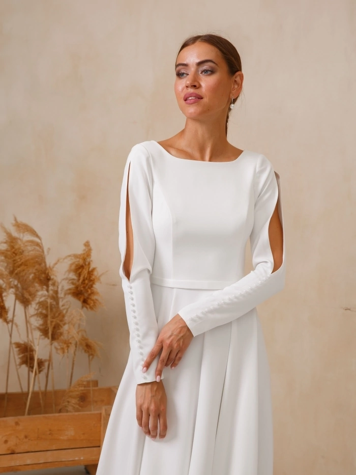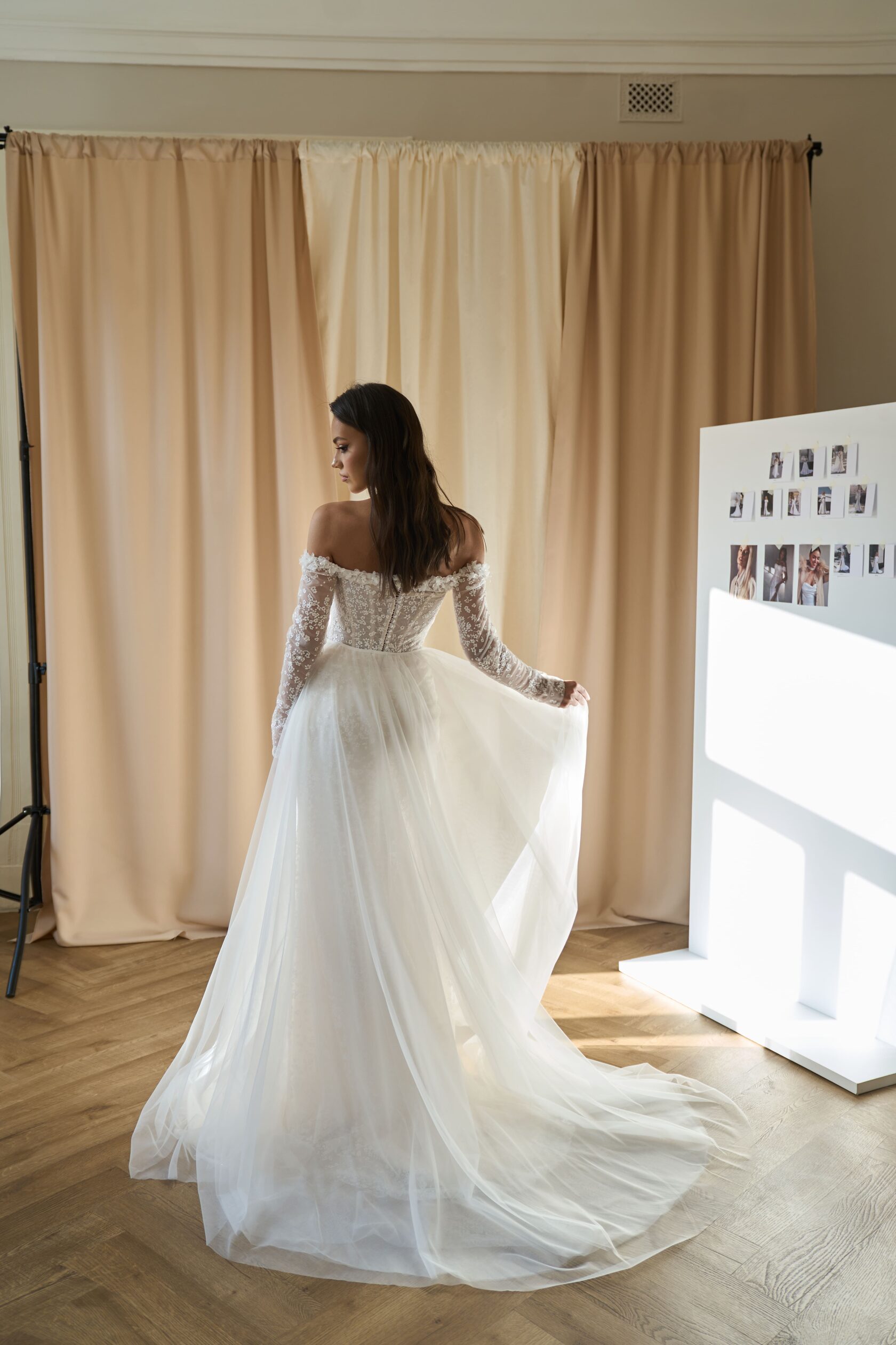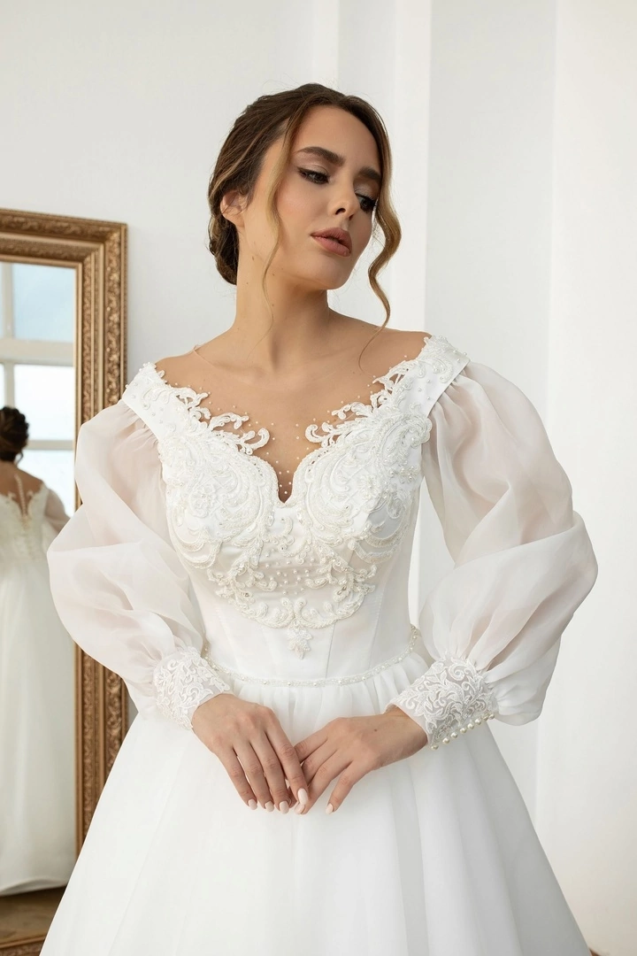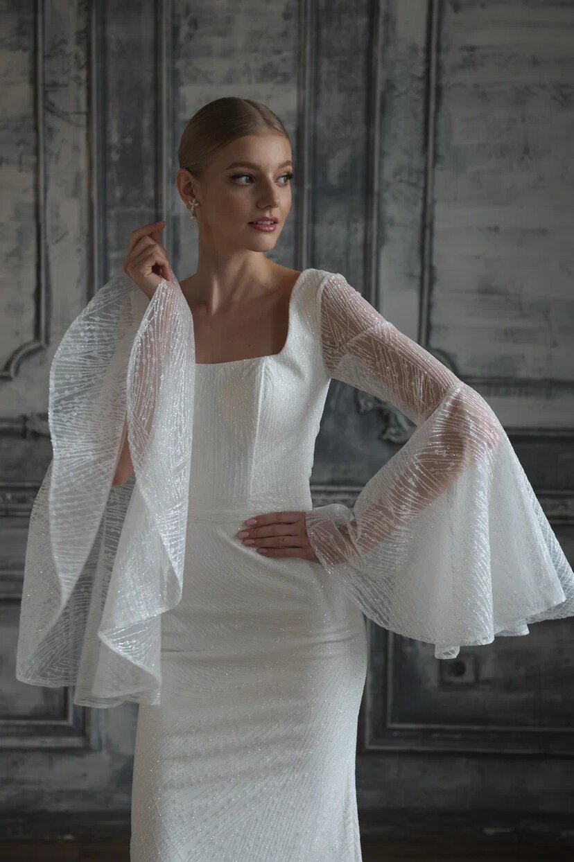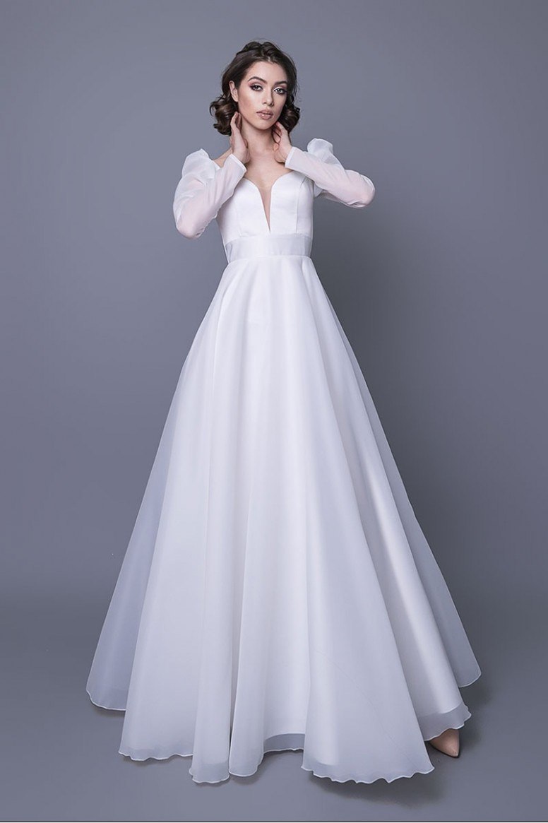 Потрясающее свадебное платье, силуэта рыбка с рукавами, приоткрытой спиной, обладающее собственным характером. Яркой деталью этой модели является шикарный вырез в зоне декольте, вытягивающий силуэт. Открытые плечи и длинные рукава создают притягательное ощущение контраста. Длинная облегающая юбка, выгодно демонстрирующая фигуру, оснащена эффектным глубоким вырезом.