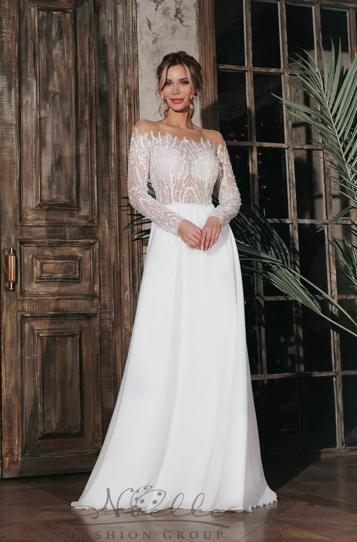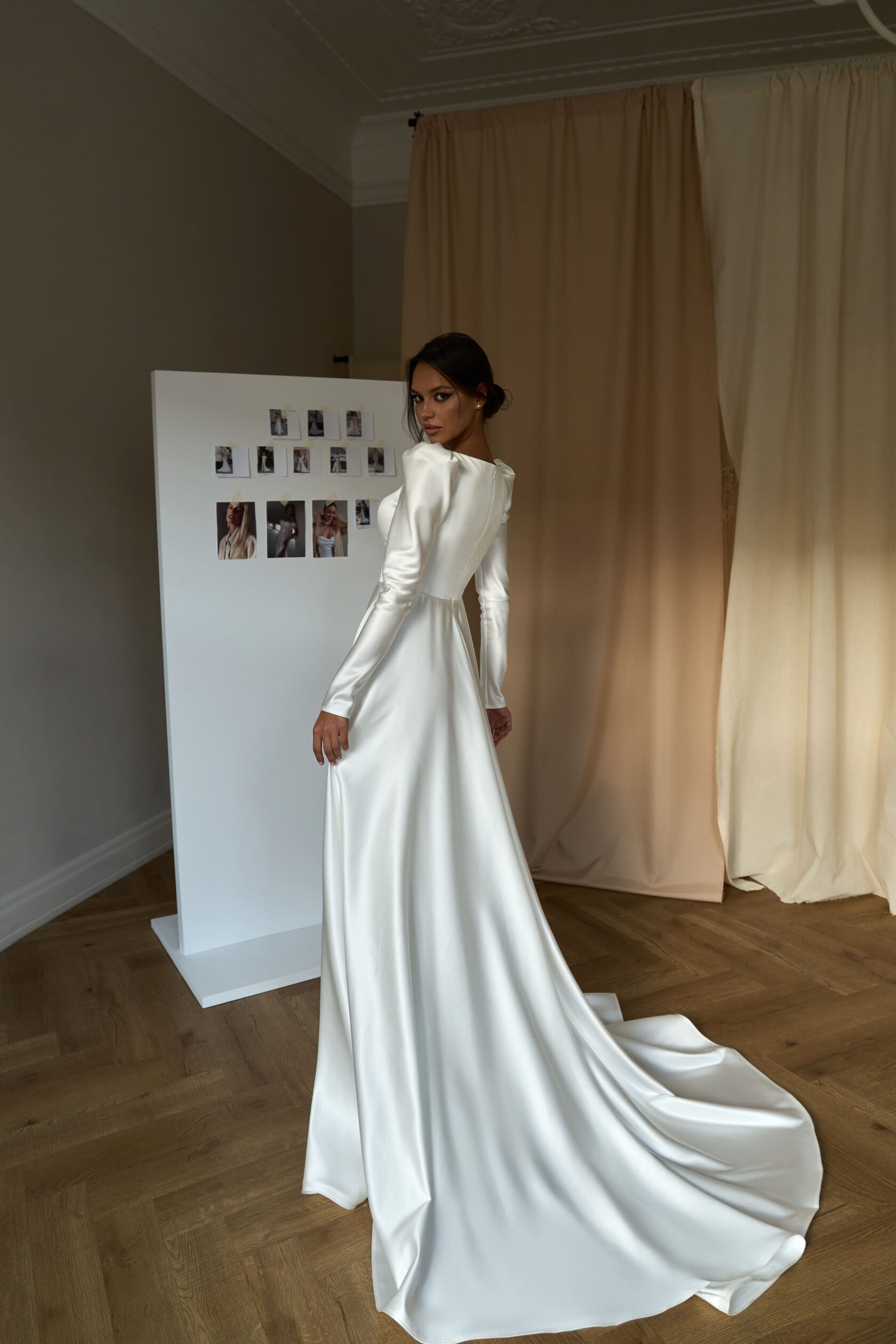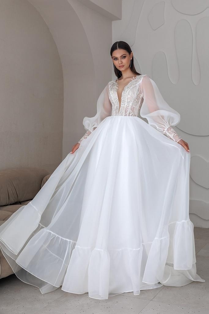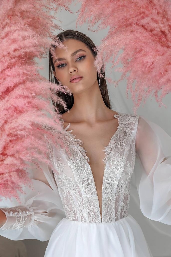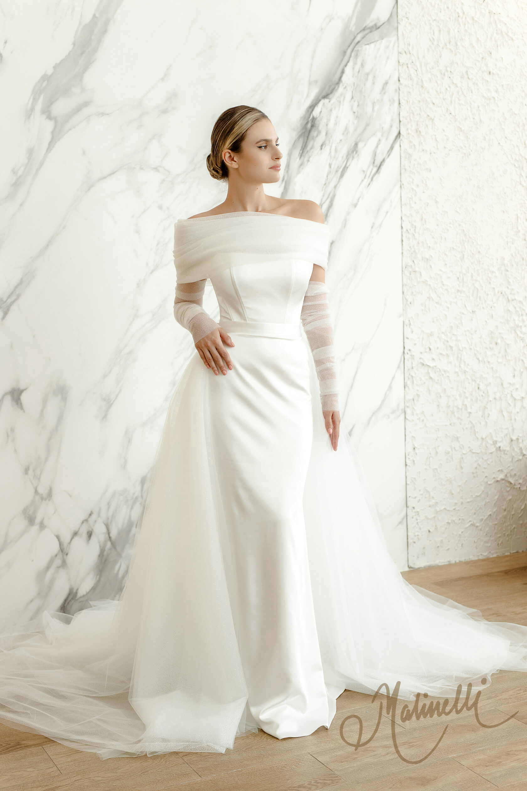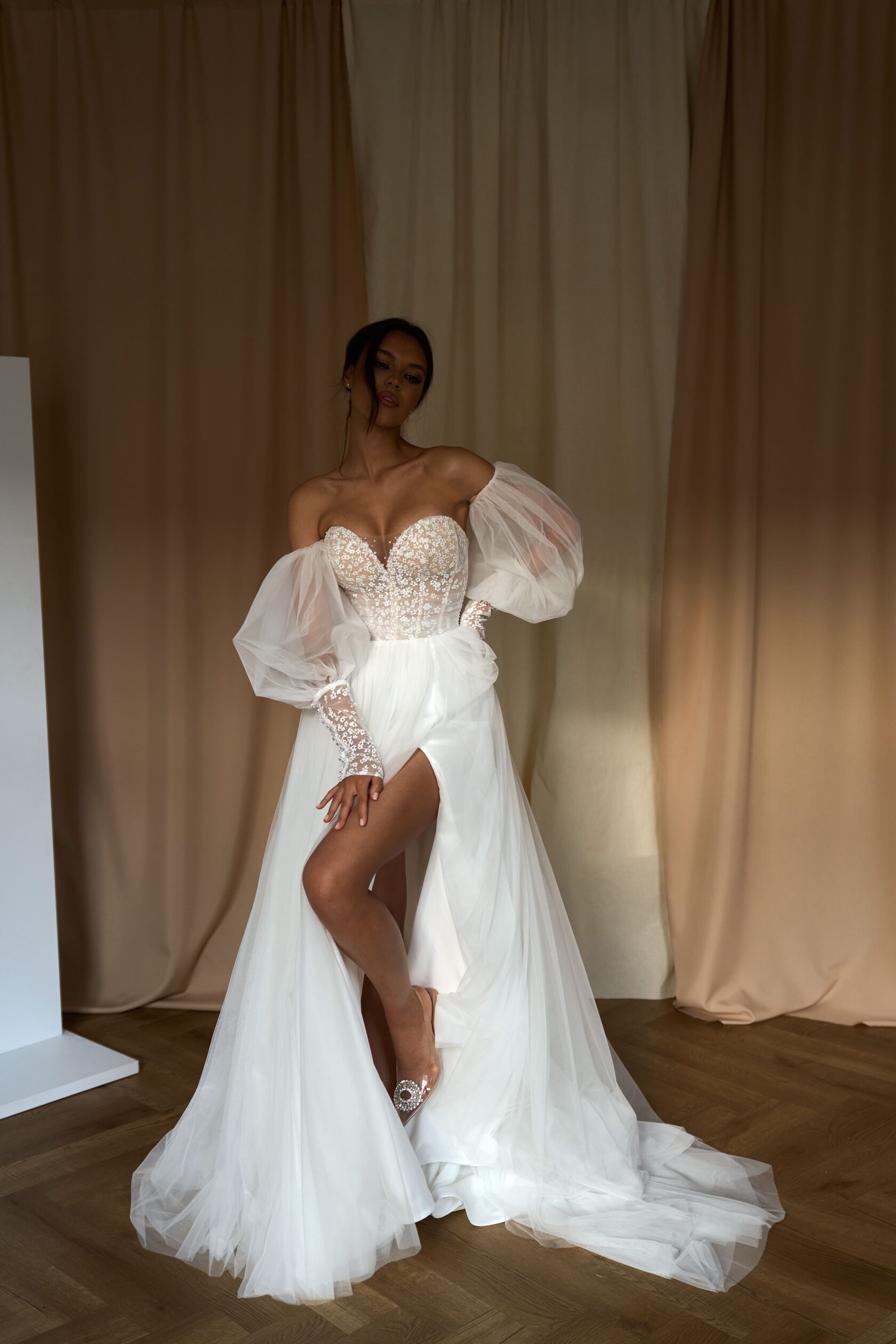 Потрясающее свадебное платье, силуэта рыбка с рукавами, приоткрытой спиной, обладающее собственным характером. Яркой деталью этой модели является шикарный вырез в зоне декольте, вытягивающий силуэт. Открытые плечи и длинные рукава создают притягательное ощущение контраста. Длинная облегающая юбка, выгодно демонстрирующая фигуру, оснащена эффектным глубоким вырезом.