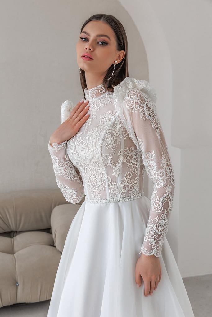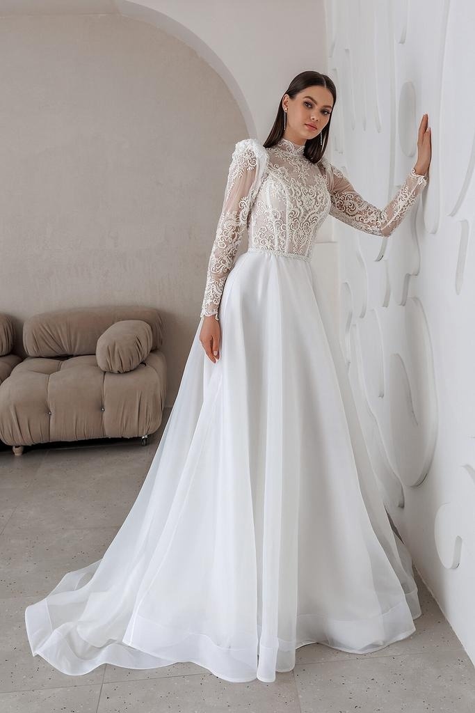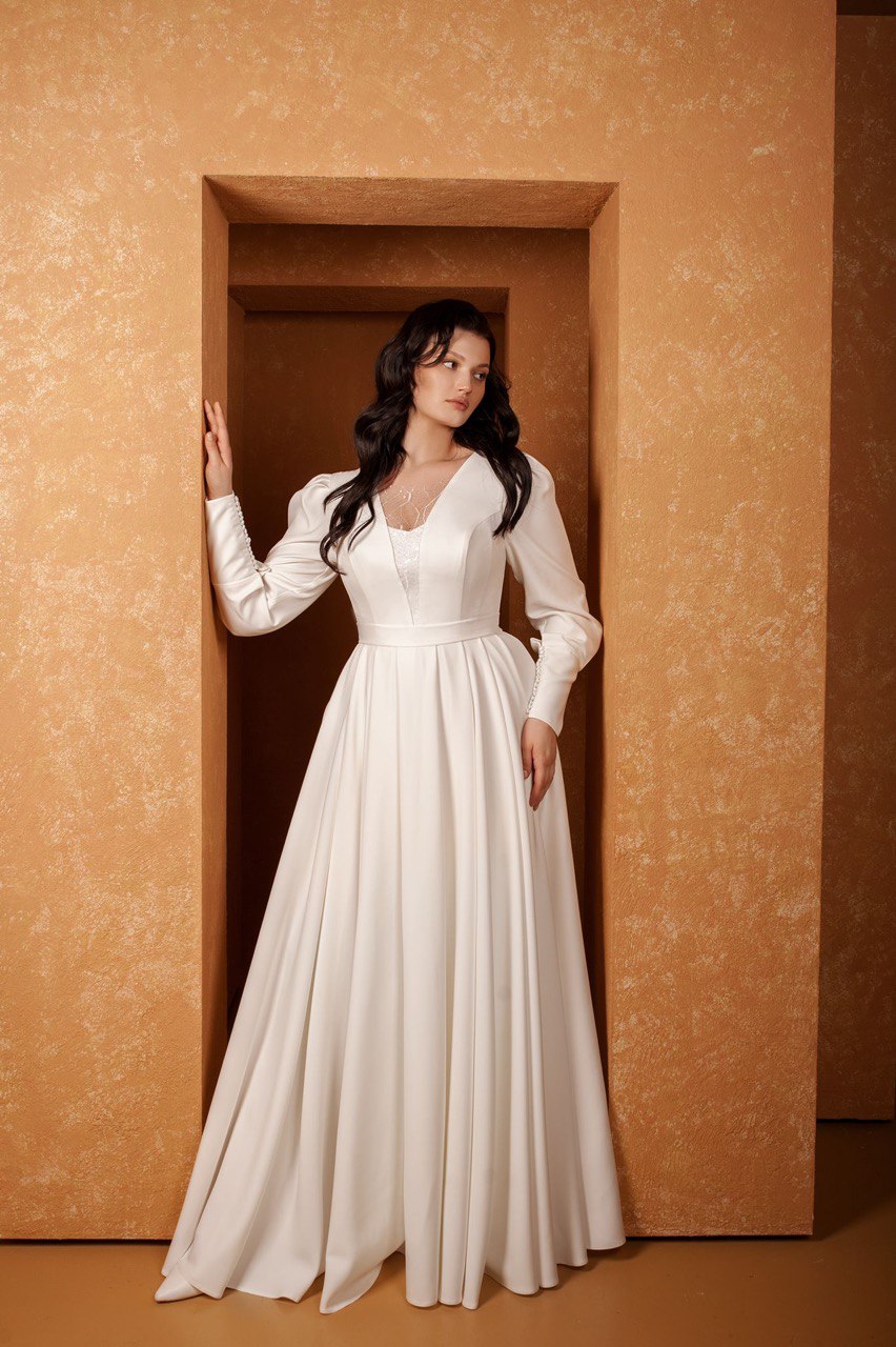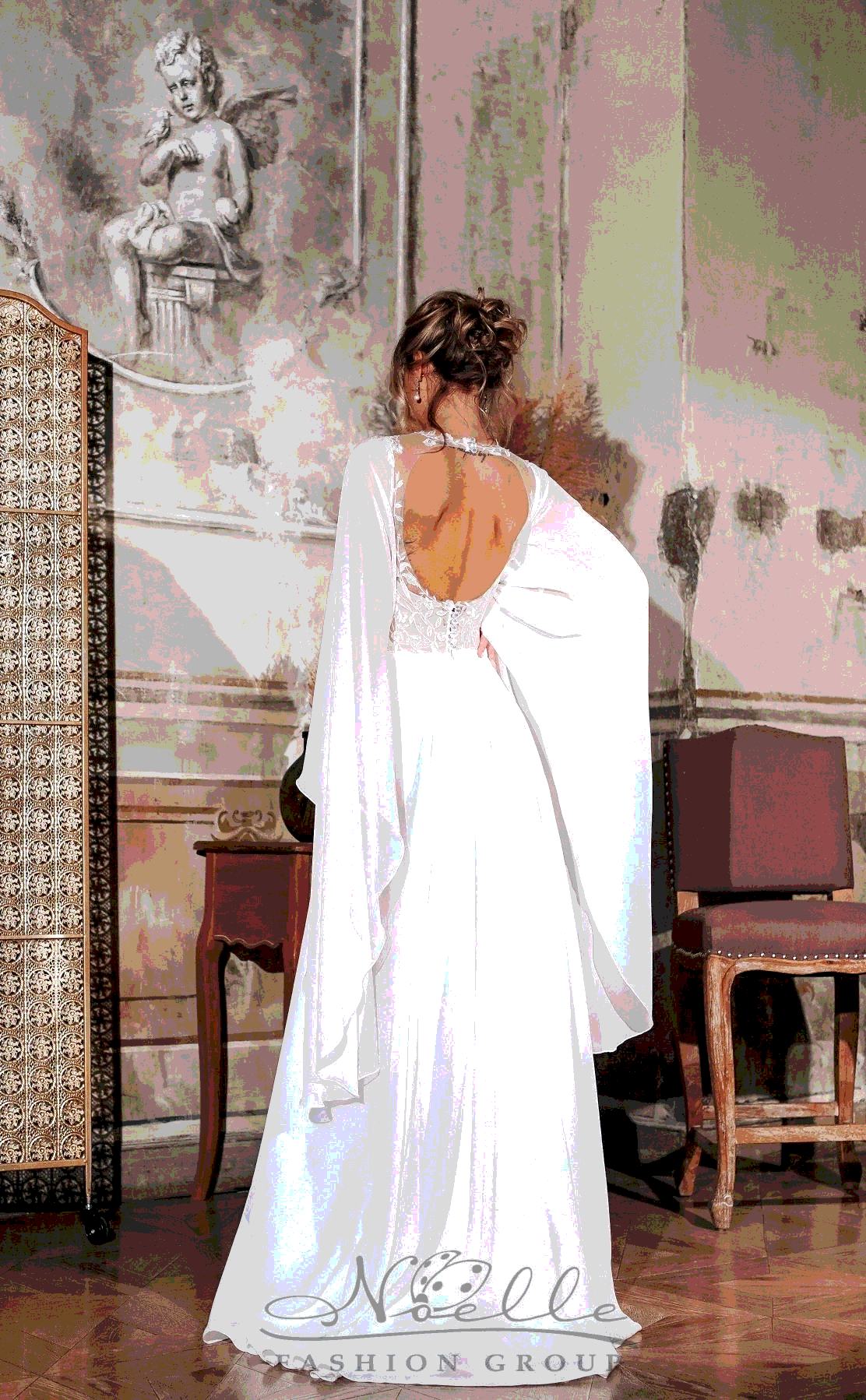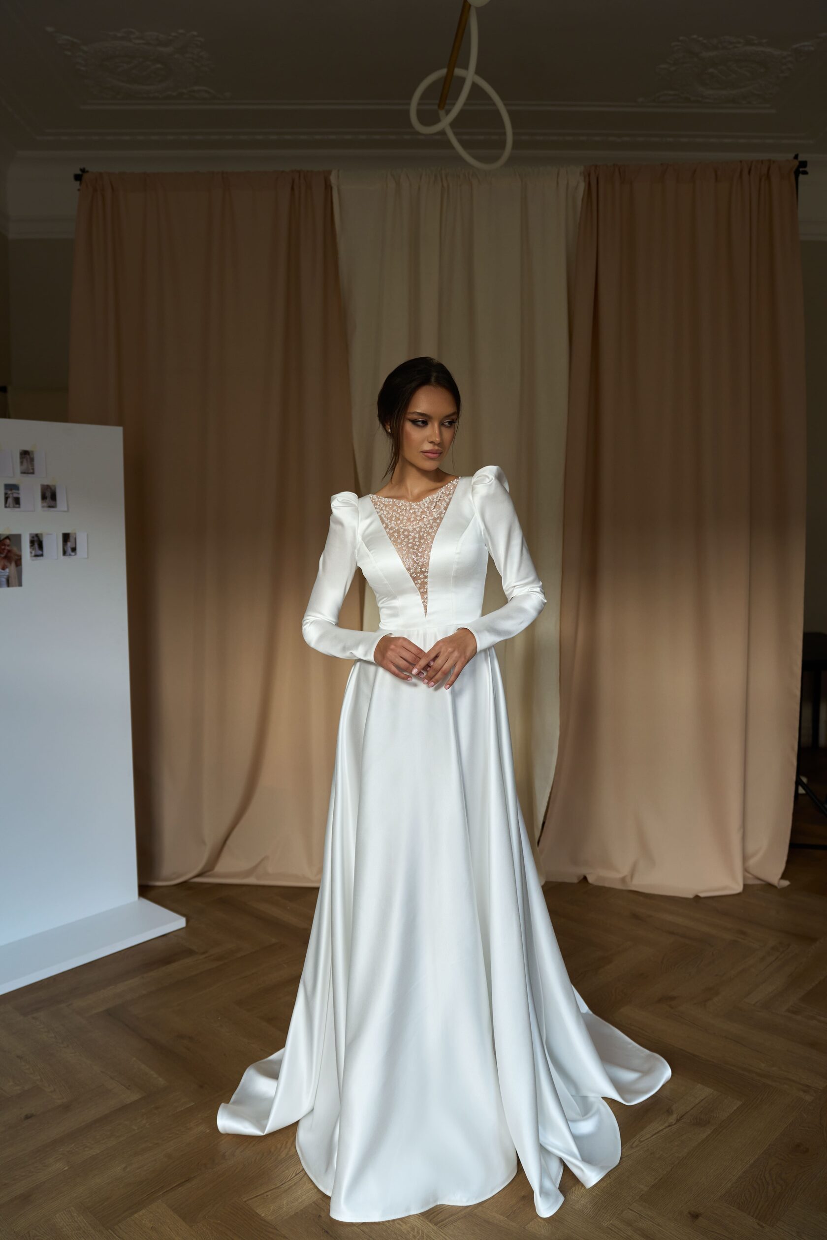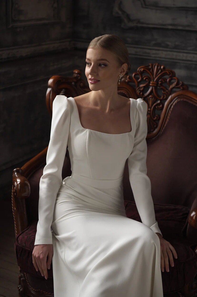 Потрясающее свадебное платье, силуэта рыбка с рукавами, приоткрытой спиной, обладающее собственным характером. Яркой деталью этой модели является шикарный вырез в зоне декольте, вытягивающий силуэт. Открытые плечи и длинные рукава создают притягательное ощущение контраста. Длинная облегающая юбка, выгодно демонстрирующая фигуру, оснащена эффектным глубоким вырезом.