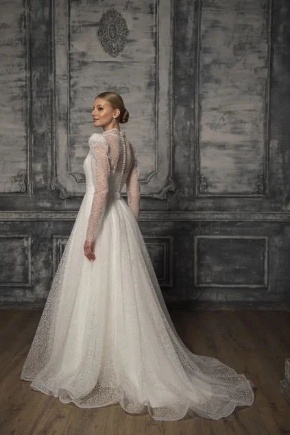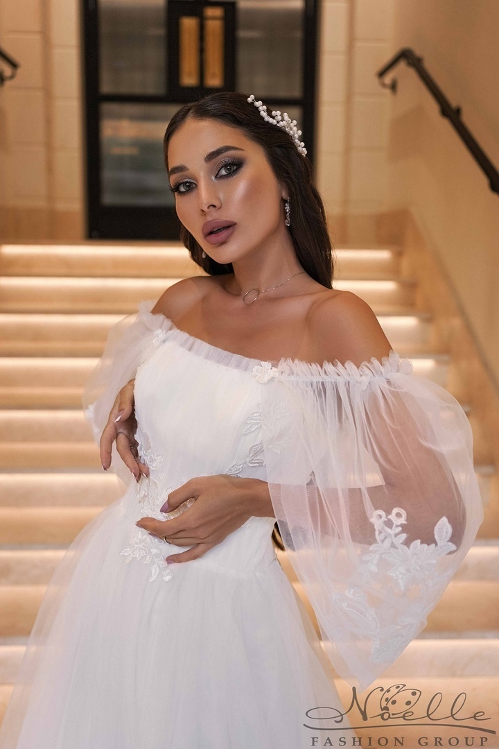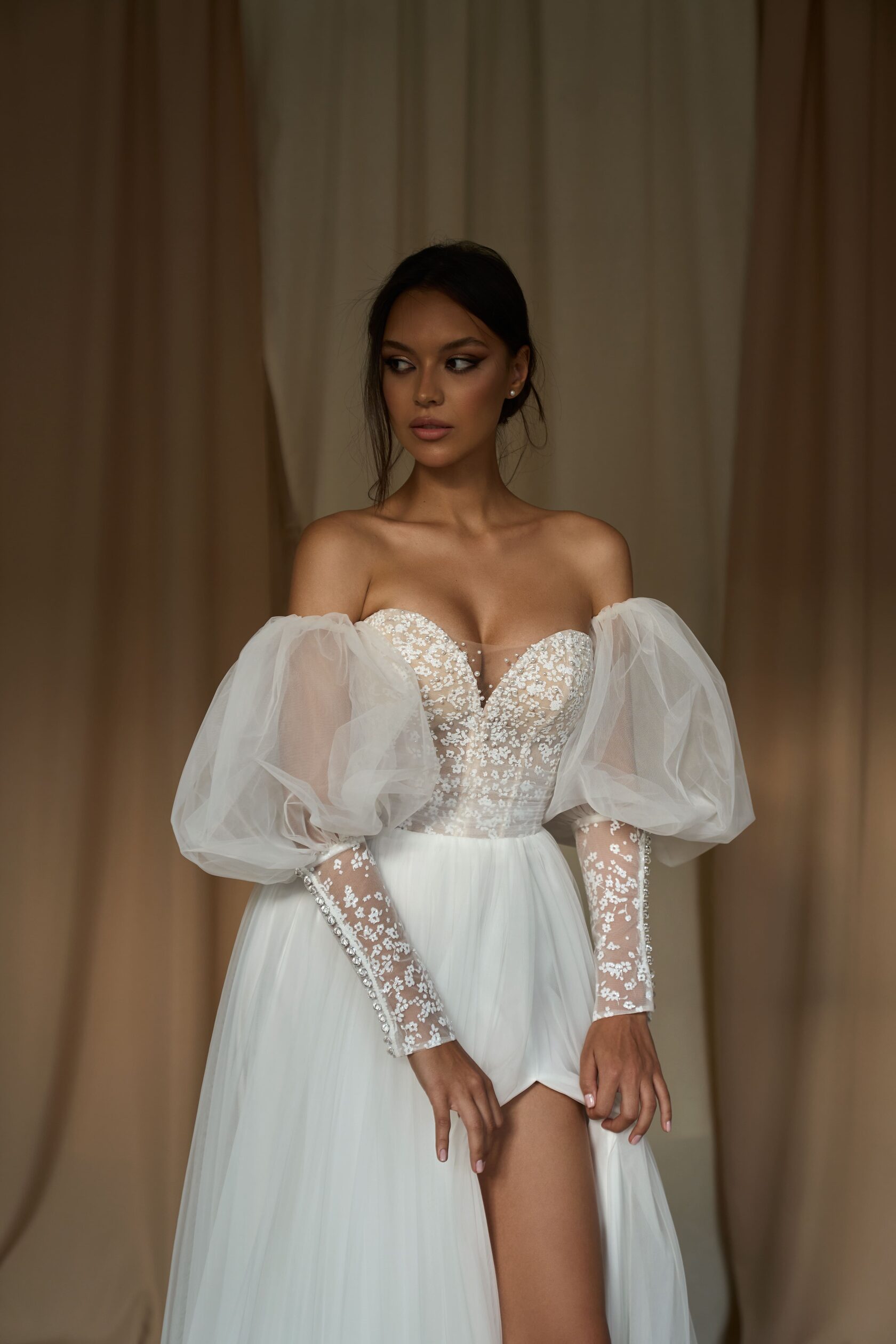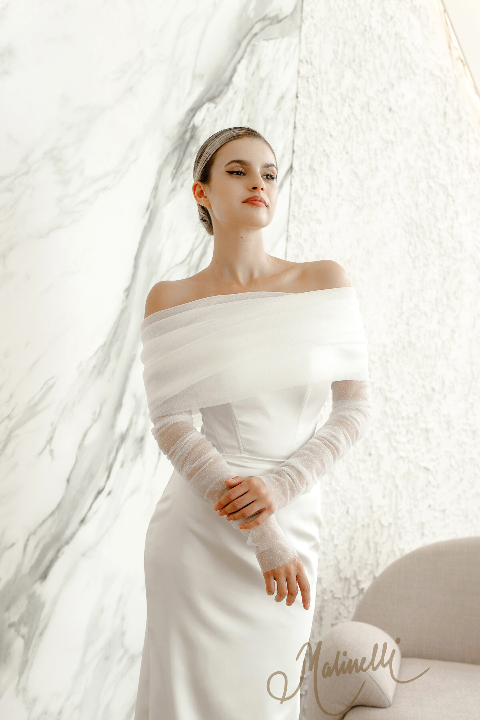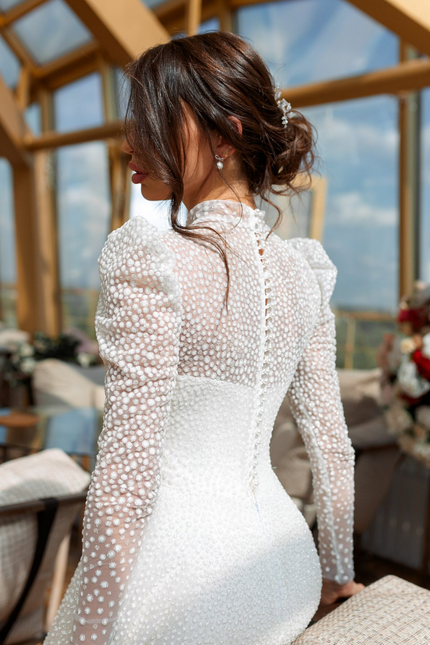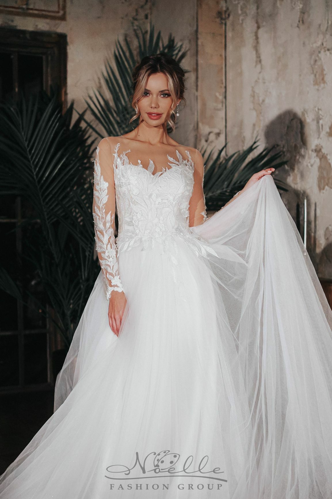 Потрясающее свадебное платье, силуэта рыбка с рукавами, приоткрытой спиной, обладающее собственным характером. Яркой деталью этой модели является шикарный вырез в зоне декольте, вытягивающий силуэт. Открытые плечи и длинные рукава создают притягательное ощущение контраста. Длинная облегающая юбка, выгодно демонстрирующая фигуру, оснащена эффектным глубоким вырезом.
