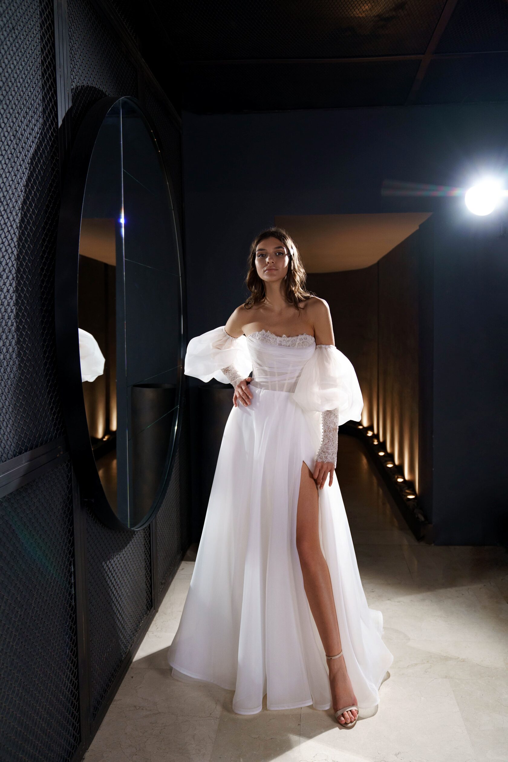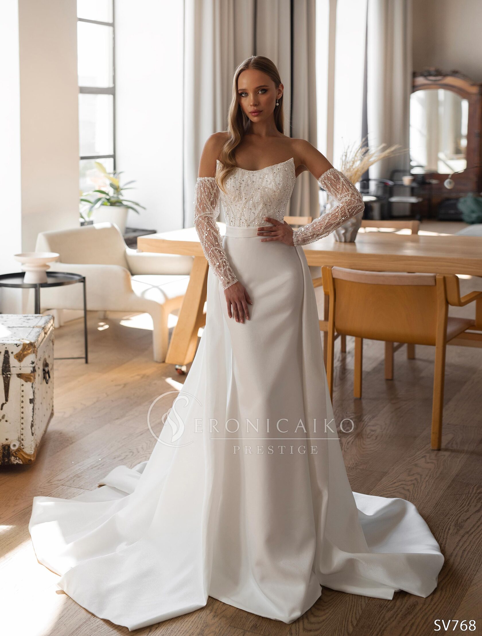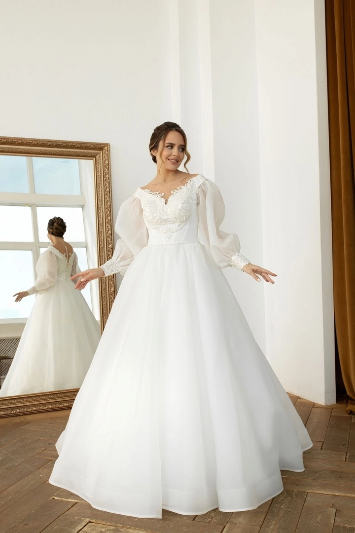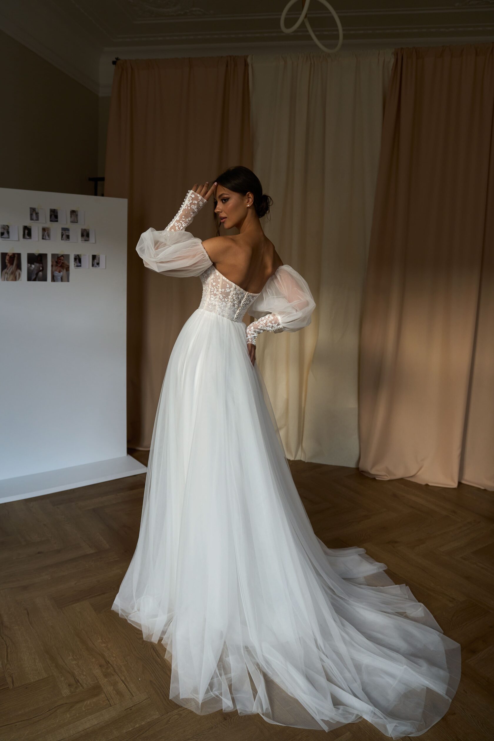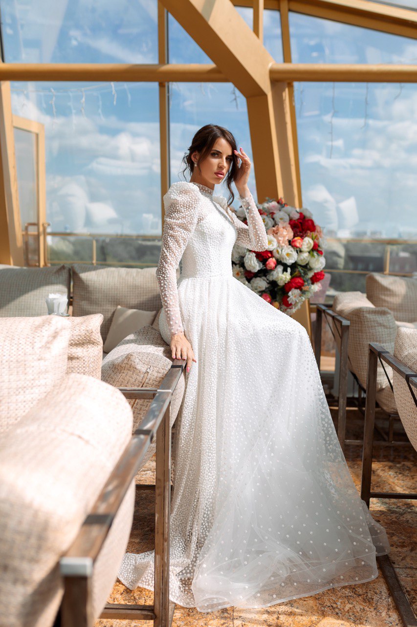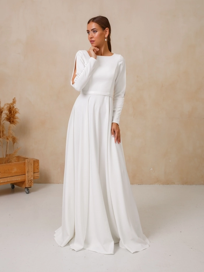Потрясающее свадебное платье, силуэта рыбка с рукавами, приоткрытой спиной, обладающее собственным характером. Яркой деталью этой модели является шикарный вырез в зоне декольте, вытягивающий силуэт. Открытые плечи и длинные рукава создают притягательное ощущение контраста. Длинная облегающая юбка, выгодно демонстрирующая фигуру, оснащена эффектным глубоким вырезом.