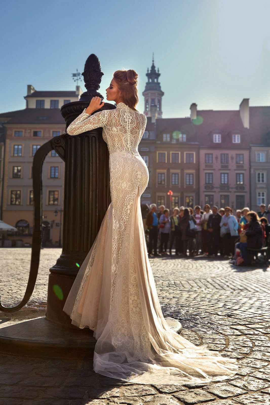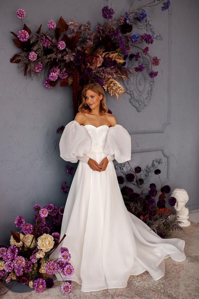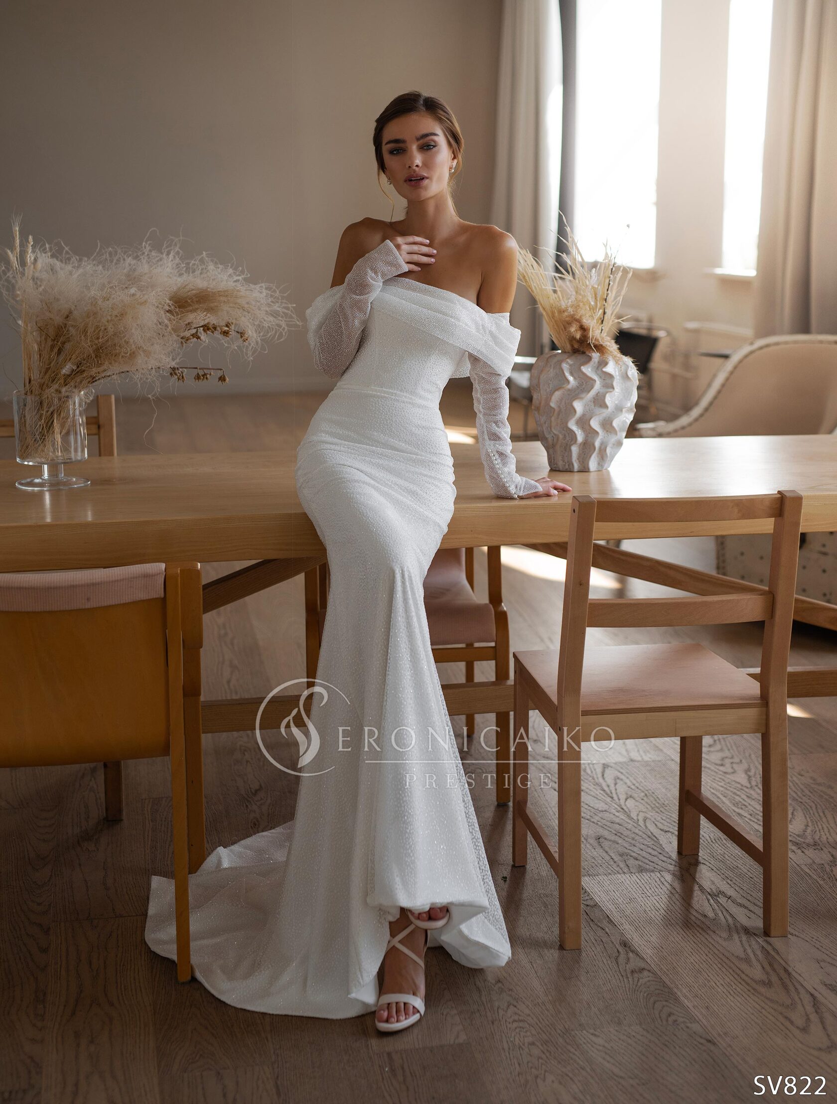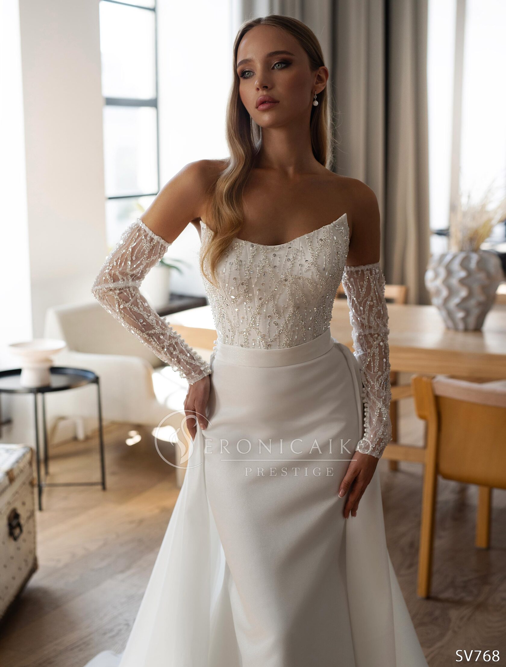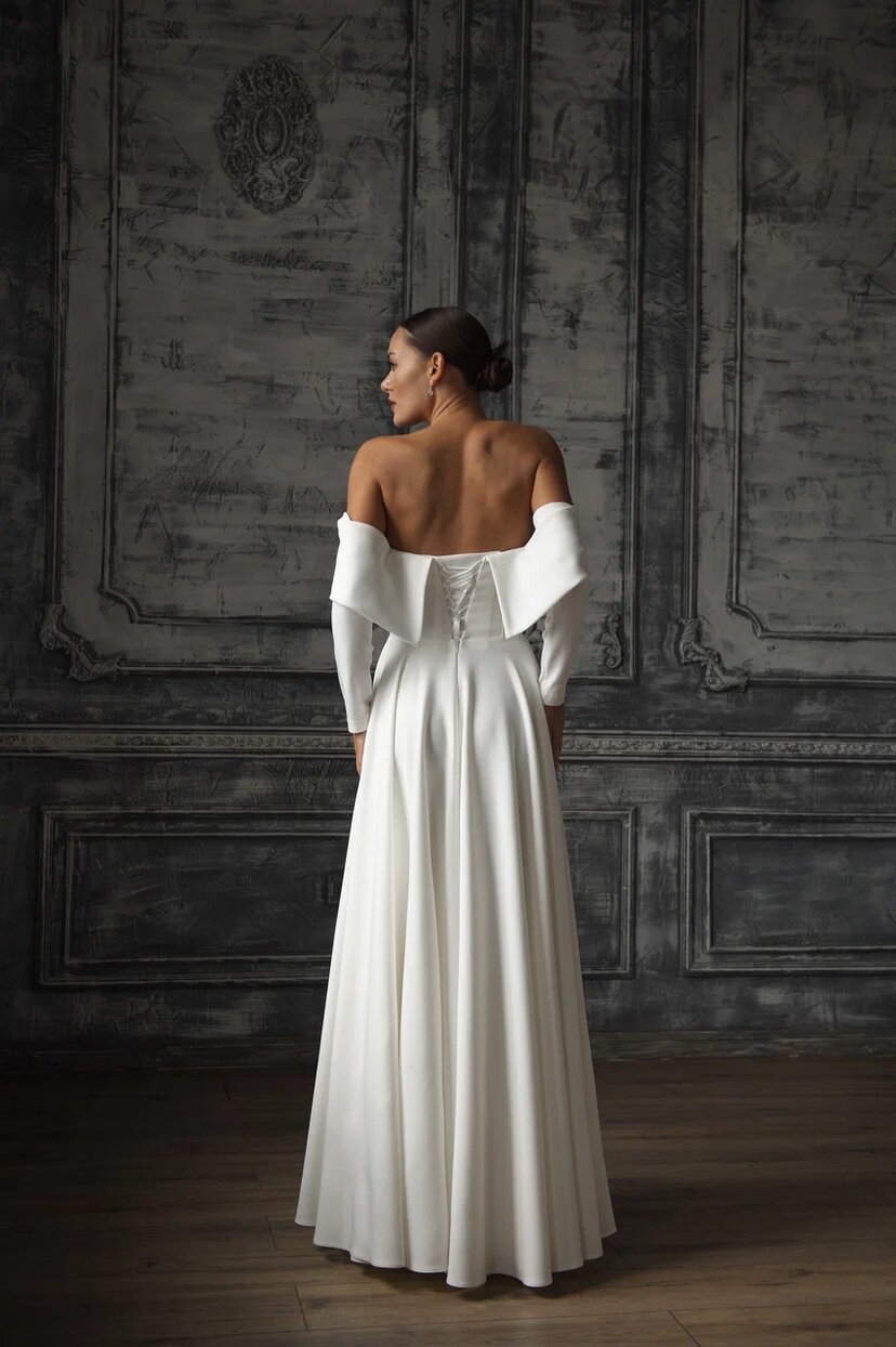 Потрясающее свадебное платье, силуэта рыбка с рукавами, приоткрытой спиной, обладающее собственным характером. Яркой деталью этой модели является шикарный вырез в зоне декольте, вытягивающий силуэт. Открытые плечи и длинные рукава создают притягательное ощущение контраста. Длинная облегающая юбка, выгодно демонстрирующая фигуру, оснащена эффектным глубоким вырезом.