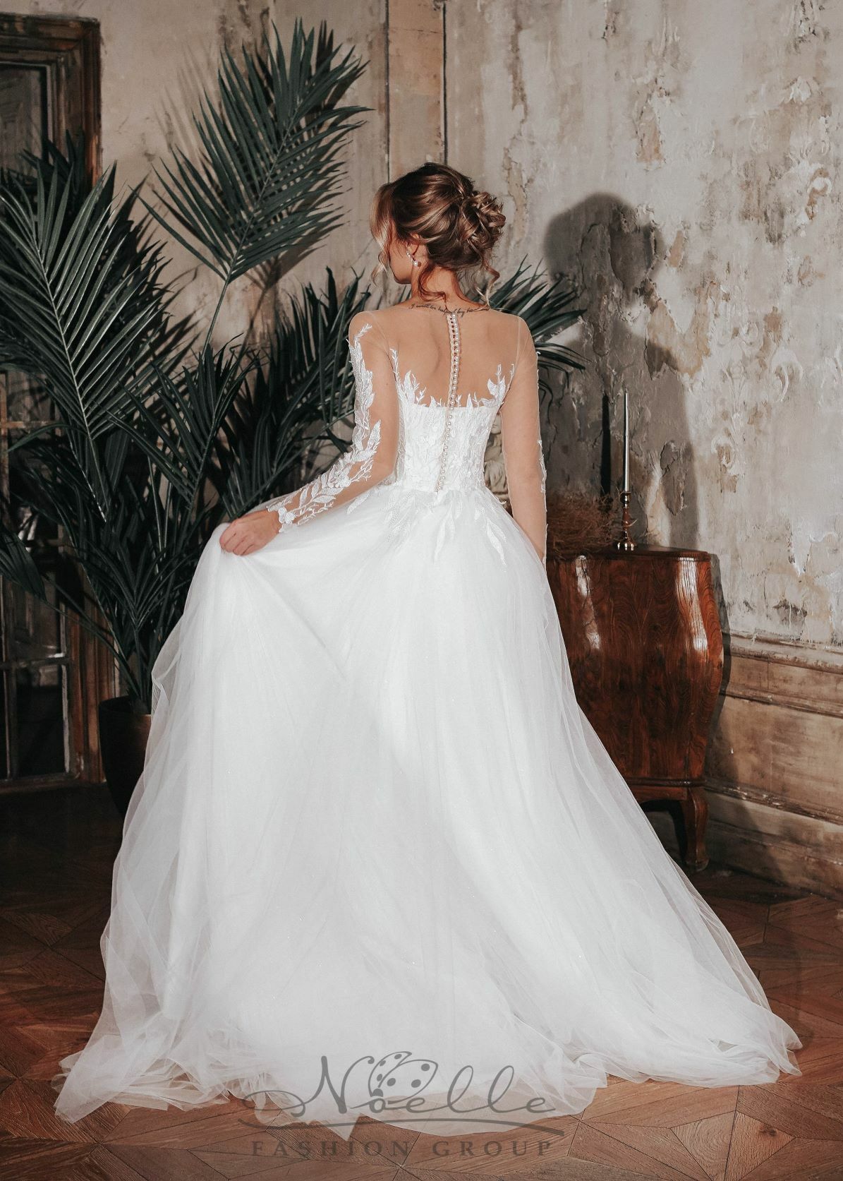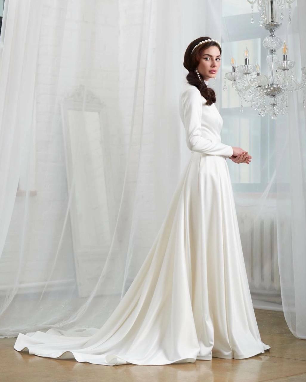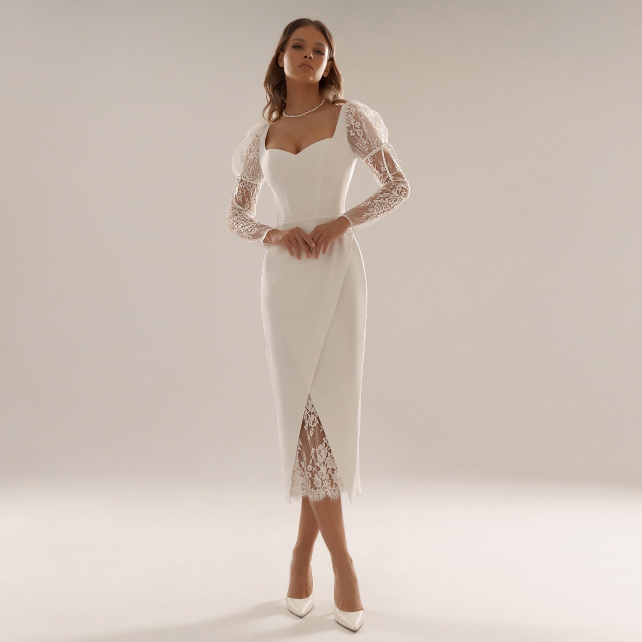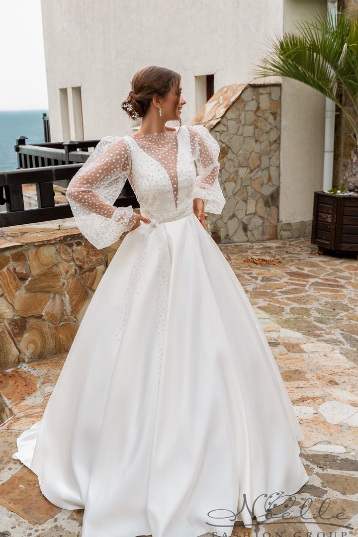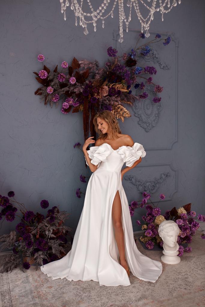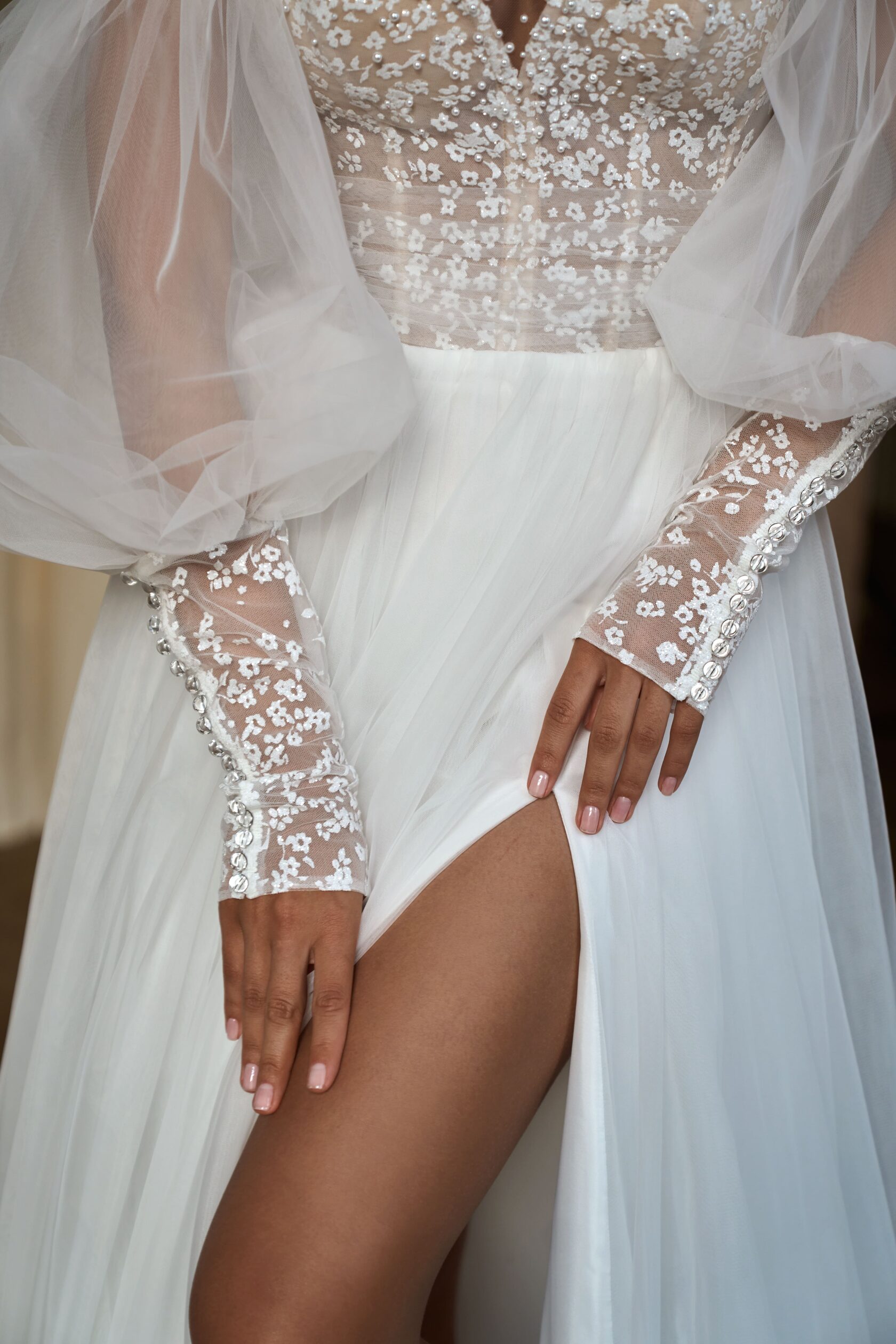 Потрясающее свадебное платье, силуэта рыбка с рукавами, приоткрытой спиной, обладающее собственным характером. Яркой деталью этой модели является шикарный вырез в зоне декольте, вытягивающий силуэт. Открытые плечи и длинные рукава создают притягательное ощущение контраста. Длинная облегающая юбка, выгодно демонстрирующая фигуру, оснащена эффектным глубоким вырезом.
