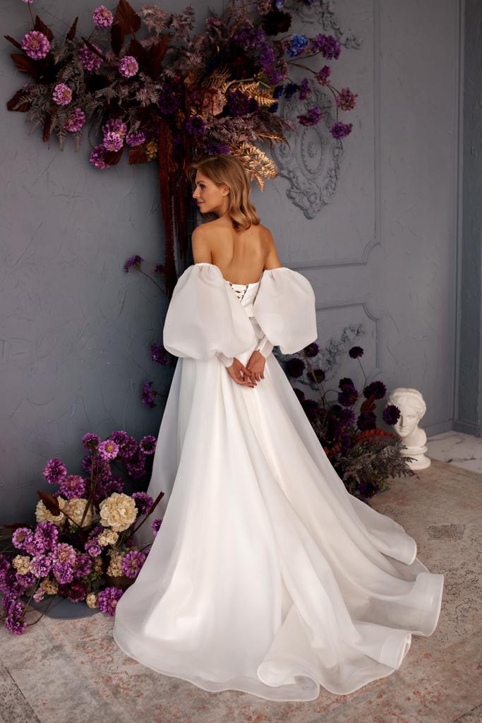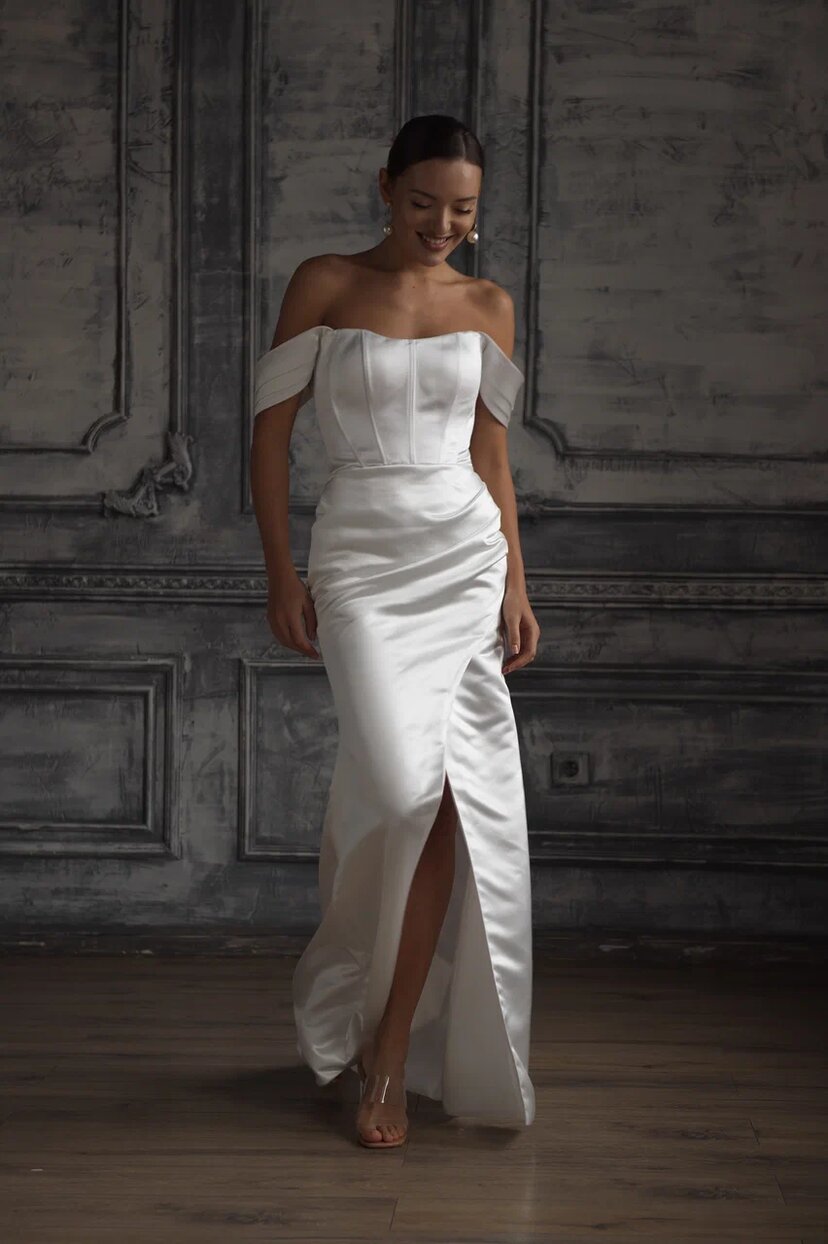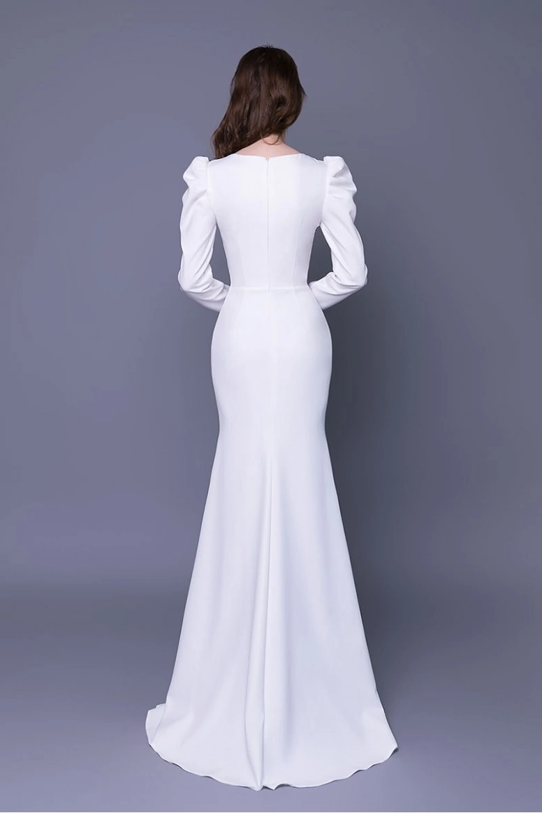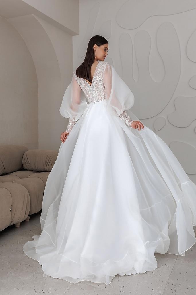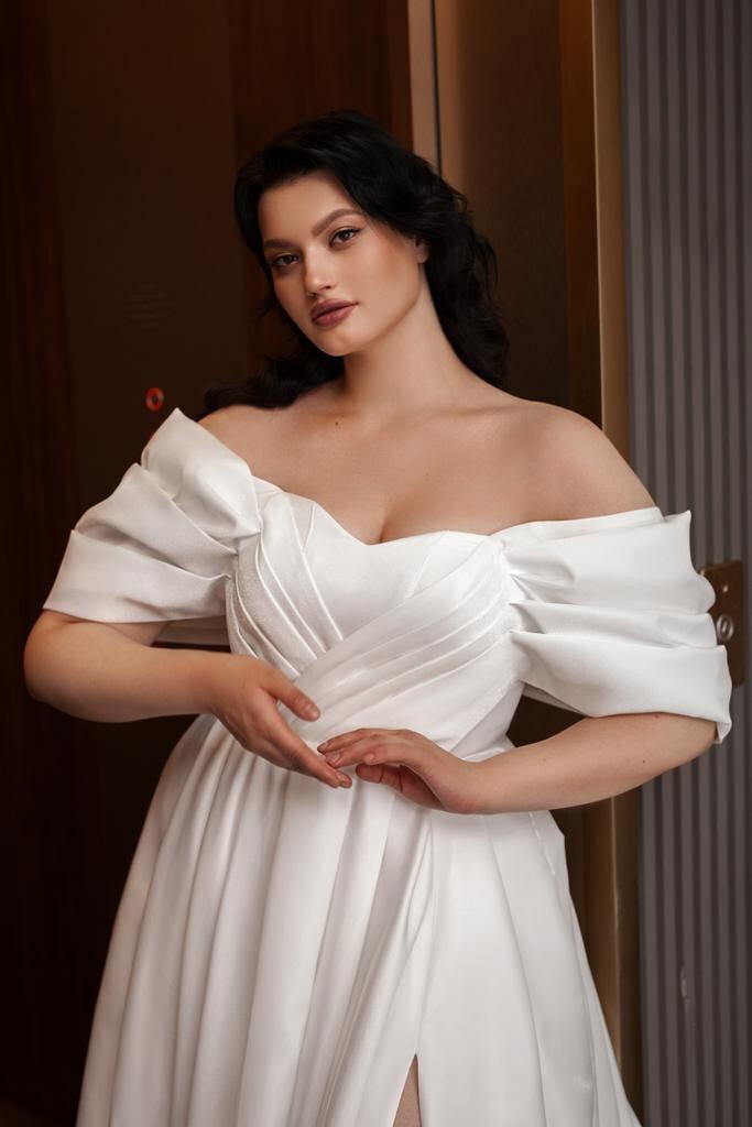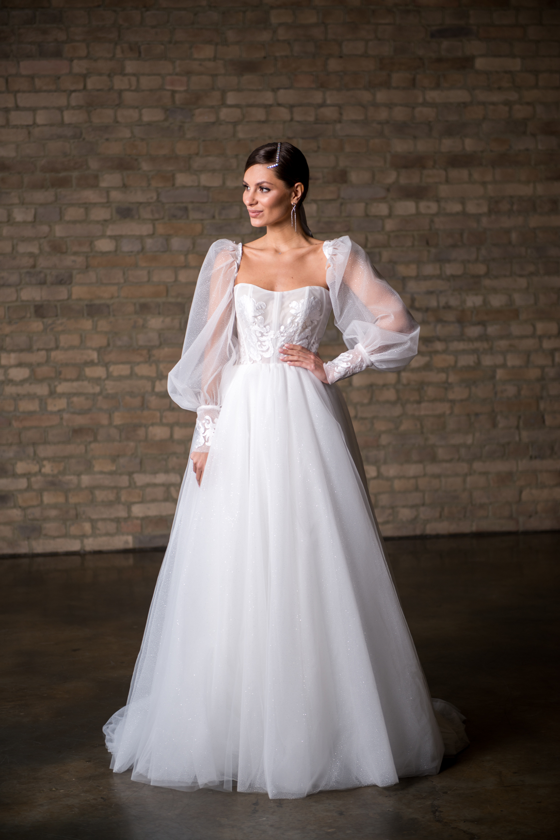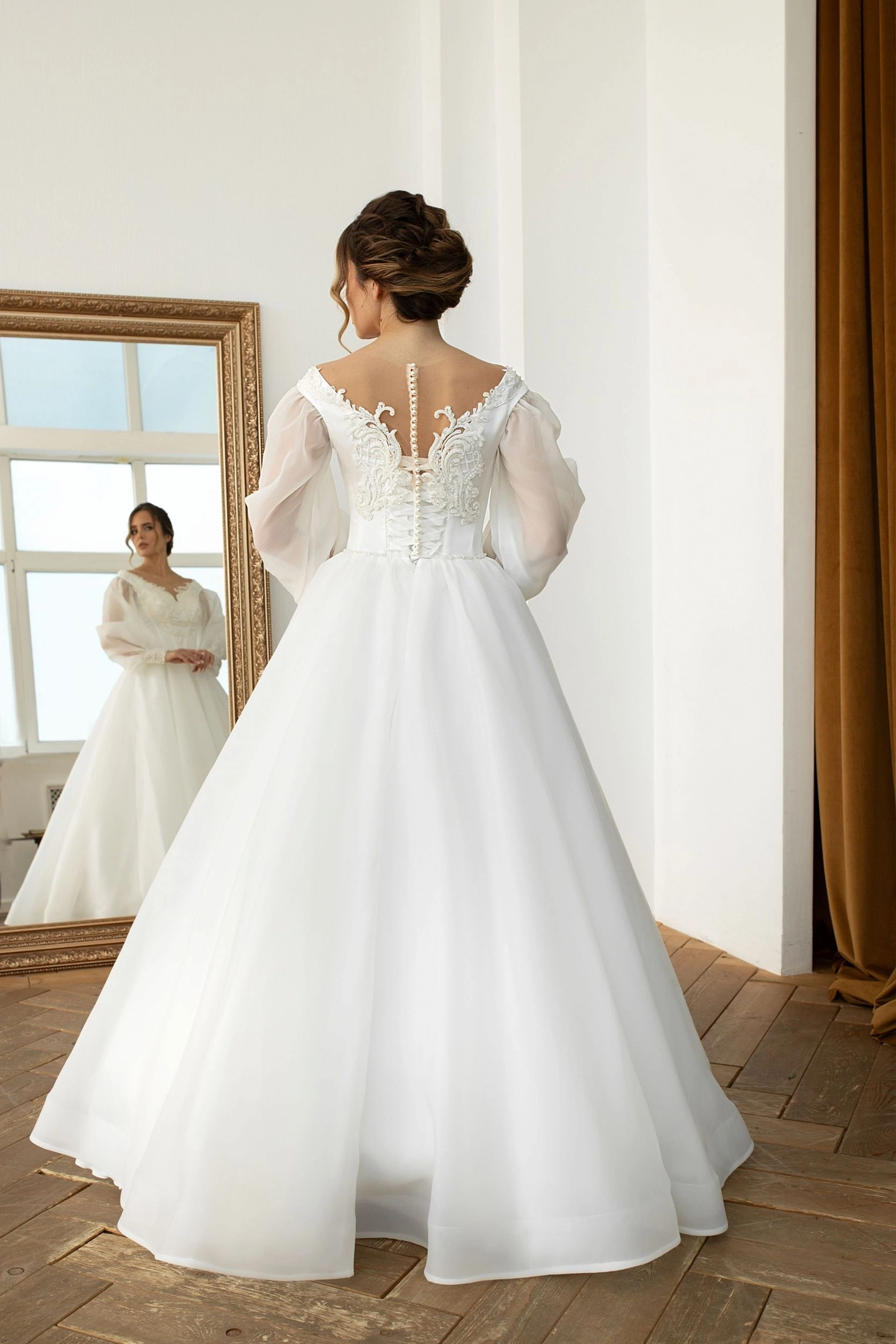 Потрясающее свадебное платье, силуэта рыбка с рукавами, приоткрытой спиной, обладающее собственным характером. Яркой деталью этой модели является шикарный вырез в зоне декольте, вытягивающий силуэт. Открытые плечи и длинные рукава создают притягательное ощущение контраста. Длинная облегающая юбка, выгодно демонстрирующая фигуру, оснащена эффектным глубоким вырезом.