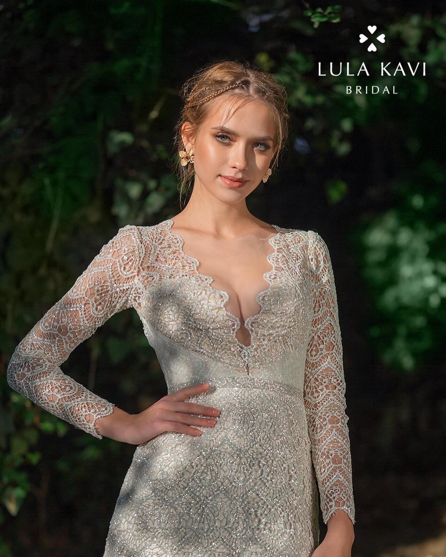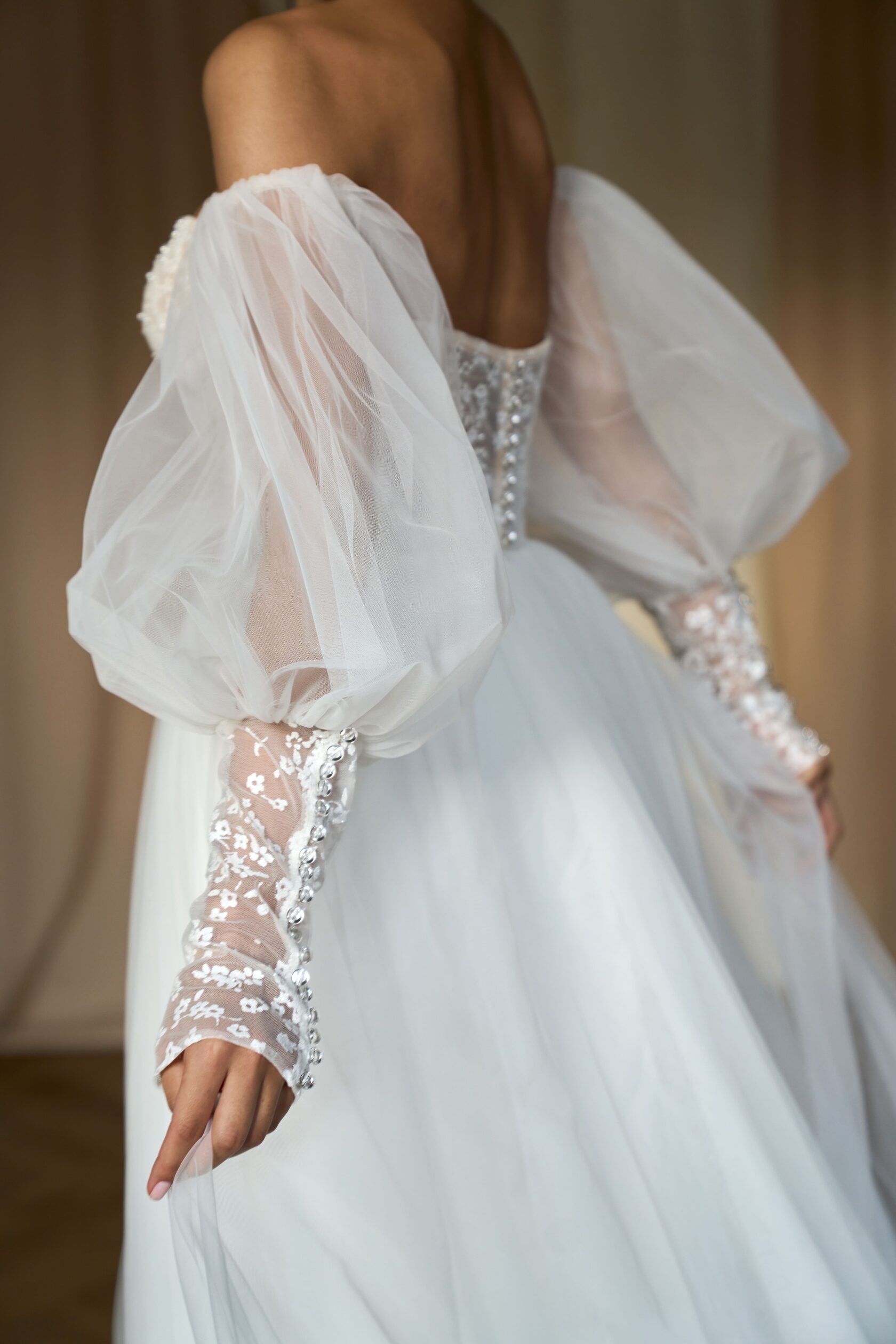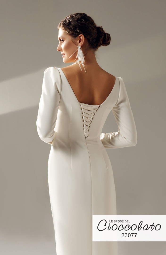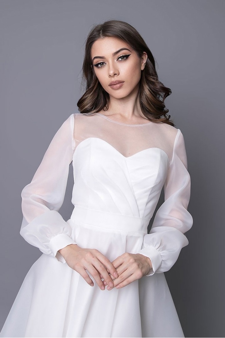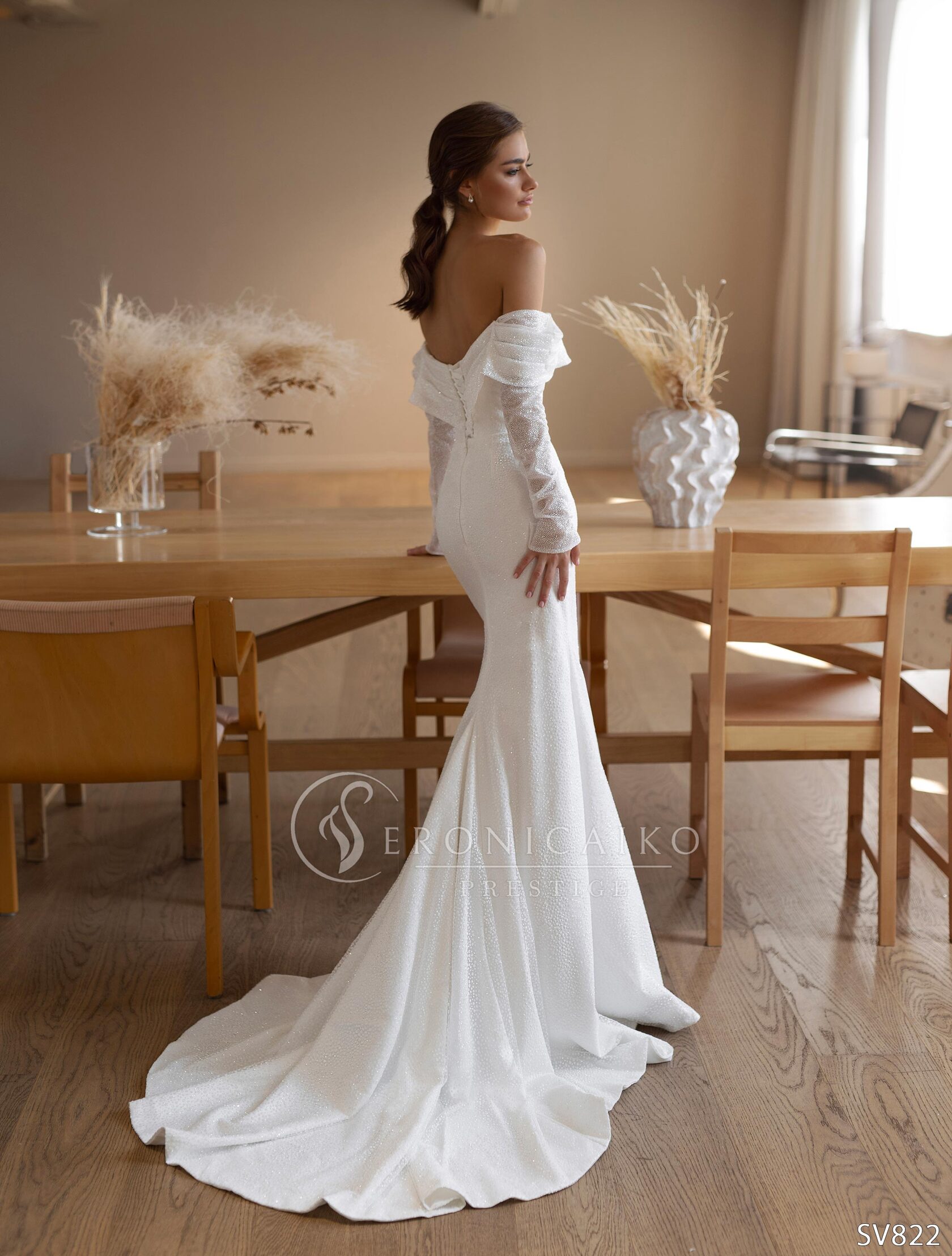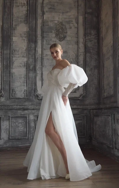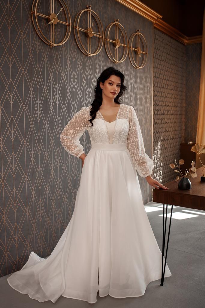 Потрясающее свадебное платье, силуэта рыбка с рукавами, приоткрытой спиной, обладающее собственным характером. Яркой деталью этой модели является шикарный вырез в зоне декольте, вытягивающий силуэт. Открытые плечи и длинные рукава создают притягательное ощущение контраста. Длинная облегающая юбка, выгодно демонстрирующая фигуру, оснащена эффектным глубоким вырезом.