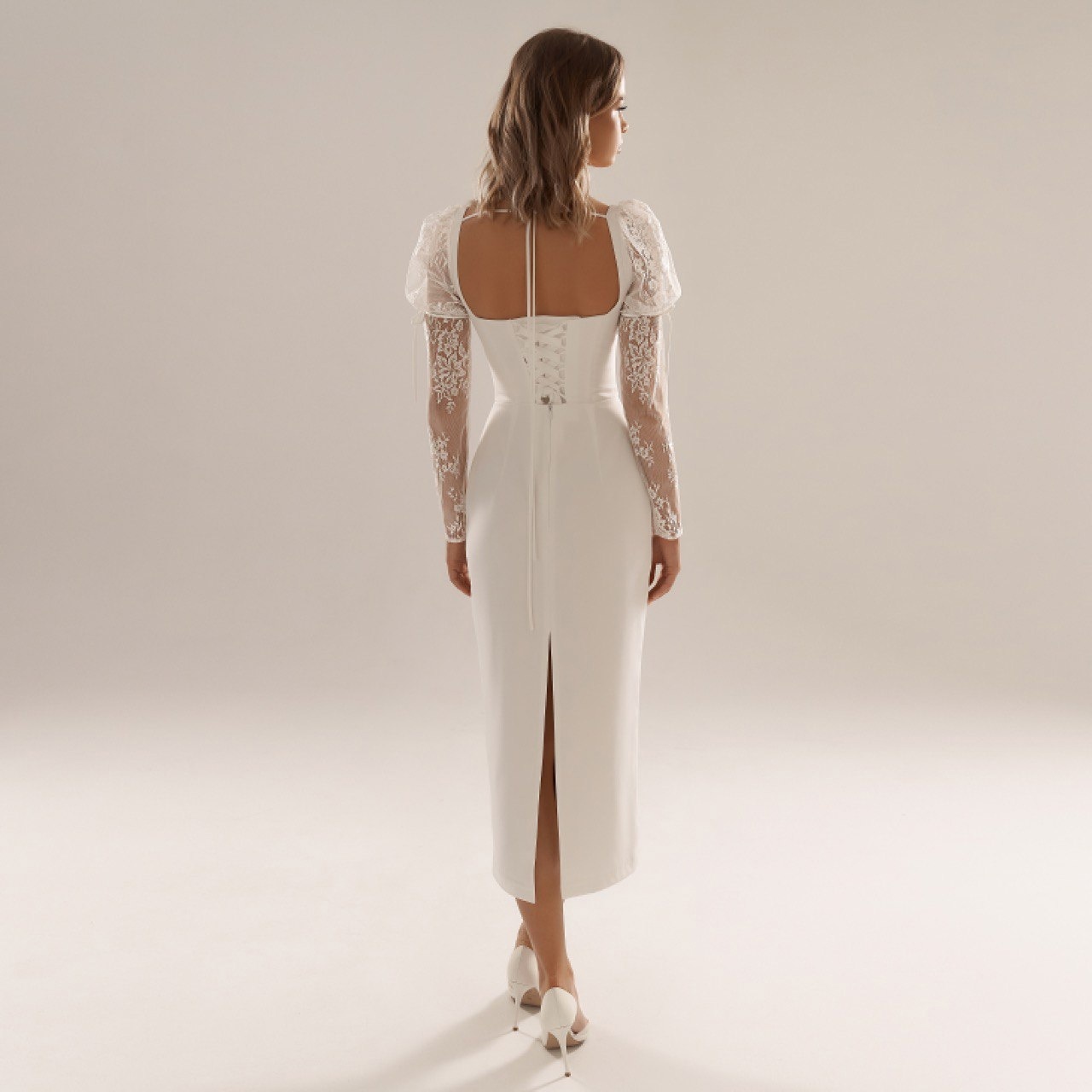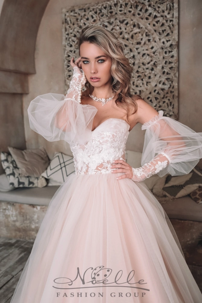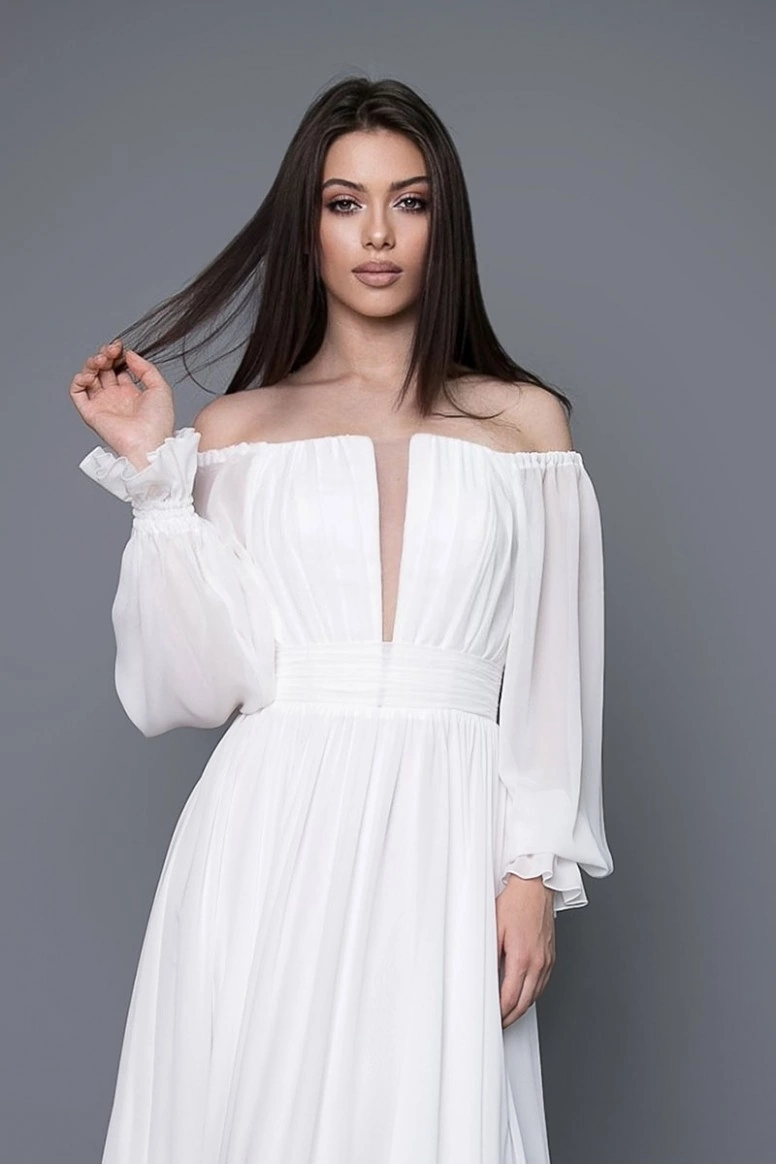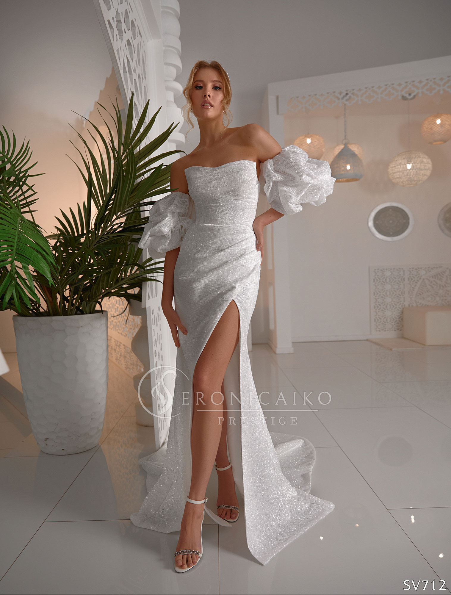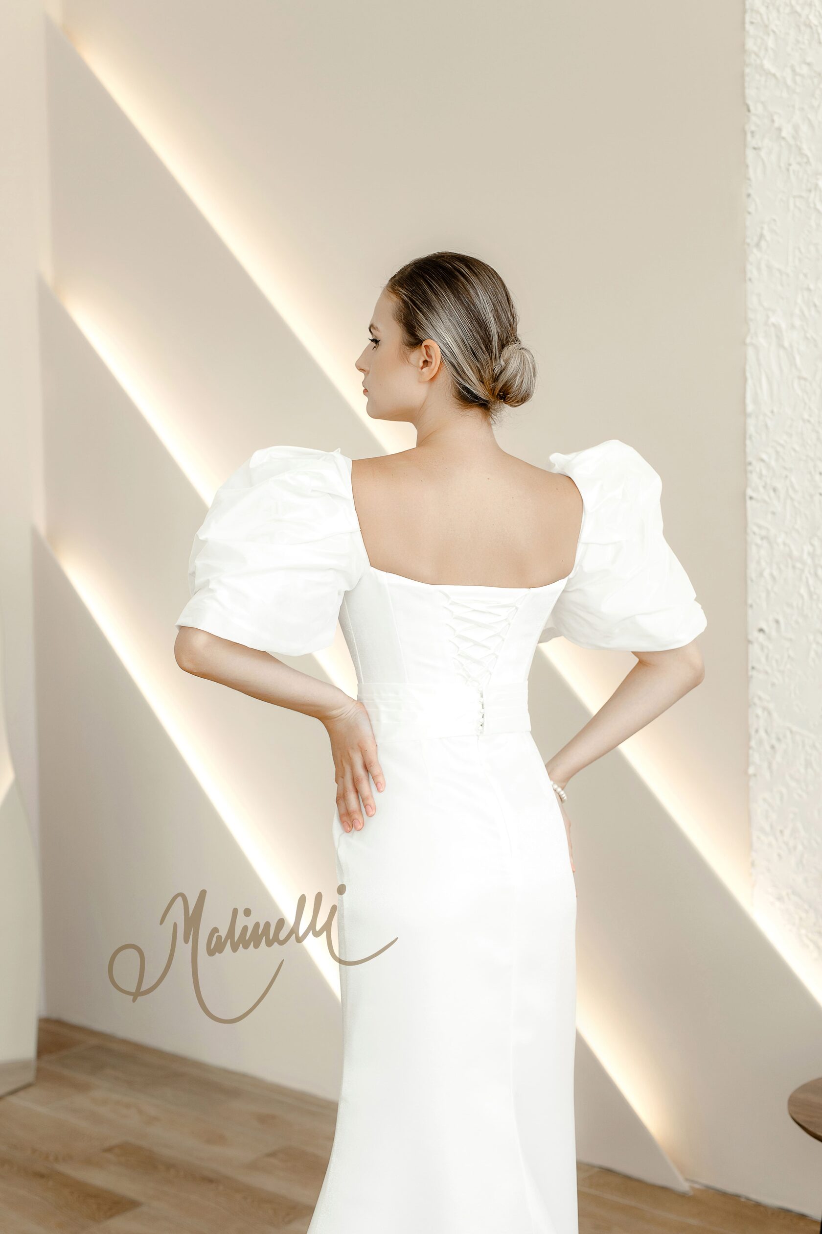 Потрясающее свадебное платье, силуэта рыбка с рукавами, приоткрытой спиной, обладающее собственным характером. Яркой деталью этой модели является шикарный вырез в зоне декольте, вытягивающий силуэт. Открытые плечи и длинные рукава создают притягательное ощущение контраста. Длинная облегающая юбка, выгодно демонстрирующая фигуру, оснащена эффектным глубоким вырезом.