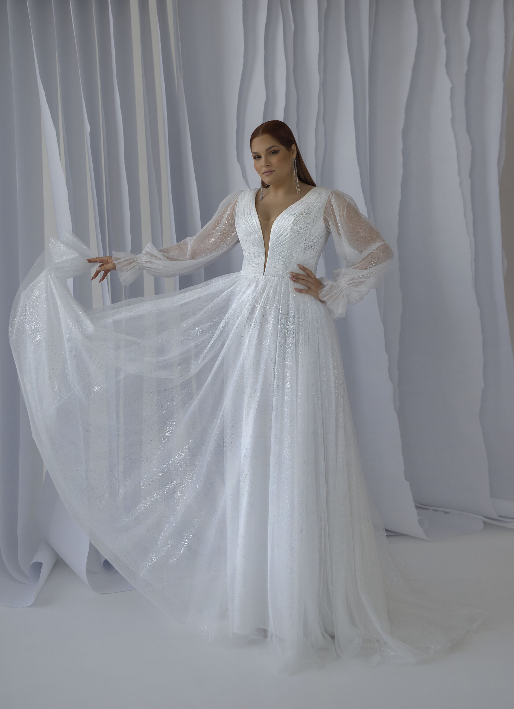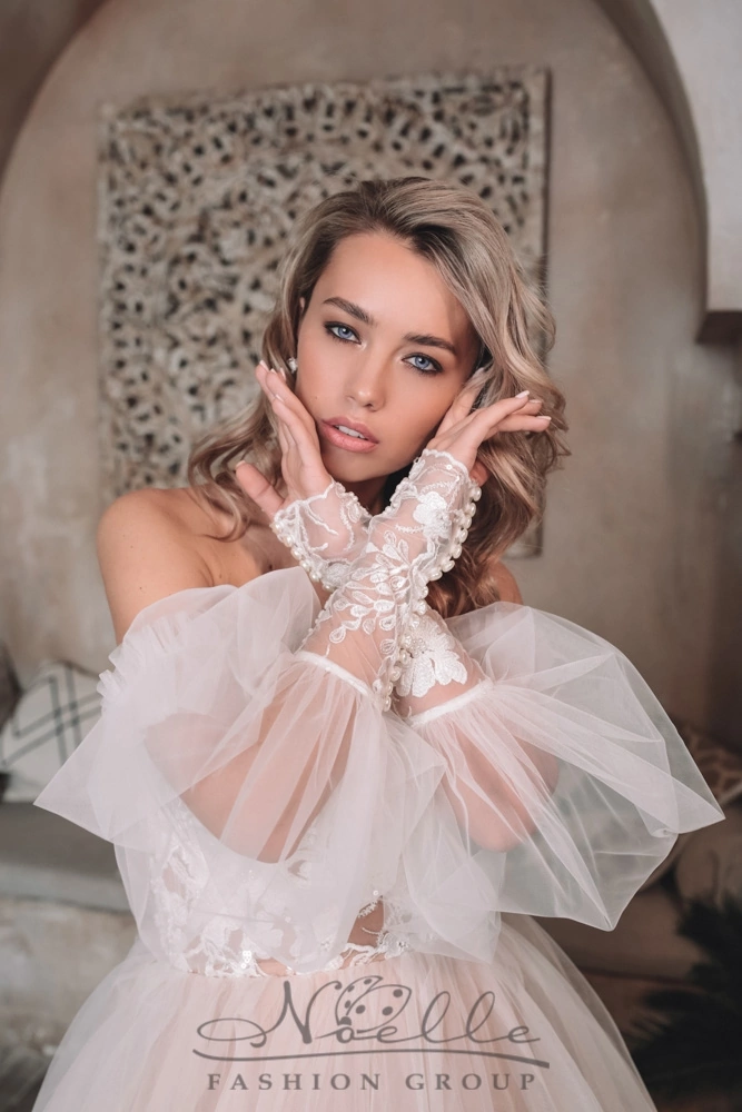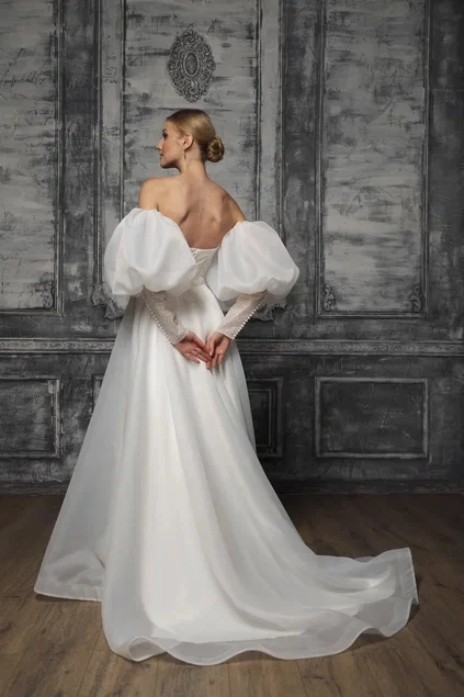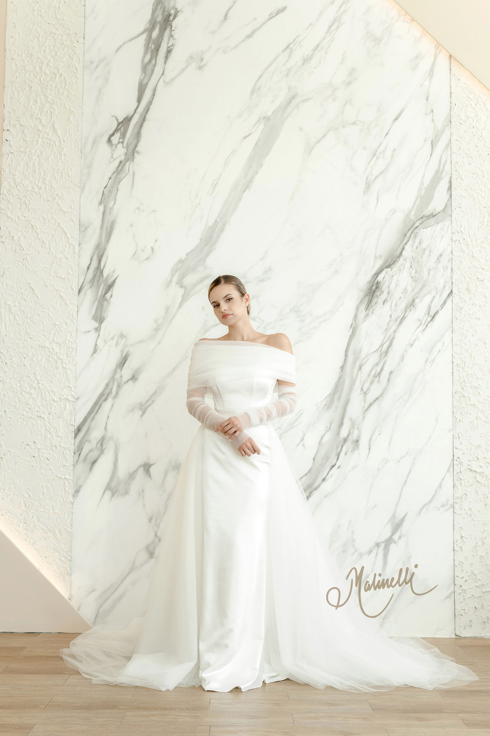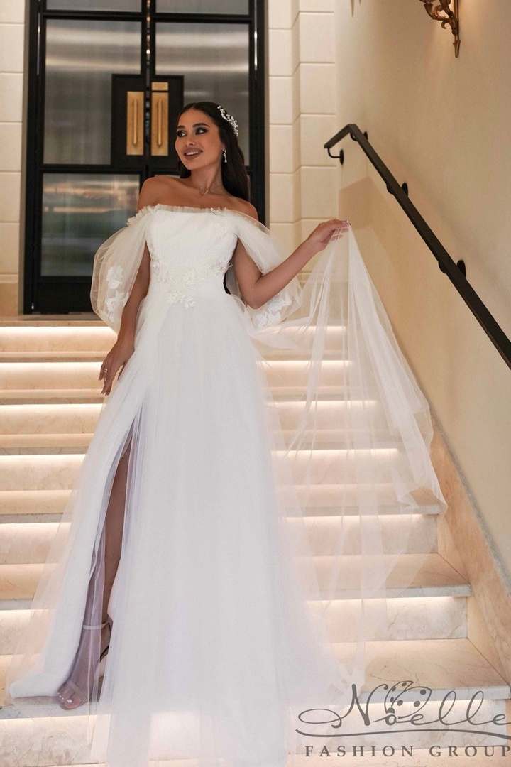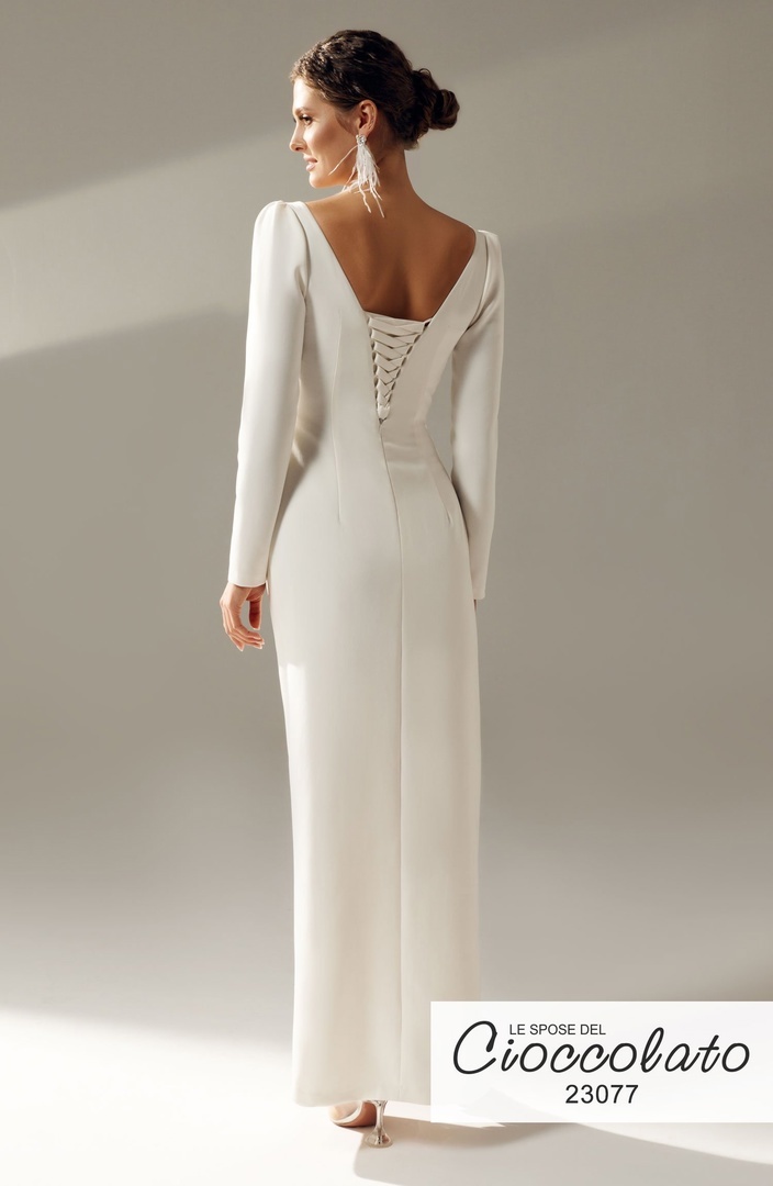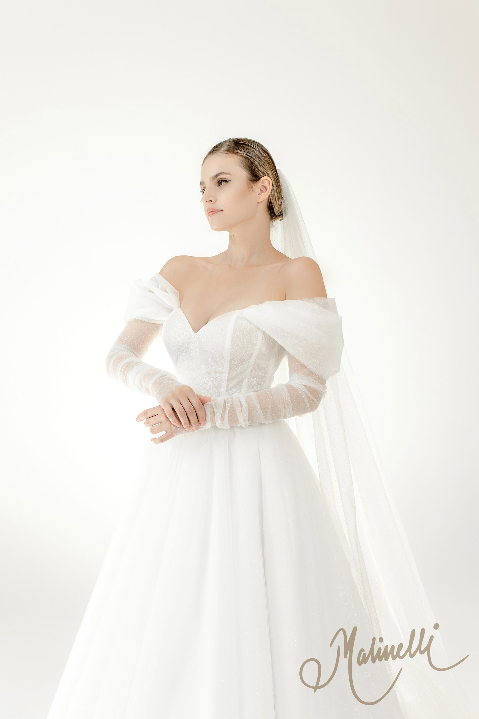 Потрясающее свадебное платье, силуэта рыбка с рукавами, приоткрытой спиной, обладающее собственным характером. Яркой деталью этой модели является шикарный вырез в зоне декольте, вытягивающий силуэт. Открытые плечи и длинные рукава создают притягательное ощущение контраста. Длинная облегающая юбка, выгодно демонстрирующая фигуру, оснащена эффектным глубоким вырезом.
