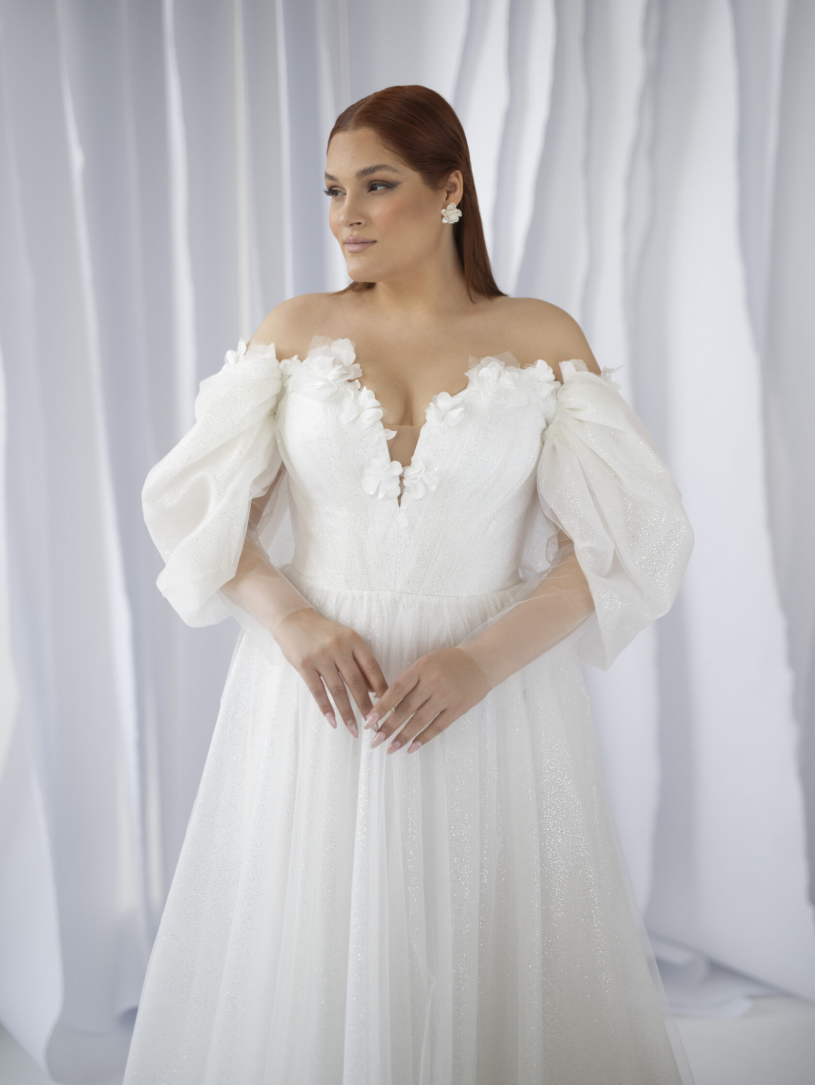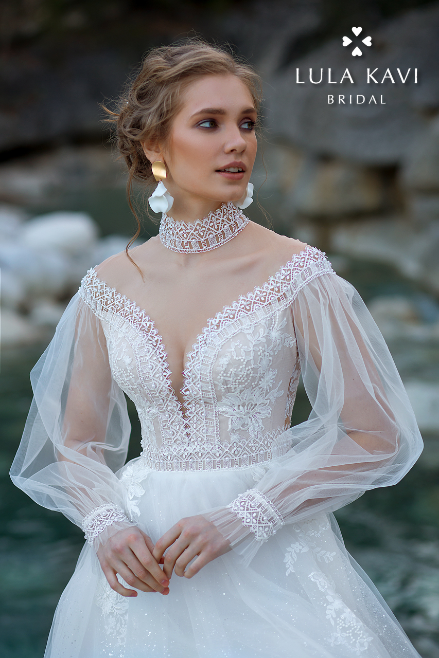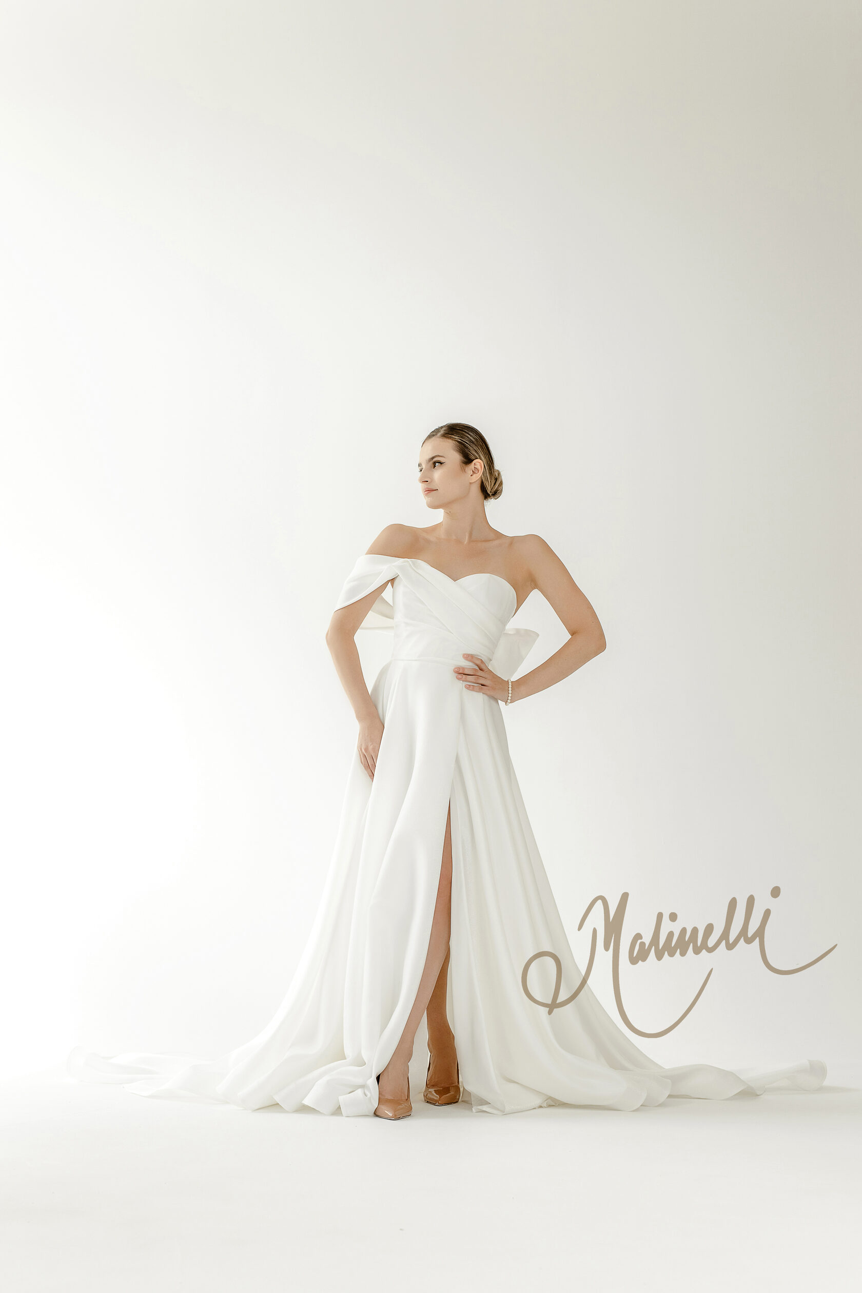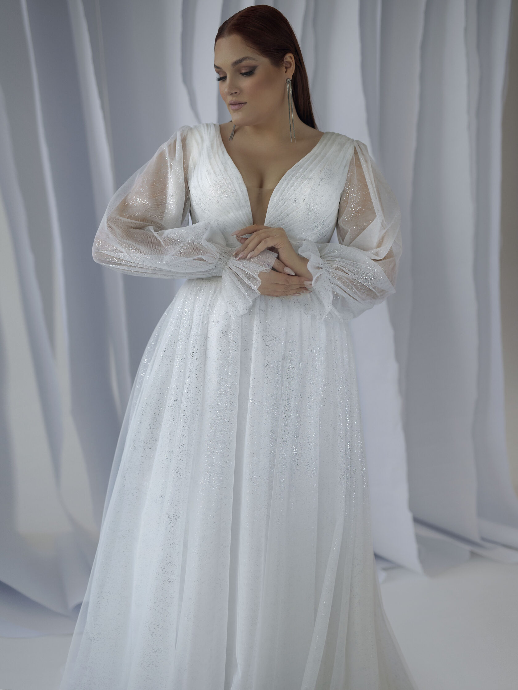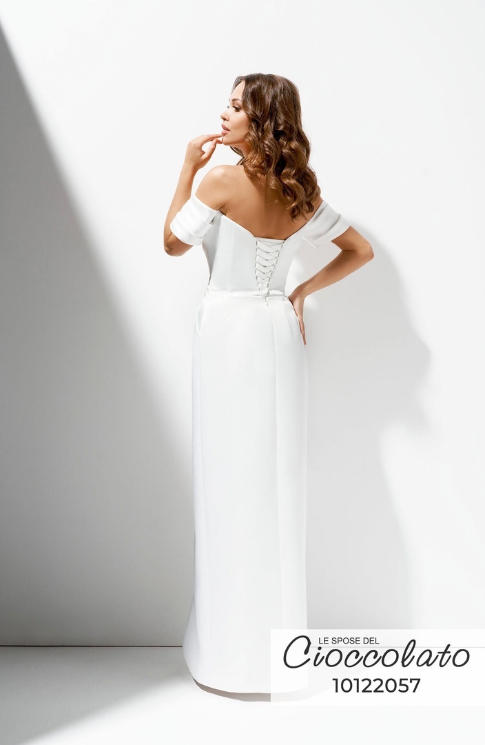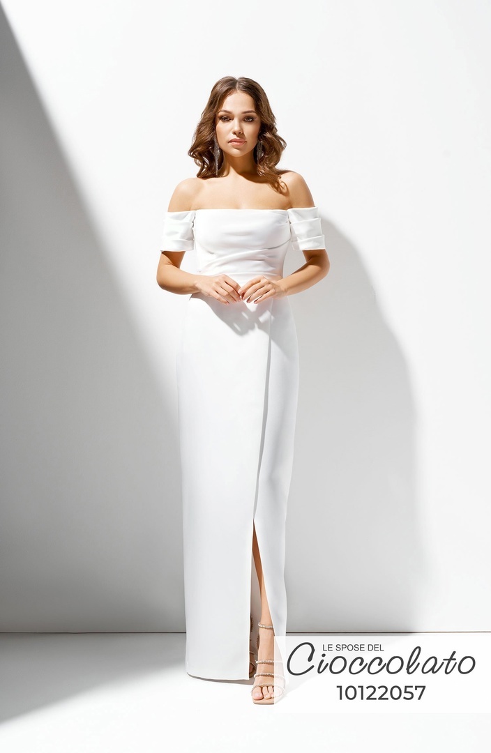 Потрясающее свадебное платье, силуэта рыбка с рукавами, приоткрытой спиной, обладающее собственным характером. Яркой деталью этой модели является шикарный вырез в зоне декольте, вытягивающий силуэт. Открытые плечи и длинные рукава создают притягательное ощущение контраста. Длинная облегающая юбка, выгодно демонстрирующая фигуру, оснащена эффектным глубоким вырезом.