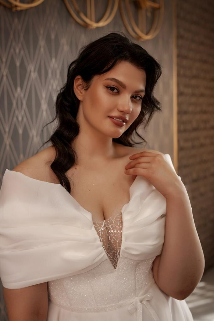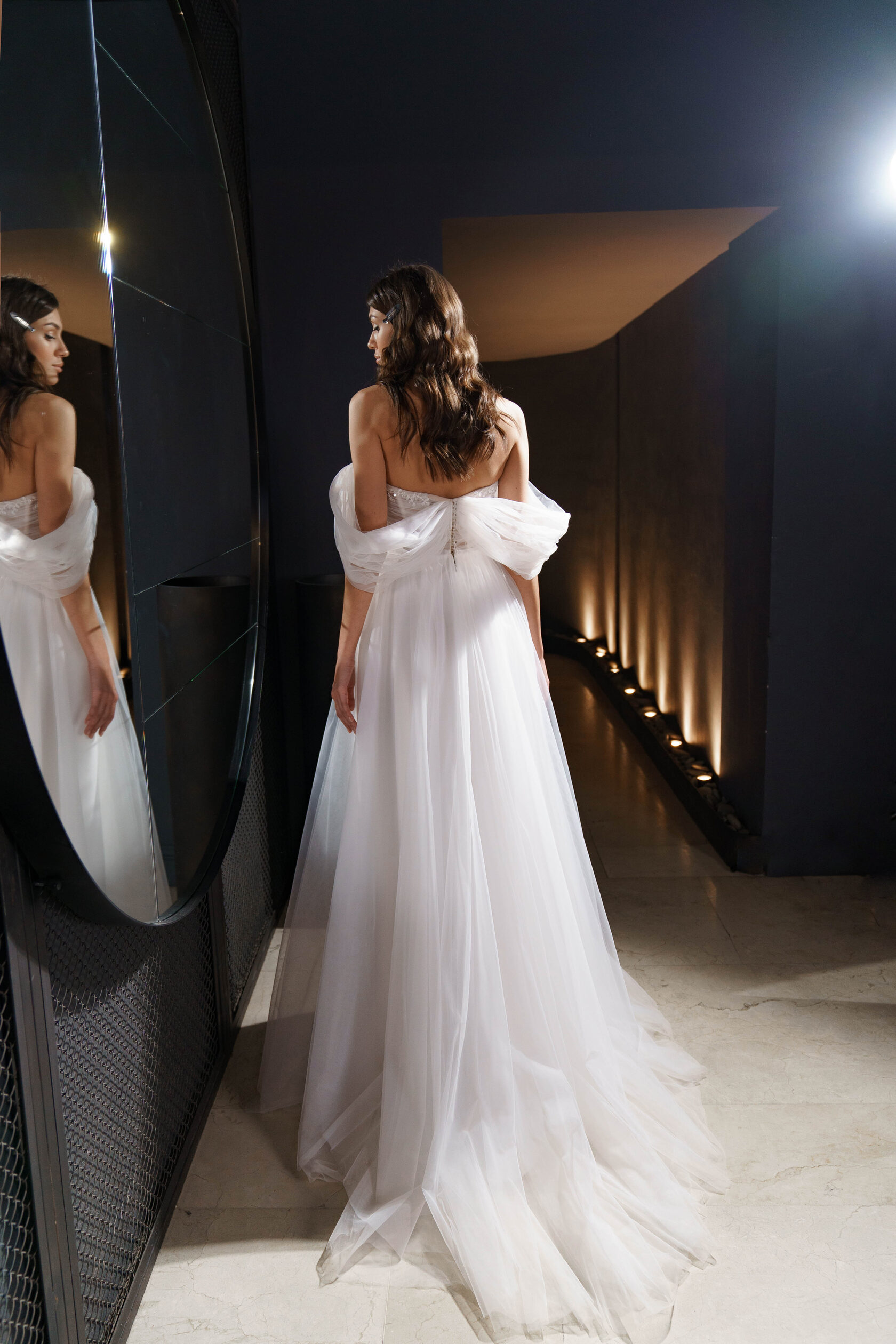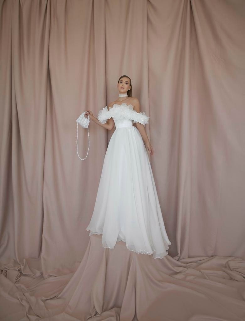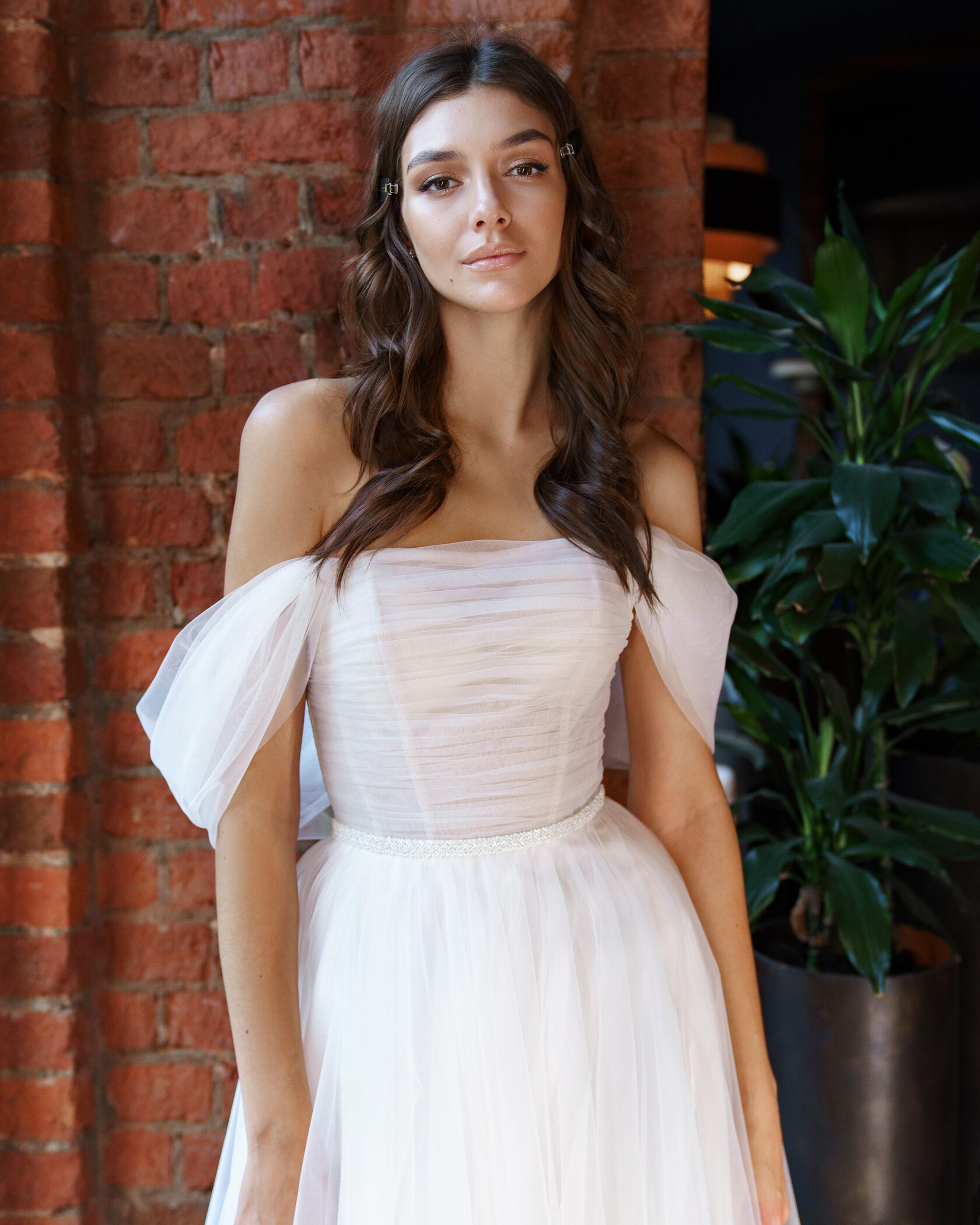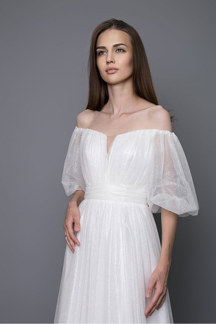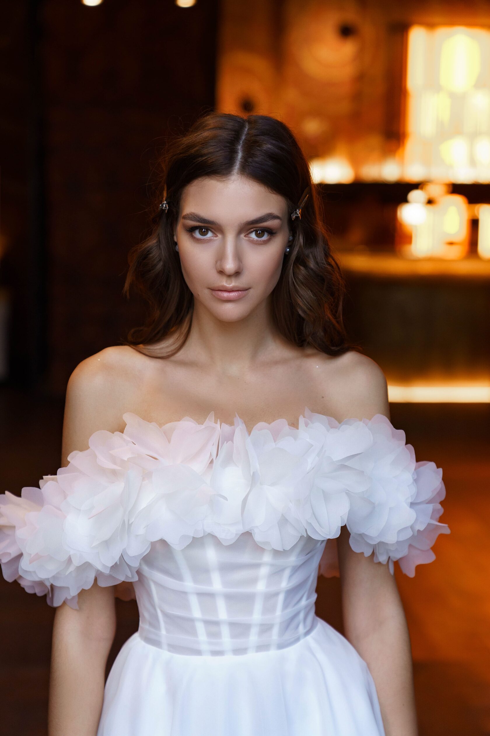 Воздушный и роскошный образ для той, кто безмерно ценит себя. Той, что может позволить себе открытые плечи, ведь у неё безупречная зона декольте