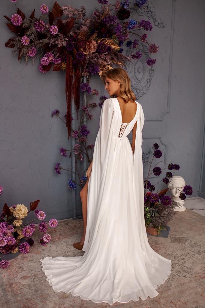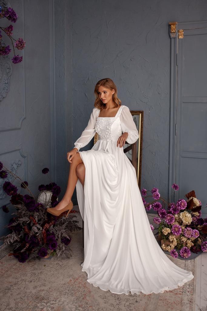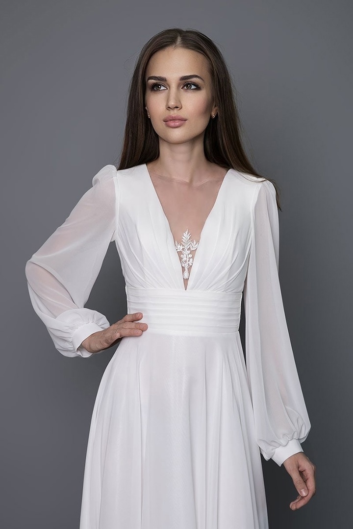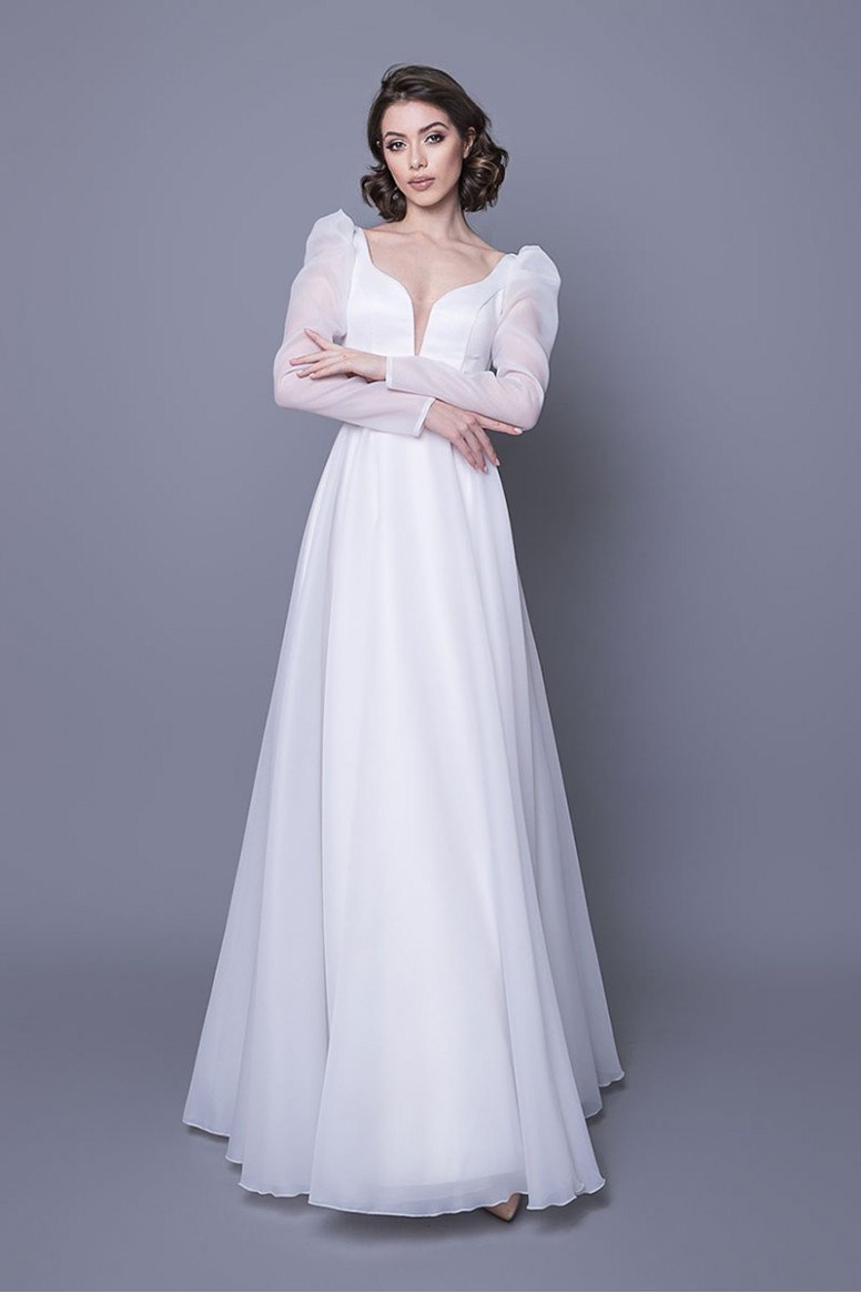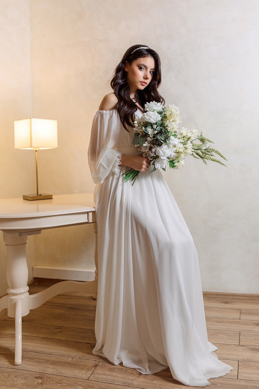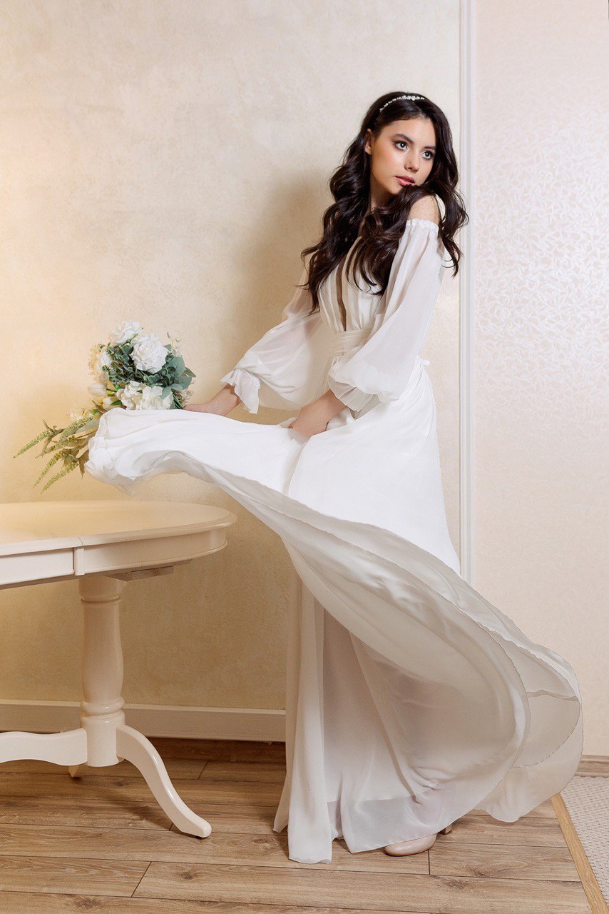 Безумно легкое и комфортное платье, выполнено из струящегося шифона, безусловно подчеркнёт утончённость каждой невесты!