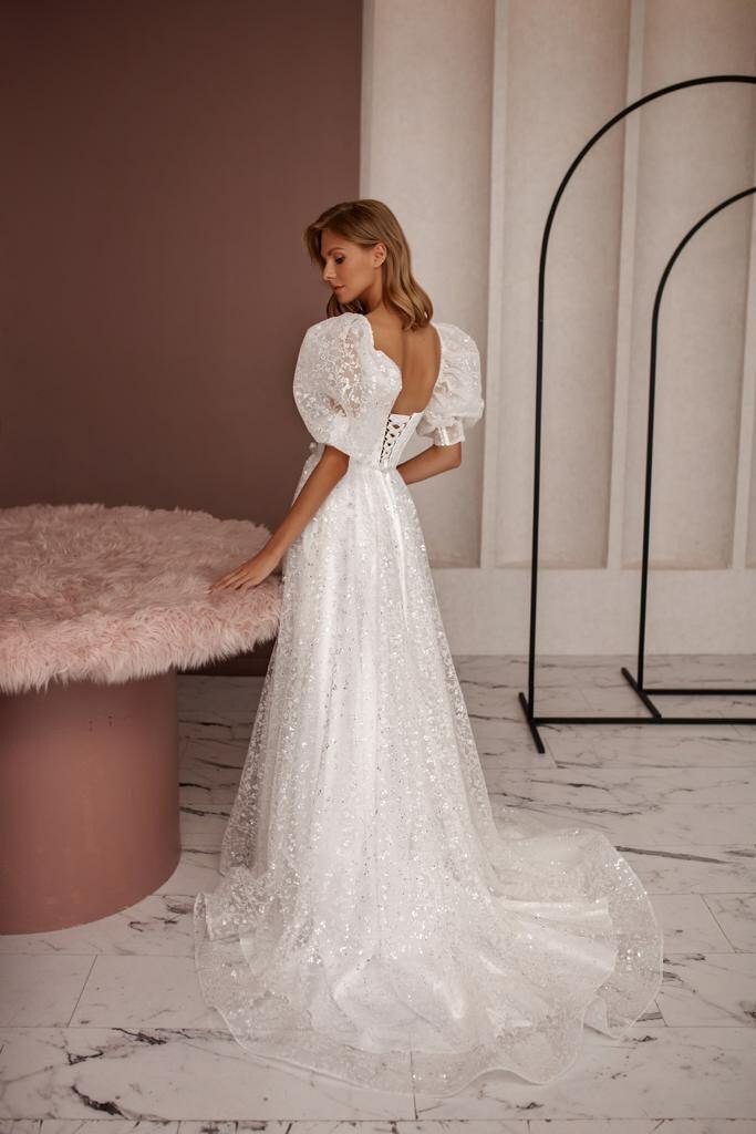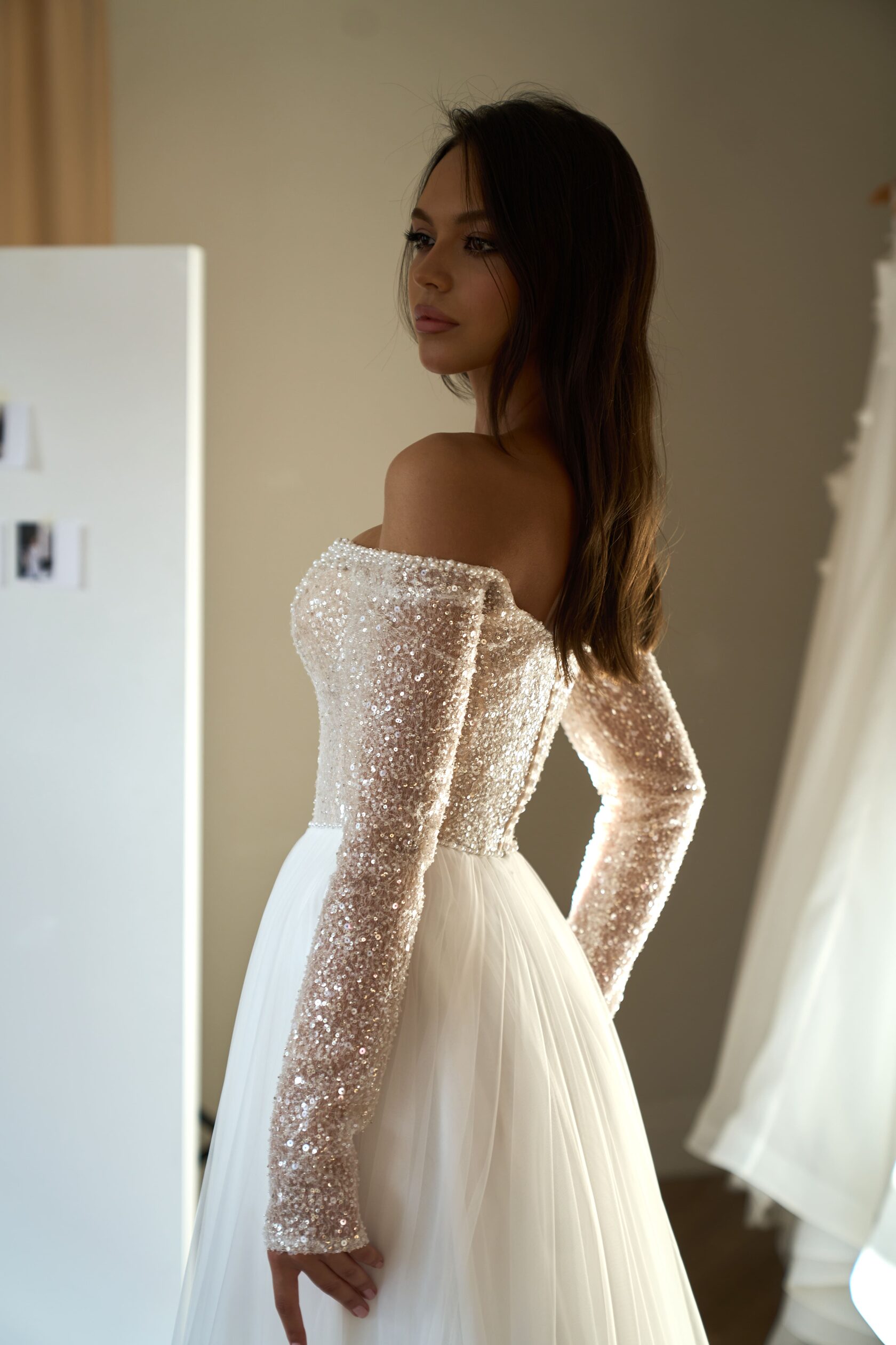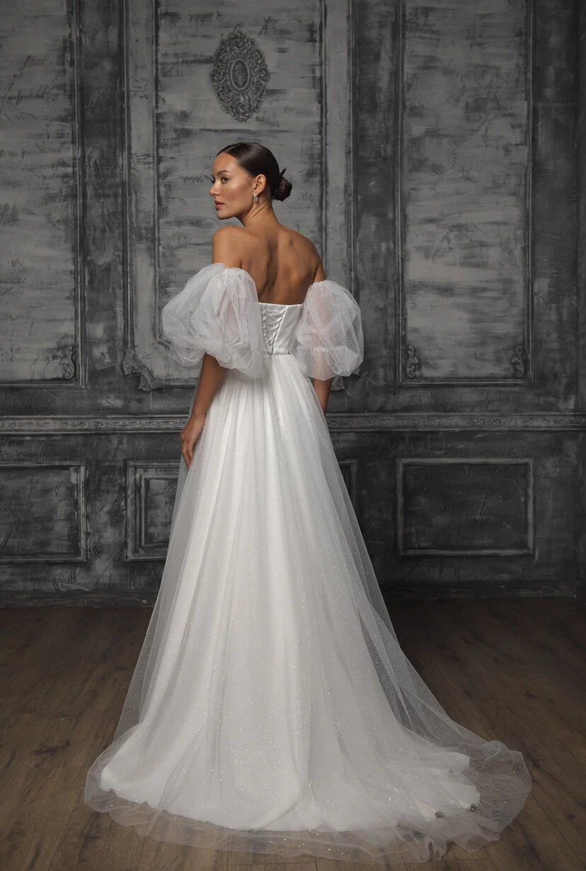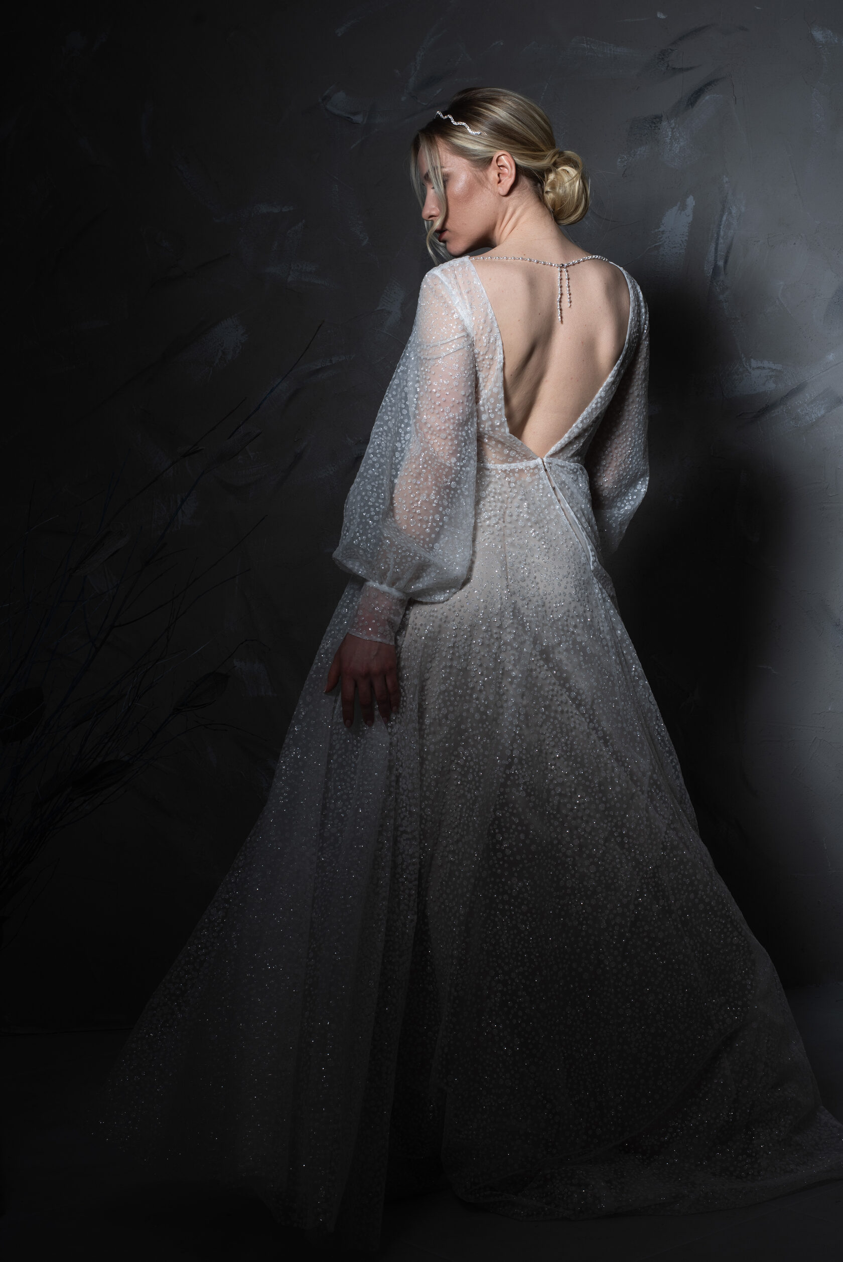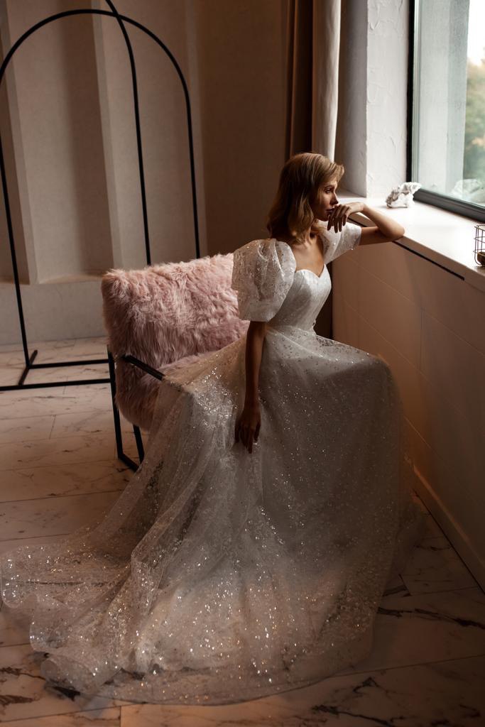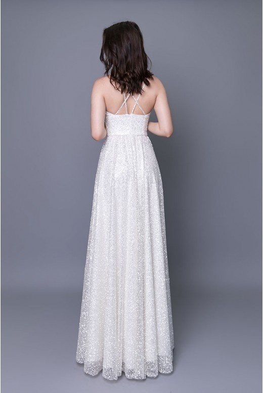Воздушная юбка с добавлением мерцания из росшива ювелирной пайетки, открытая до талии спина. Модель без корсета, застегивается на молнию.
