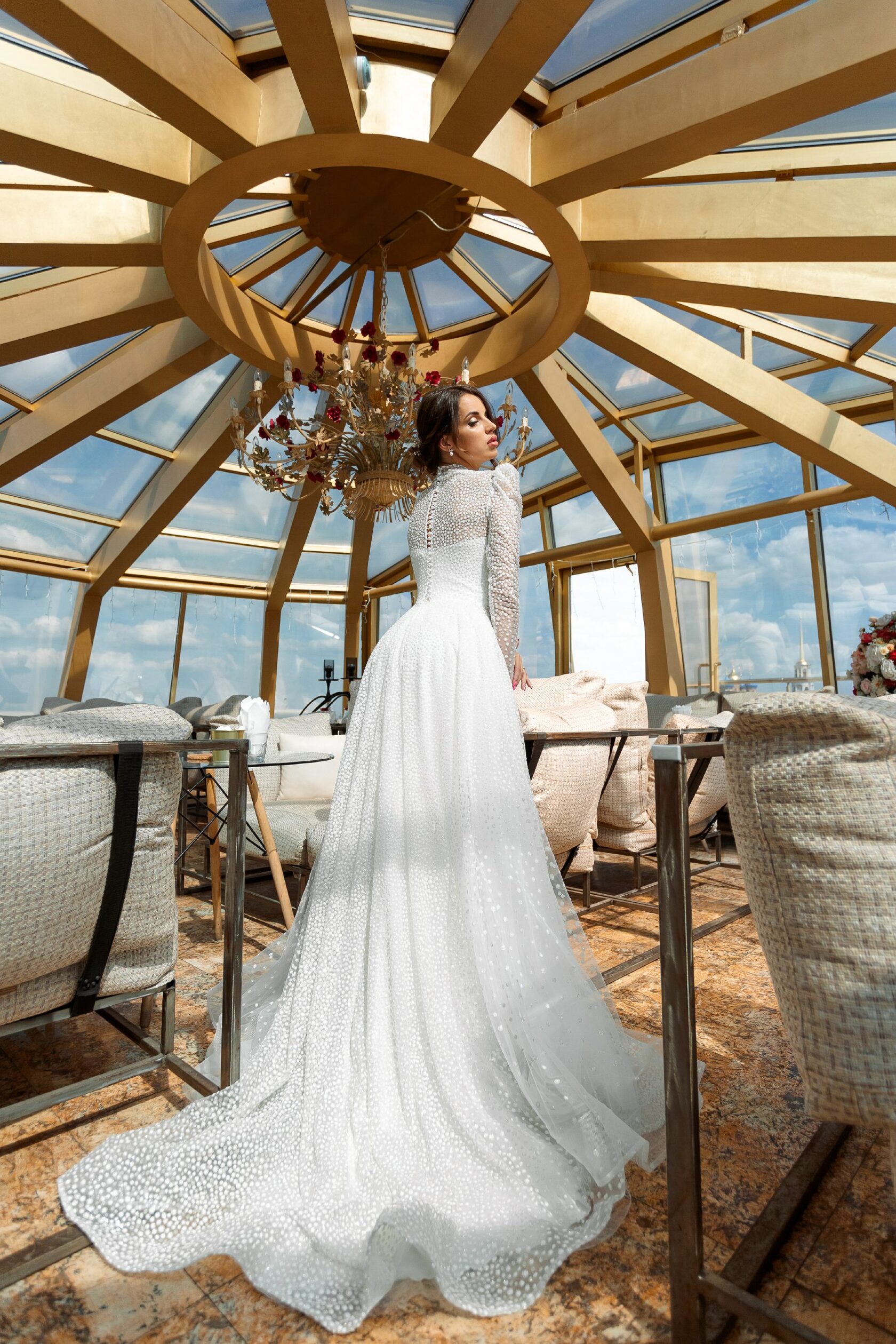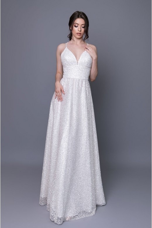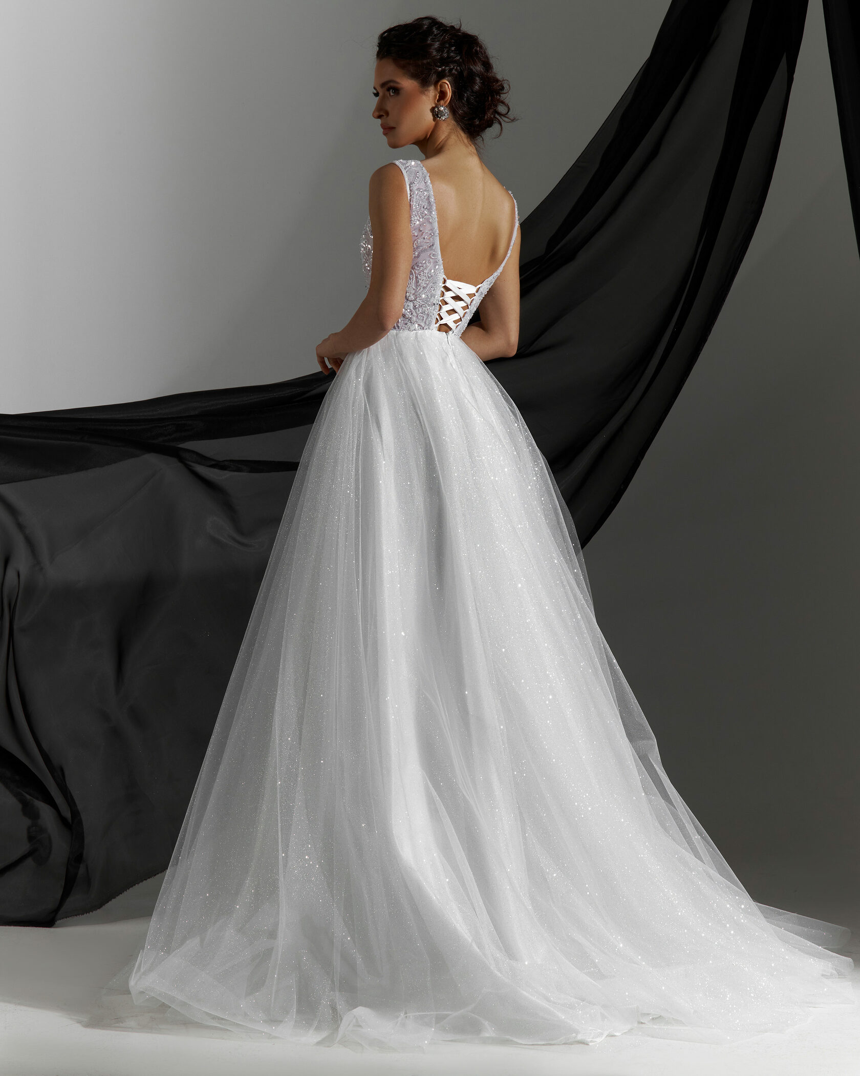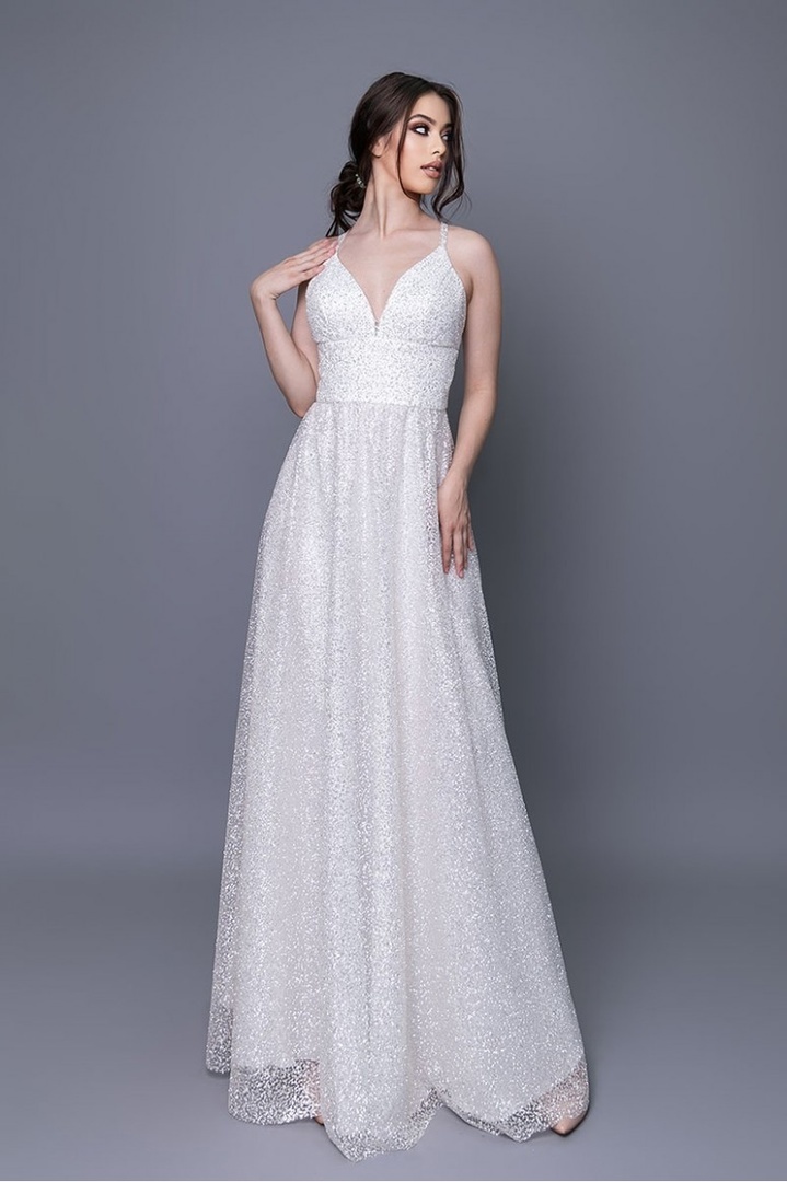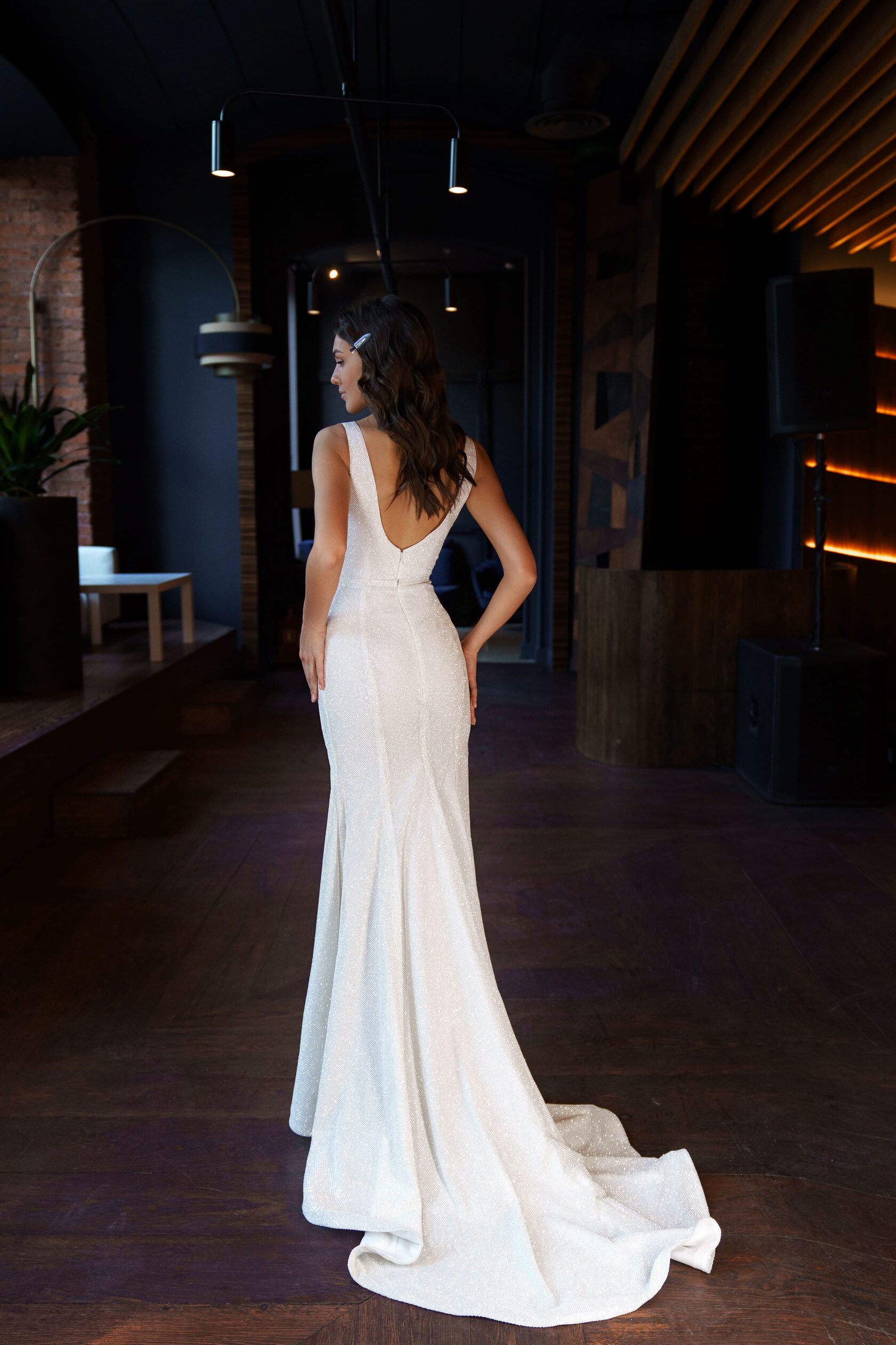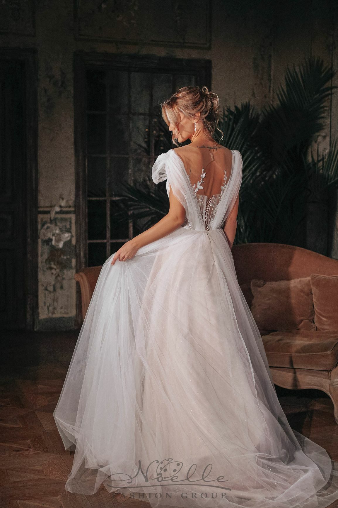 Воздушная юбка с добавлением мерцания из росшива ювелирной пайетки, открытая до талии спина. Модель без корсета, застегивается на молнию.