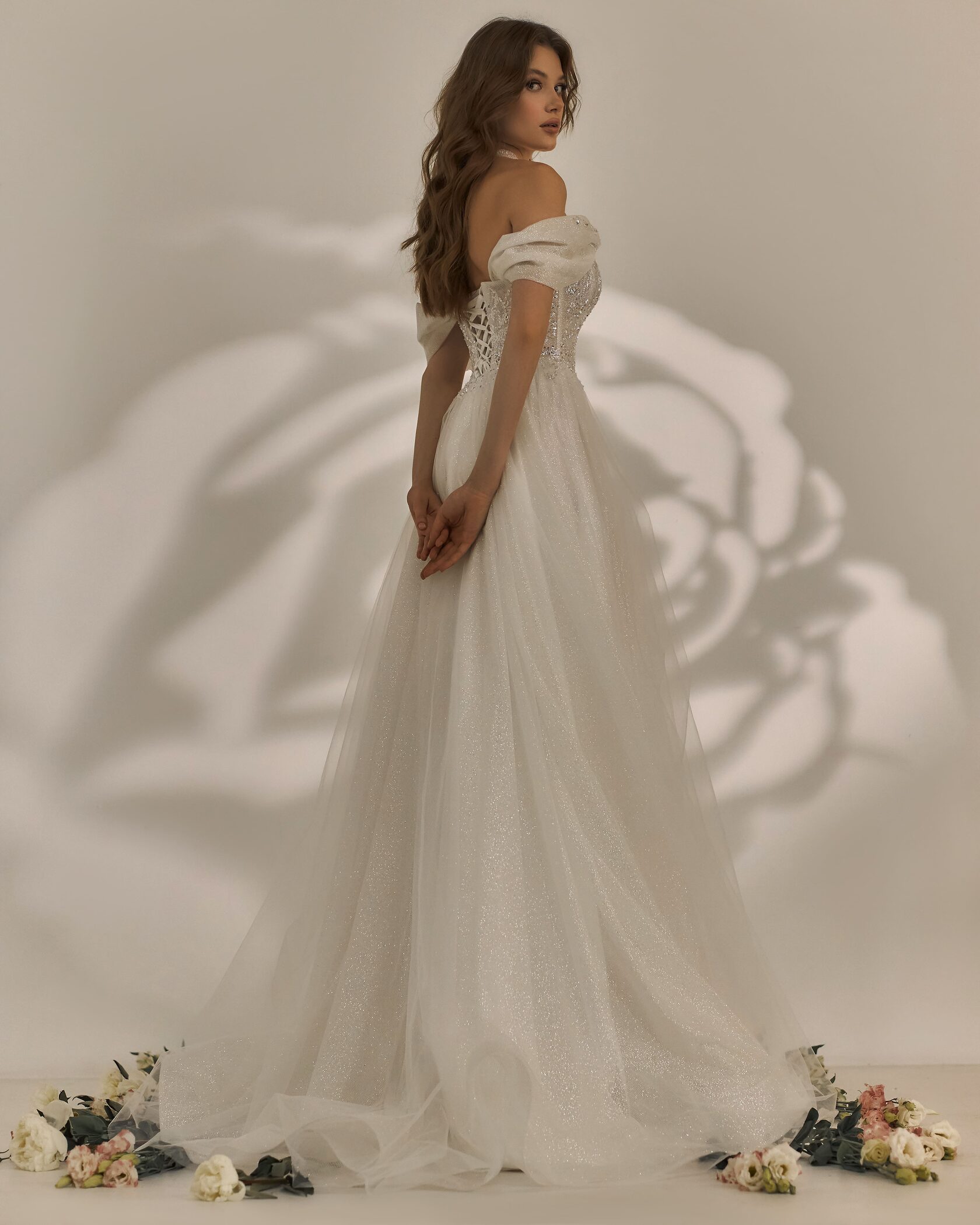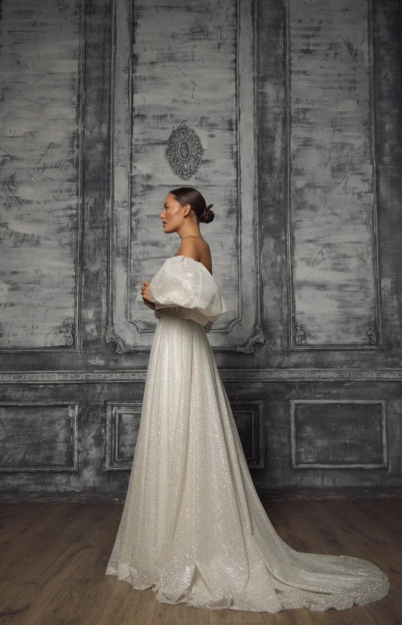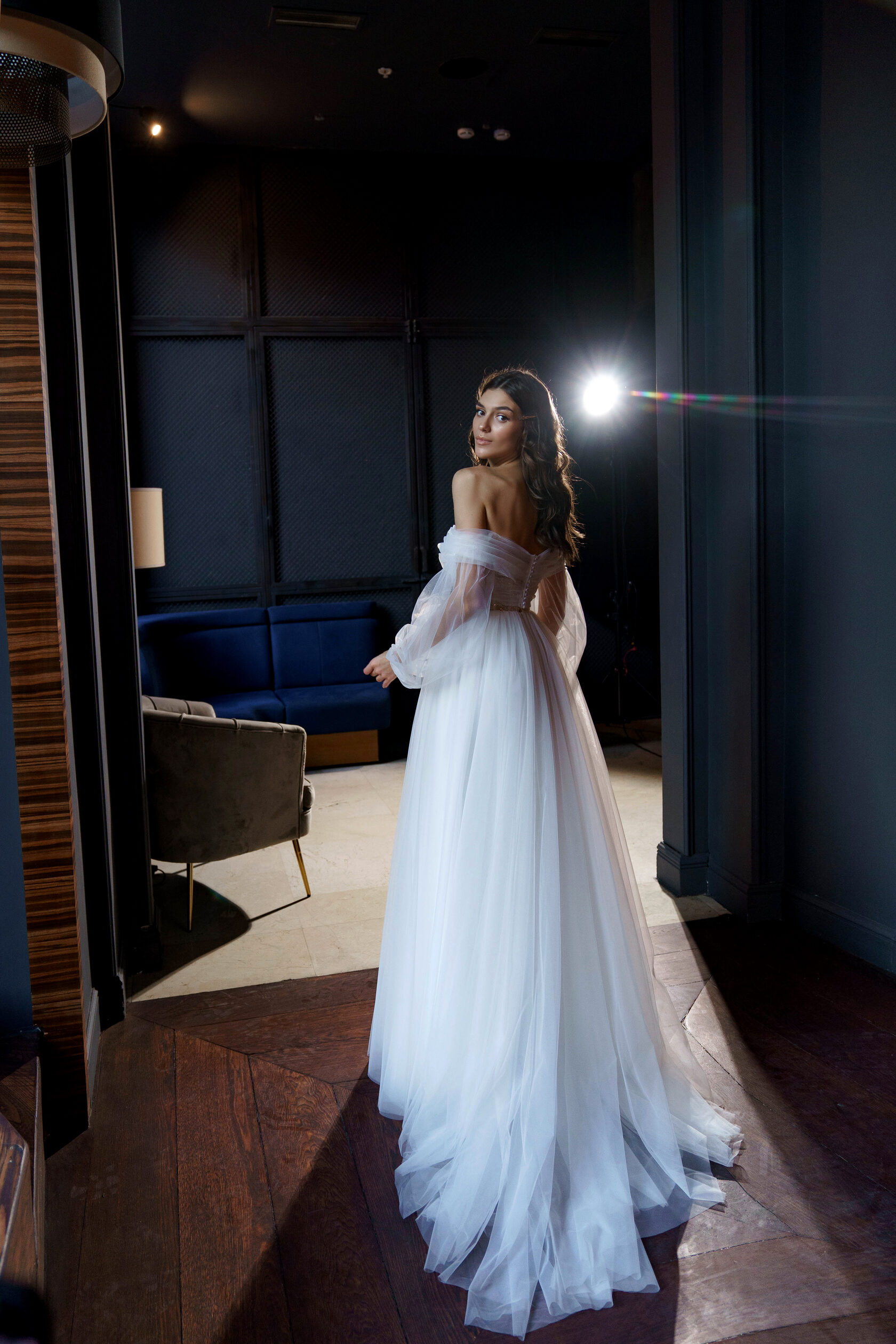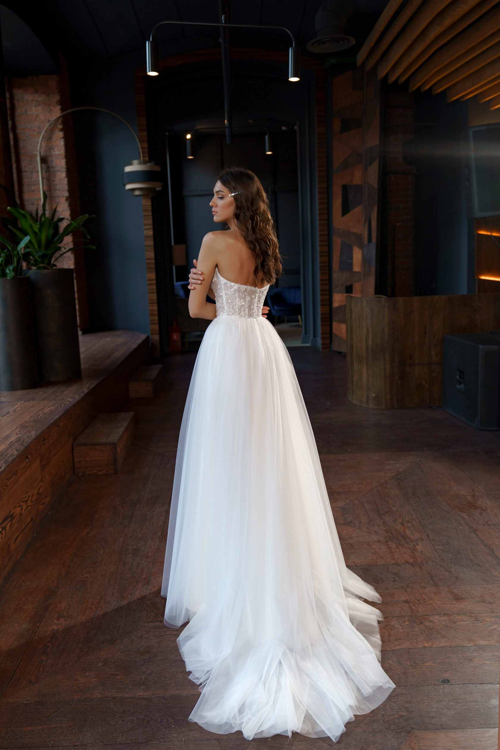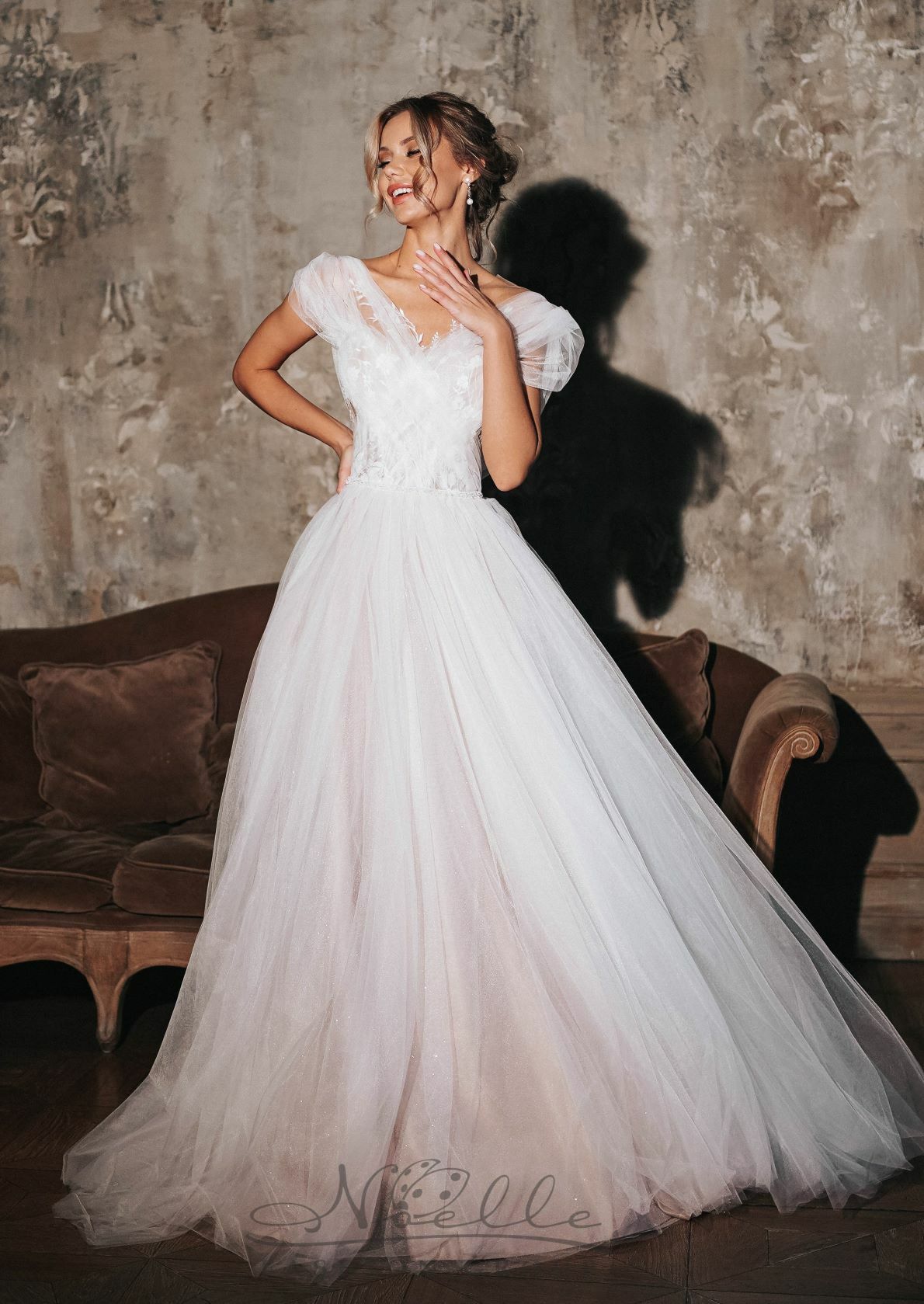 Воздушная юбка с добавлением мерцания из росшива ювелирной пайетки, открытая до талии спина. Модель без корсета, застегивается на молнию.