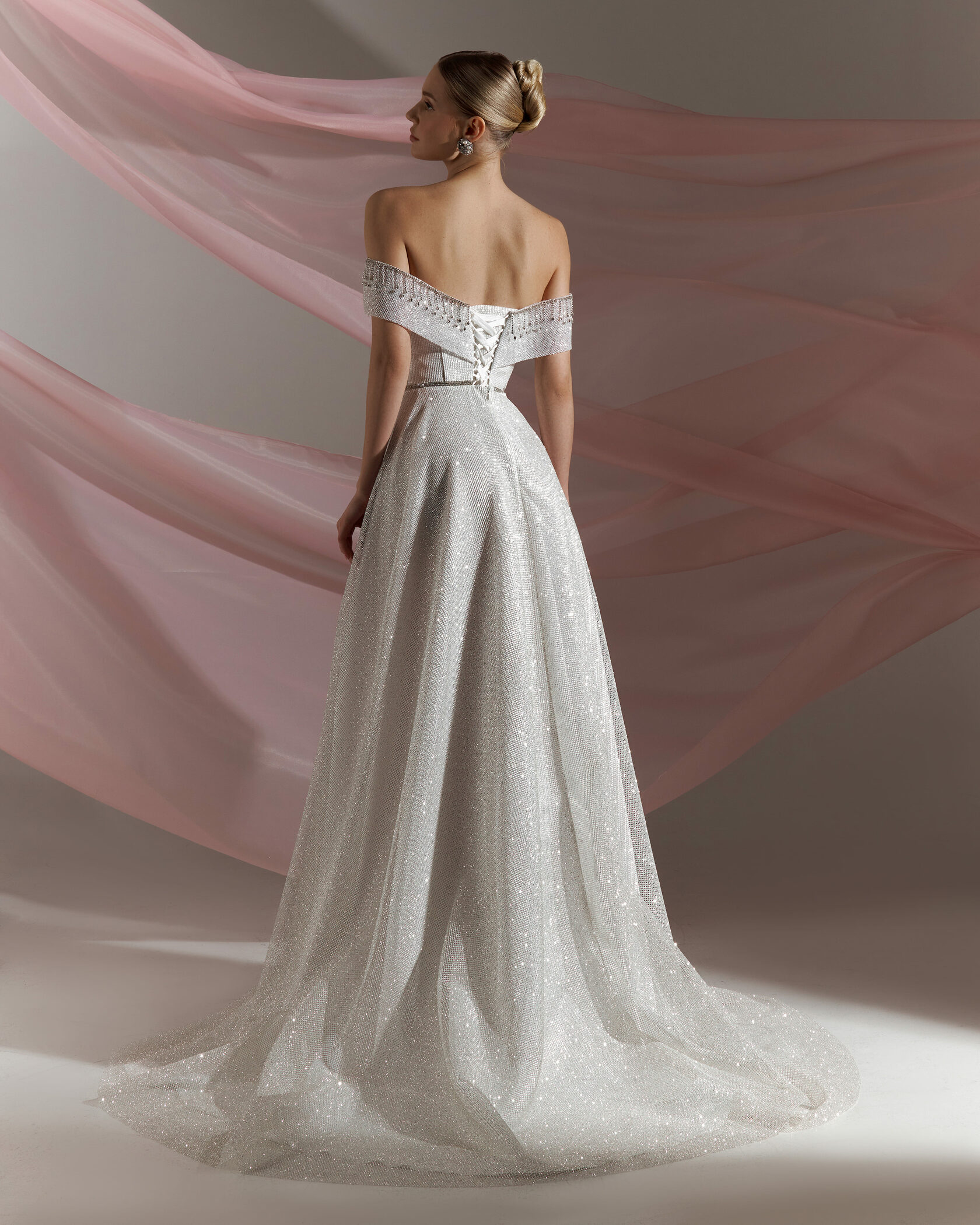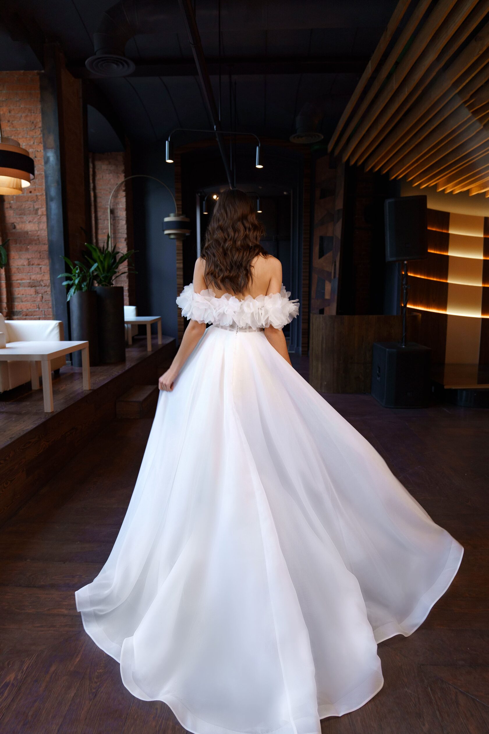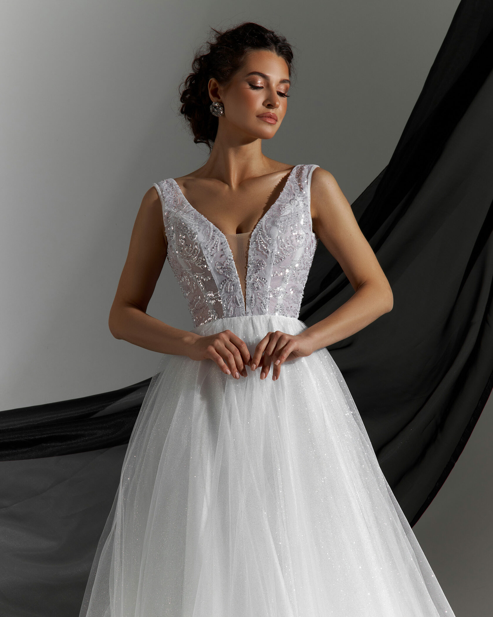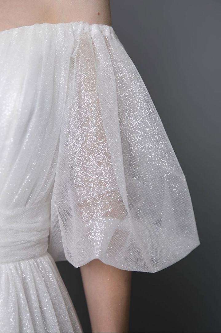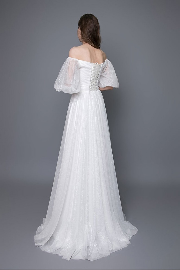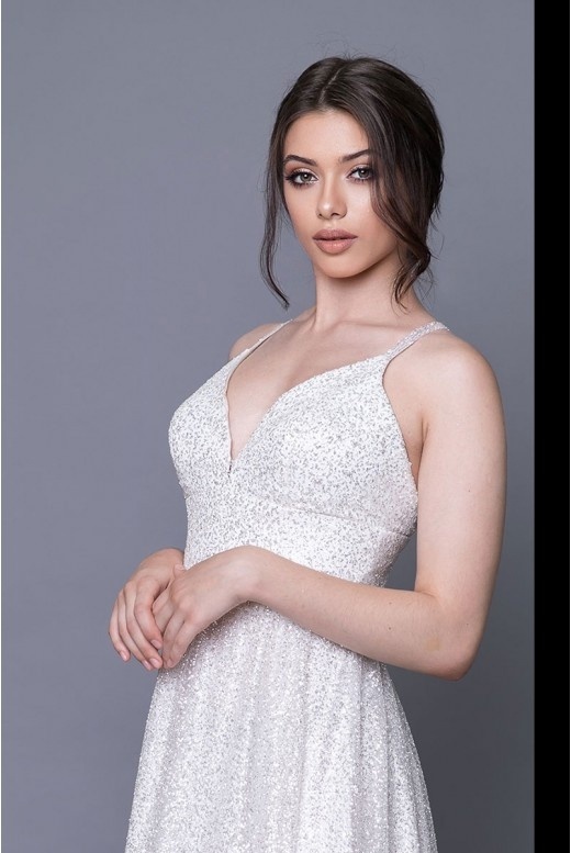 Воздушная юбка с добавлением мерцания из росшива ювелирной пайетки, открытая до талии спина. Модель без корсета, застегивается на молнию.