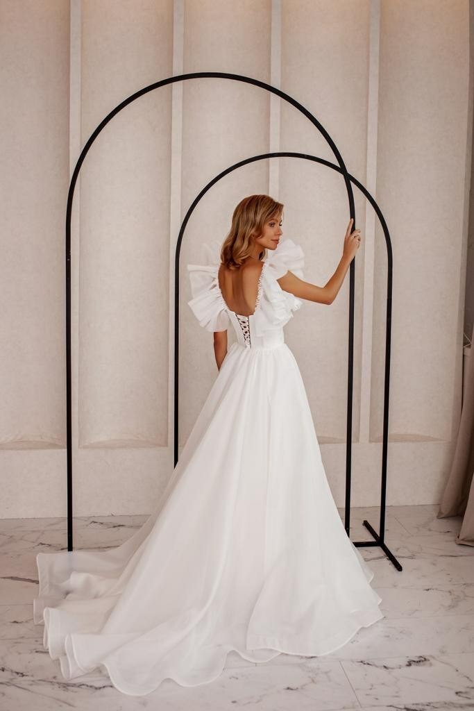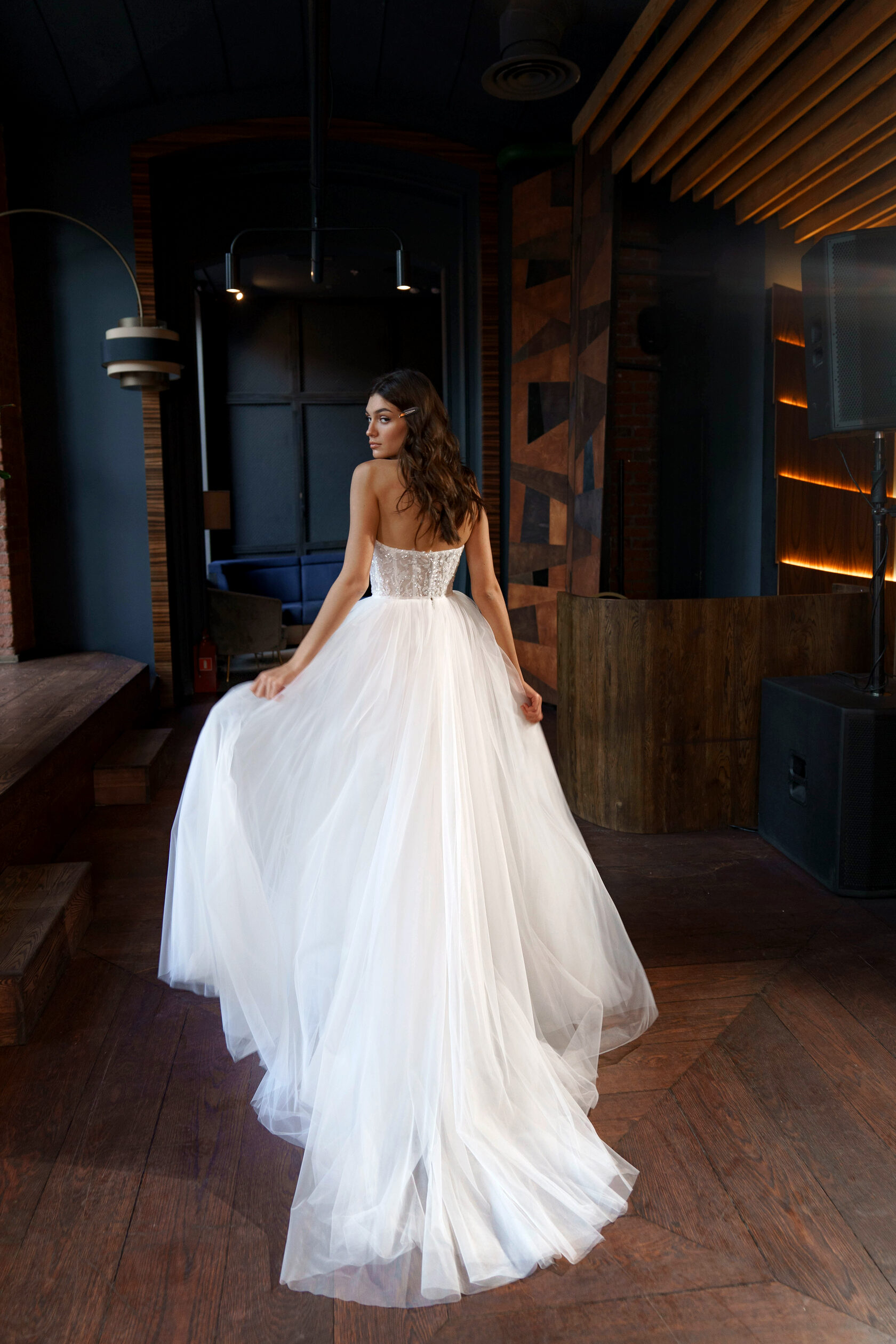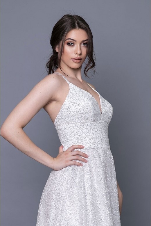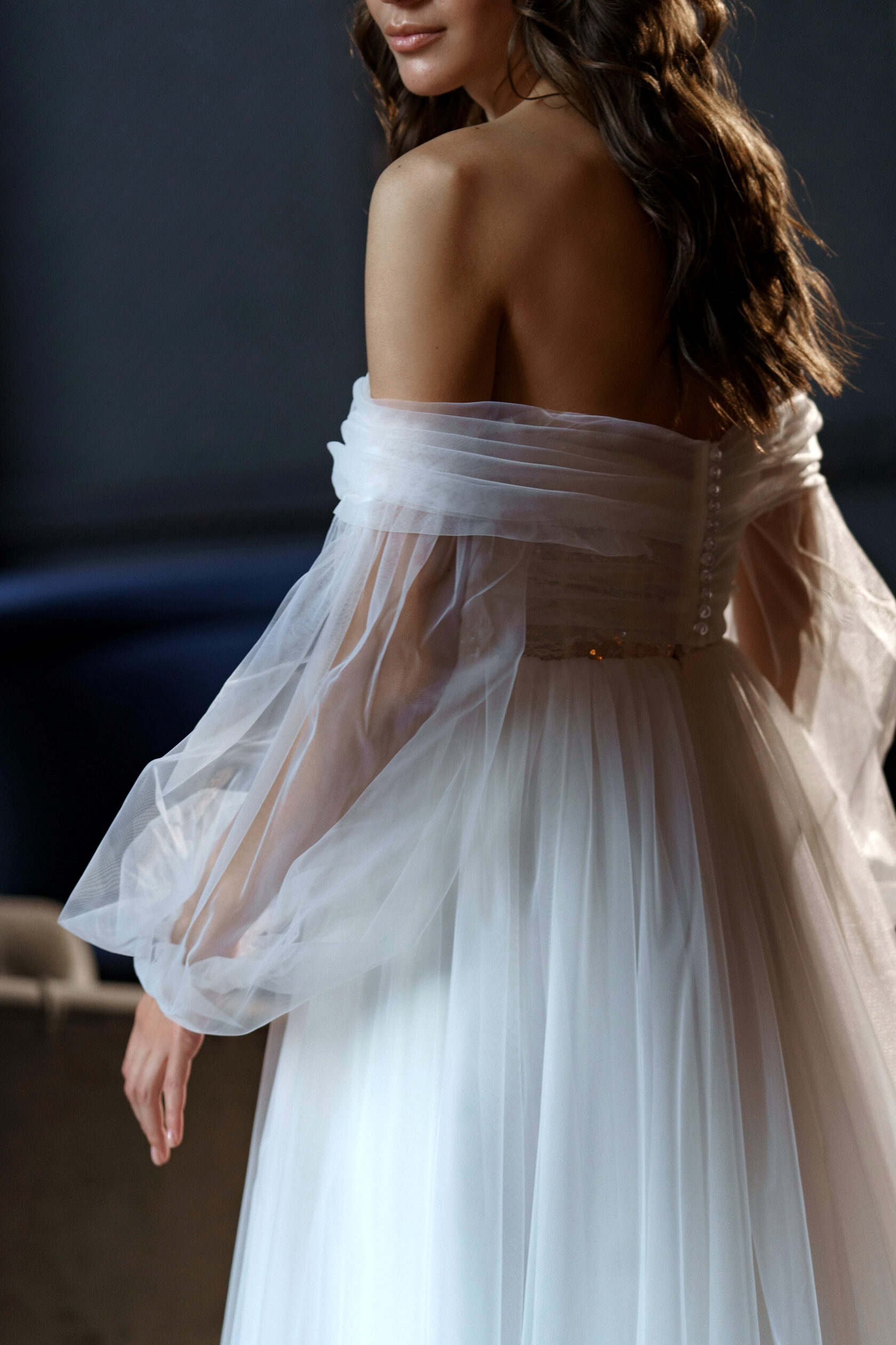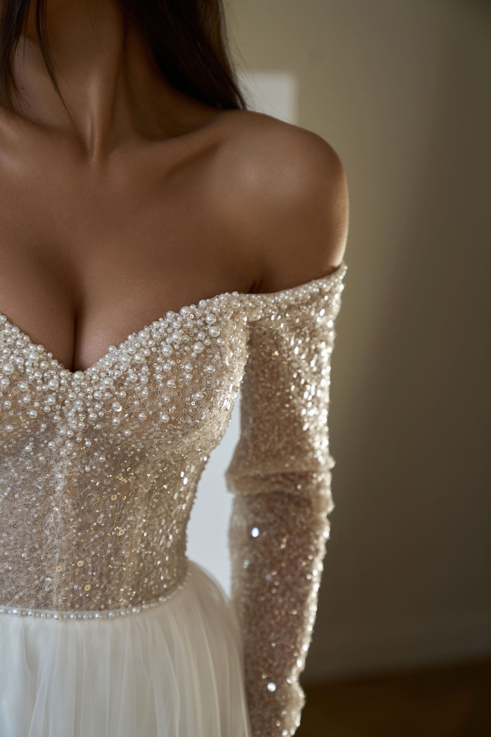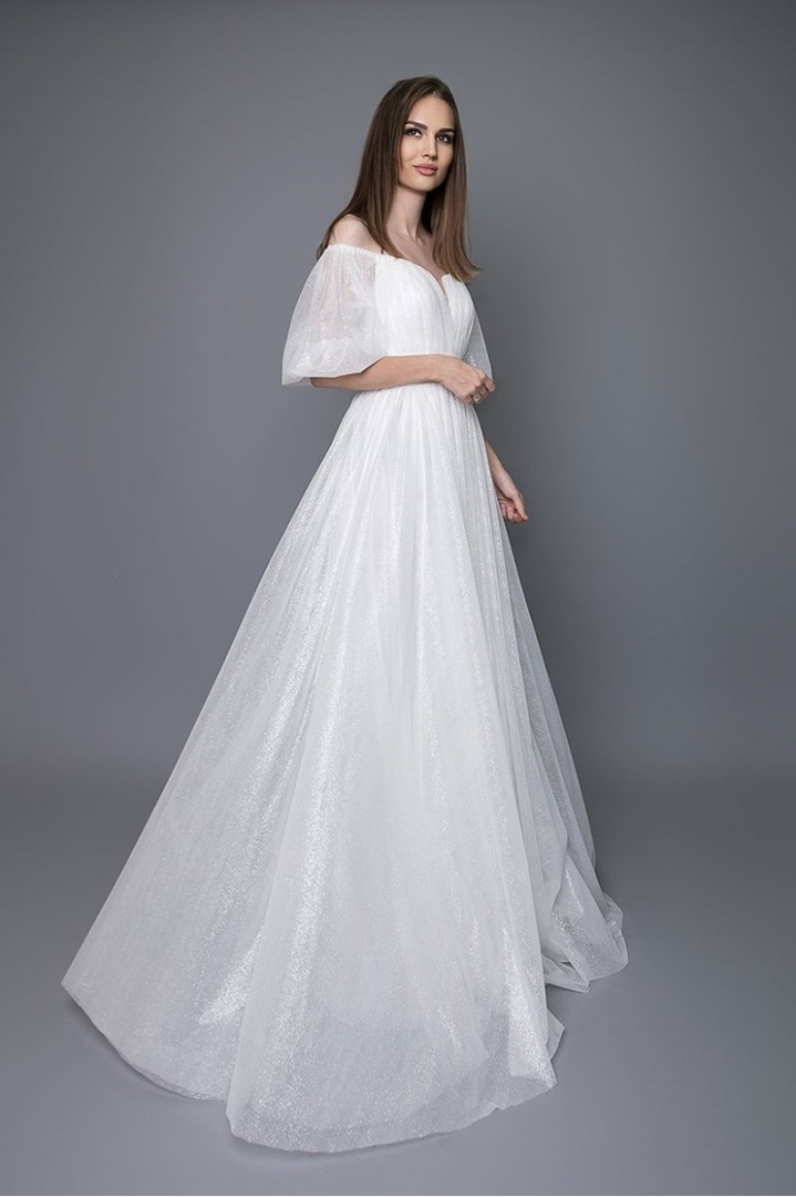 Воздушная юбка с добавлением мерцания из росшива ювелирной пайетки, открытая до талии спина. Модель без корсета, застегивается на молнию.