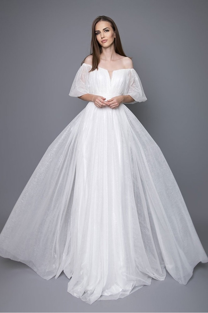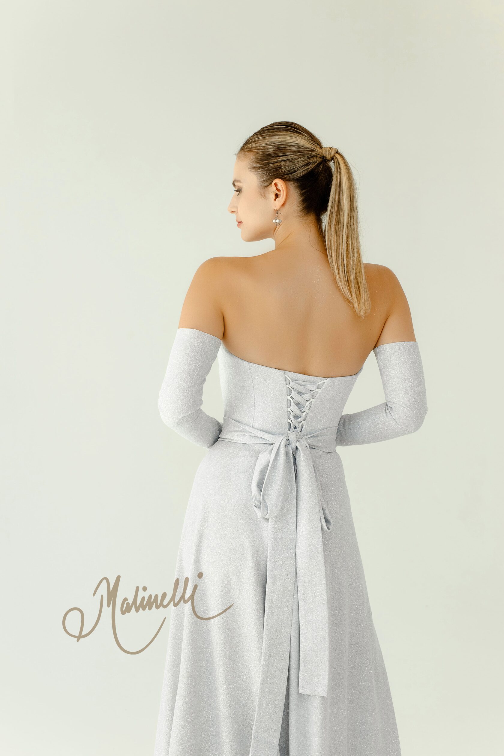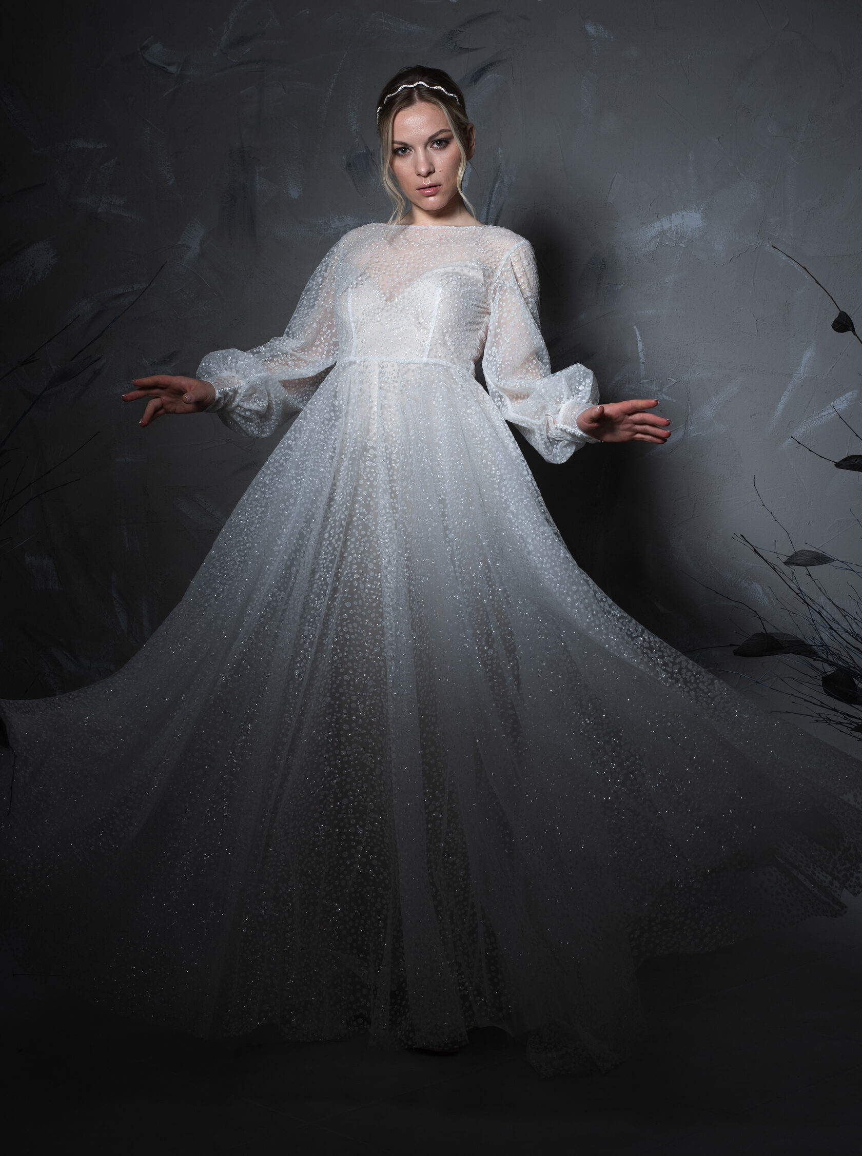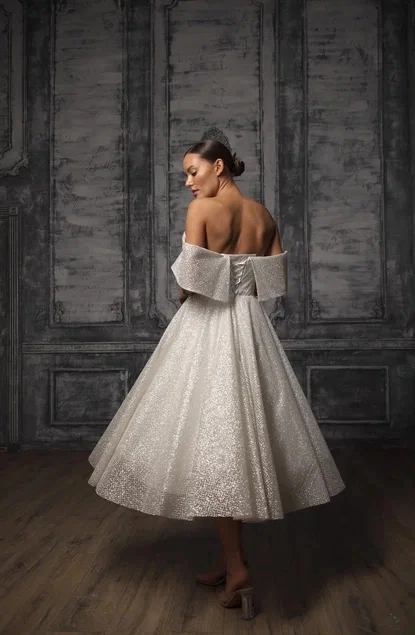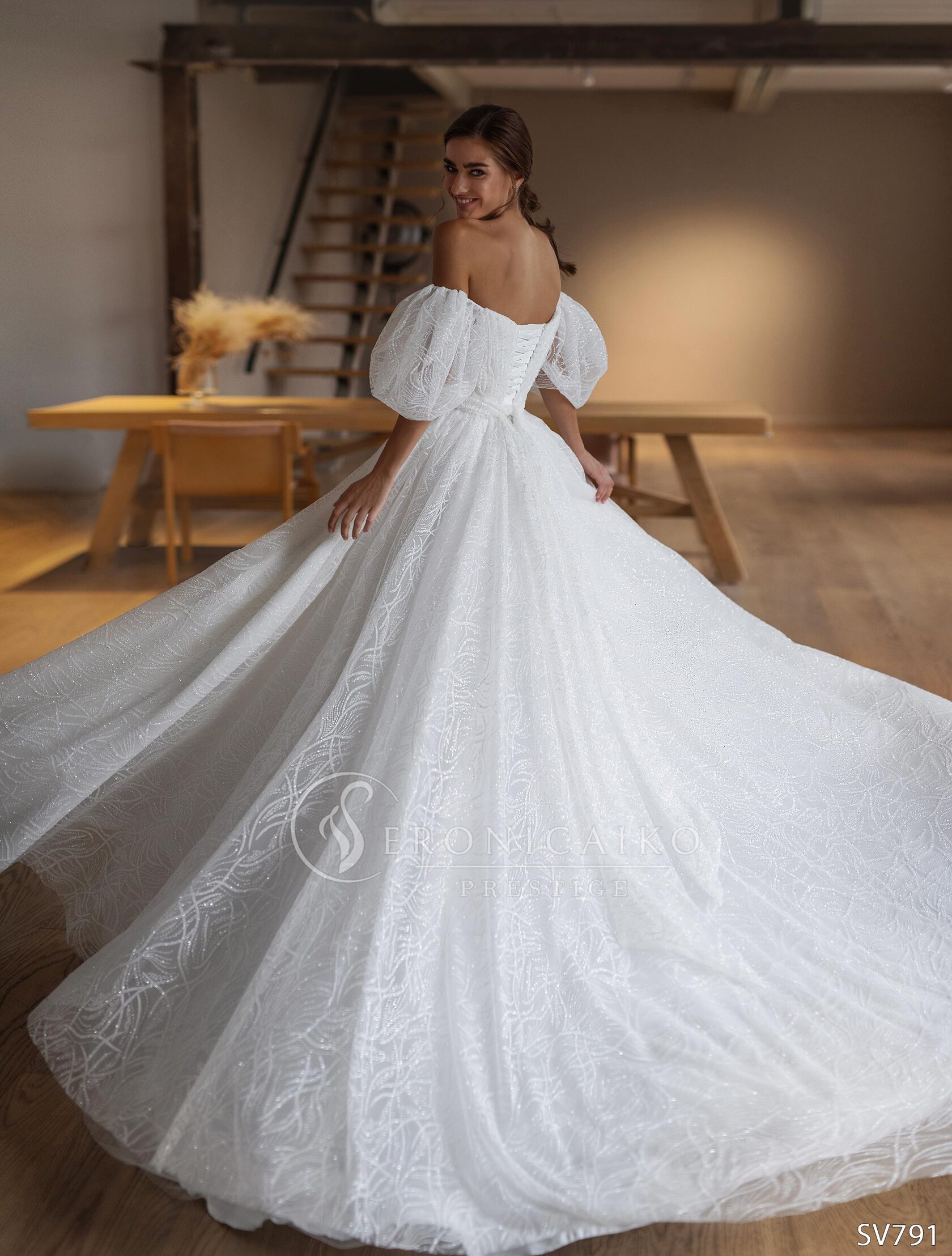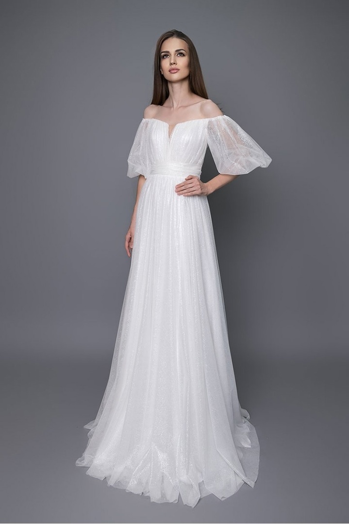 Воздушная юбка с добавлением мерцания из росшива ювелирной пайетки, открытая до талии спина. Модель без корсета, застегивается на молнию.