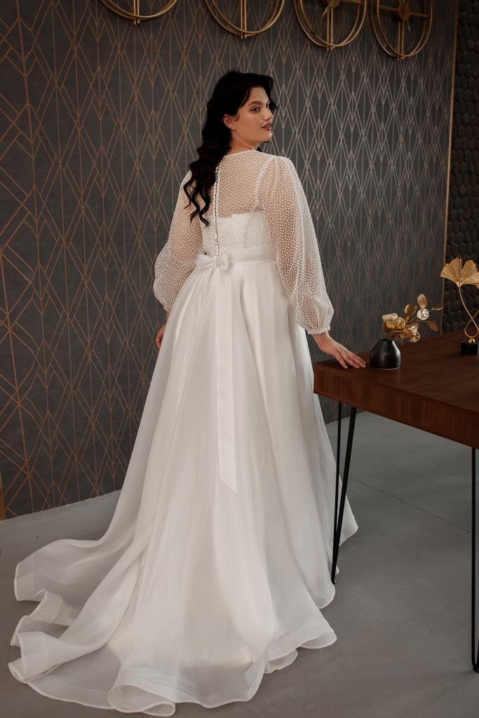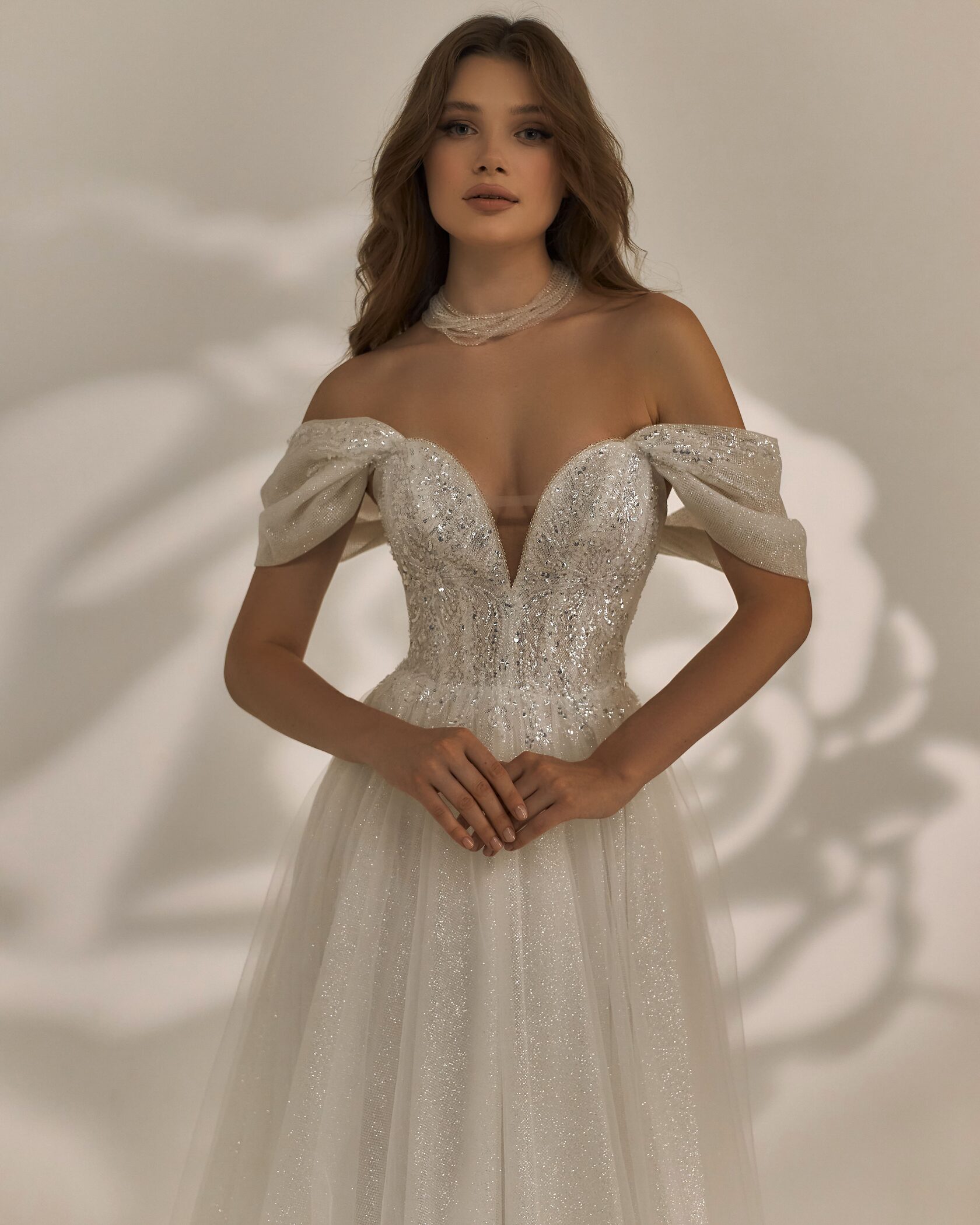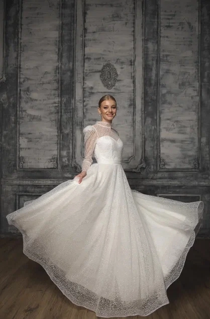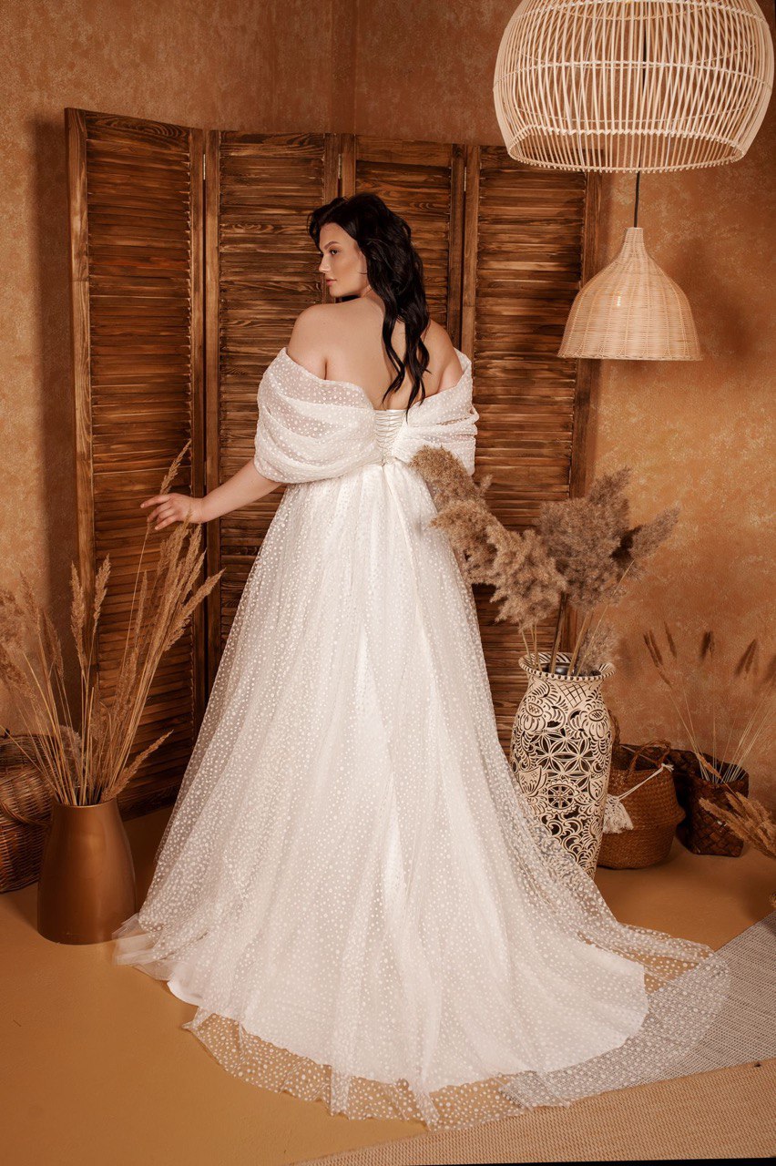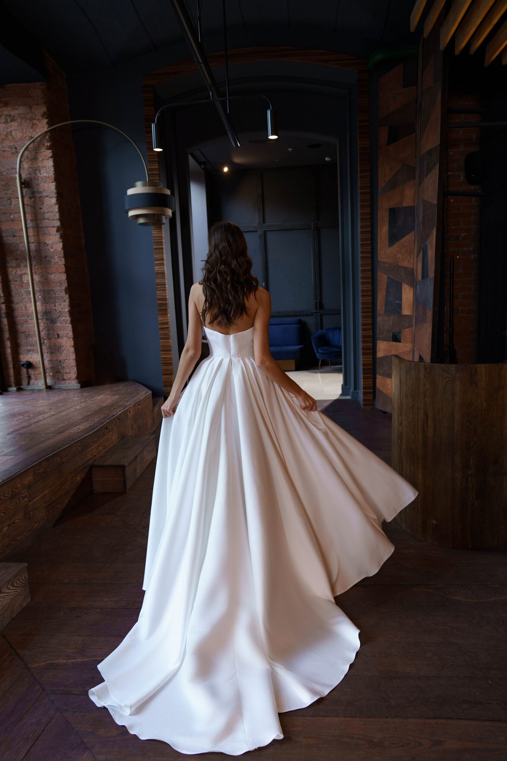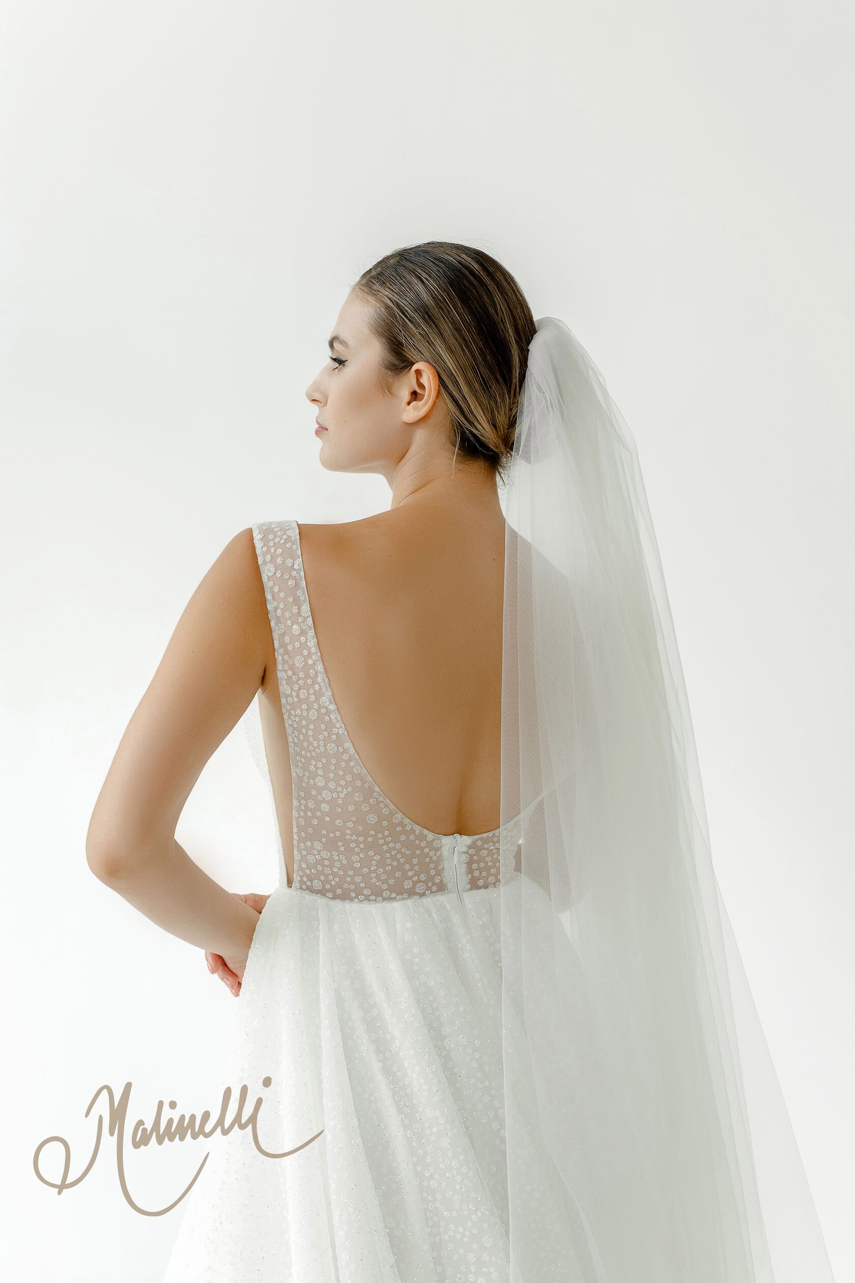 Воздушная юбка с добавлением мерцания из росшива ювелирной пайетки, открытая до талии спина. Модель без корсета, застегивается на молнию.