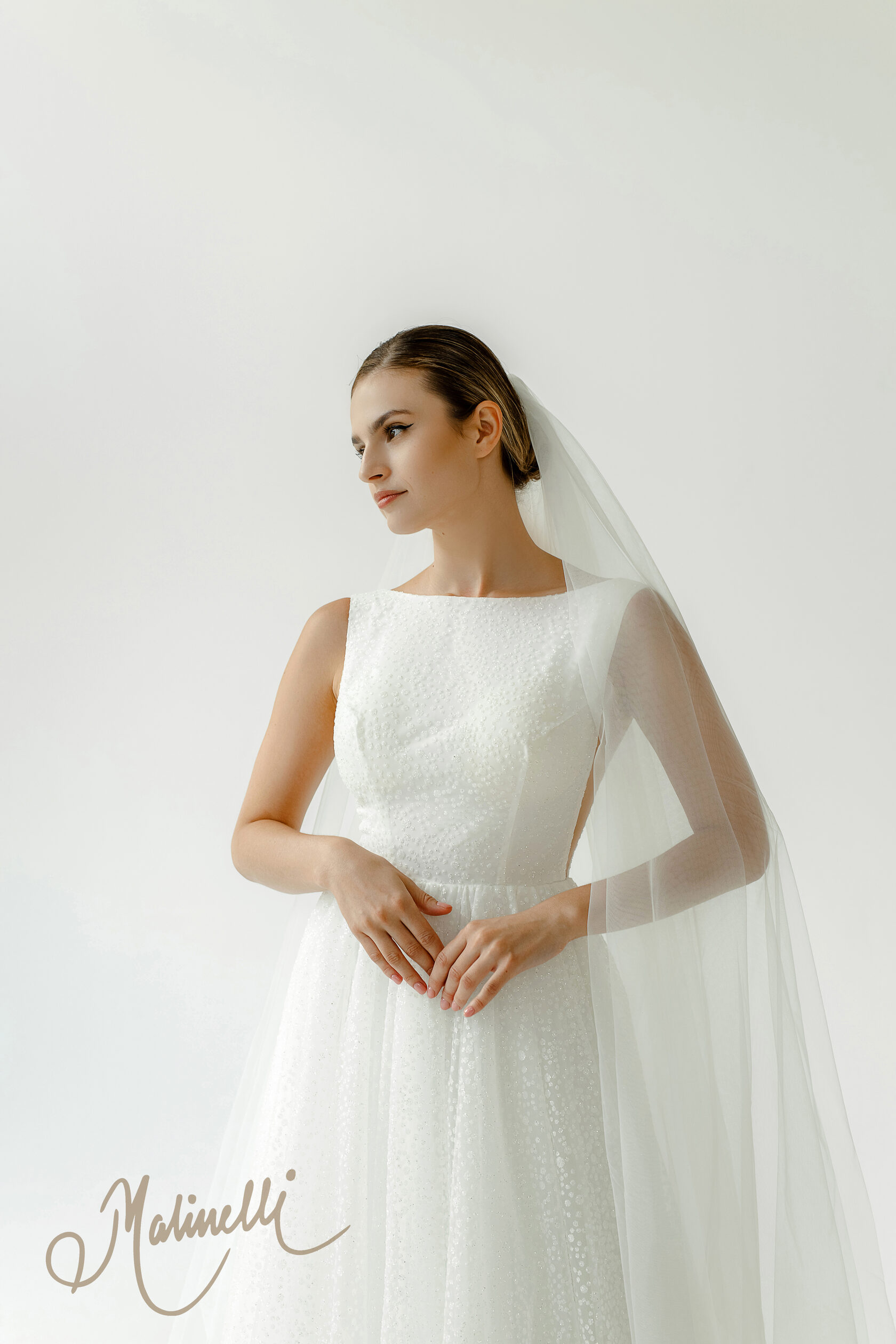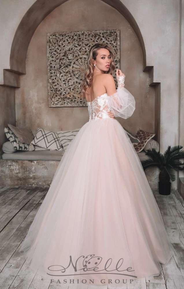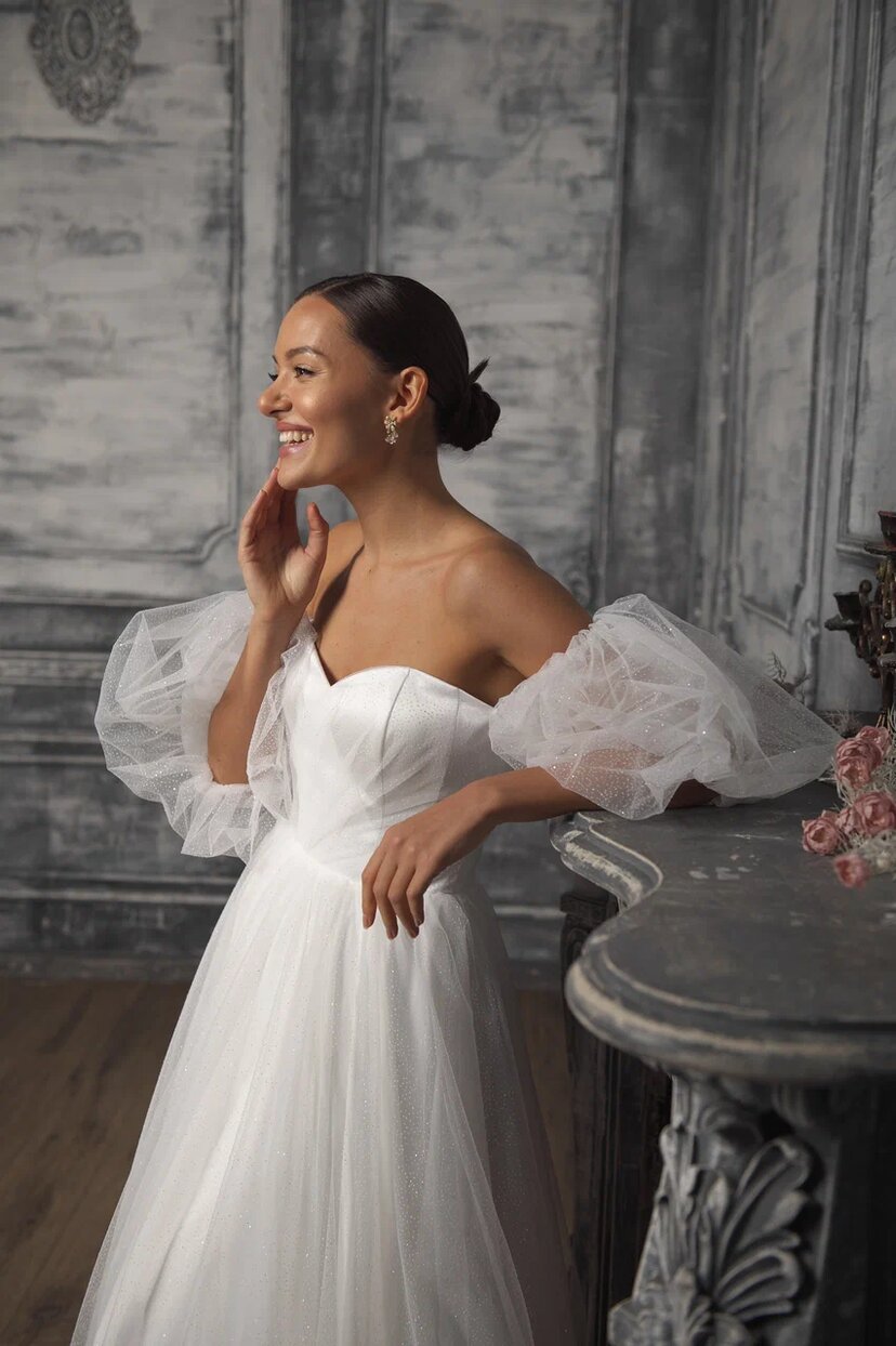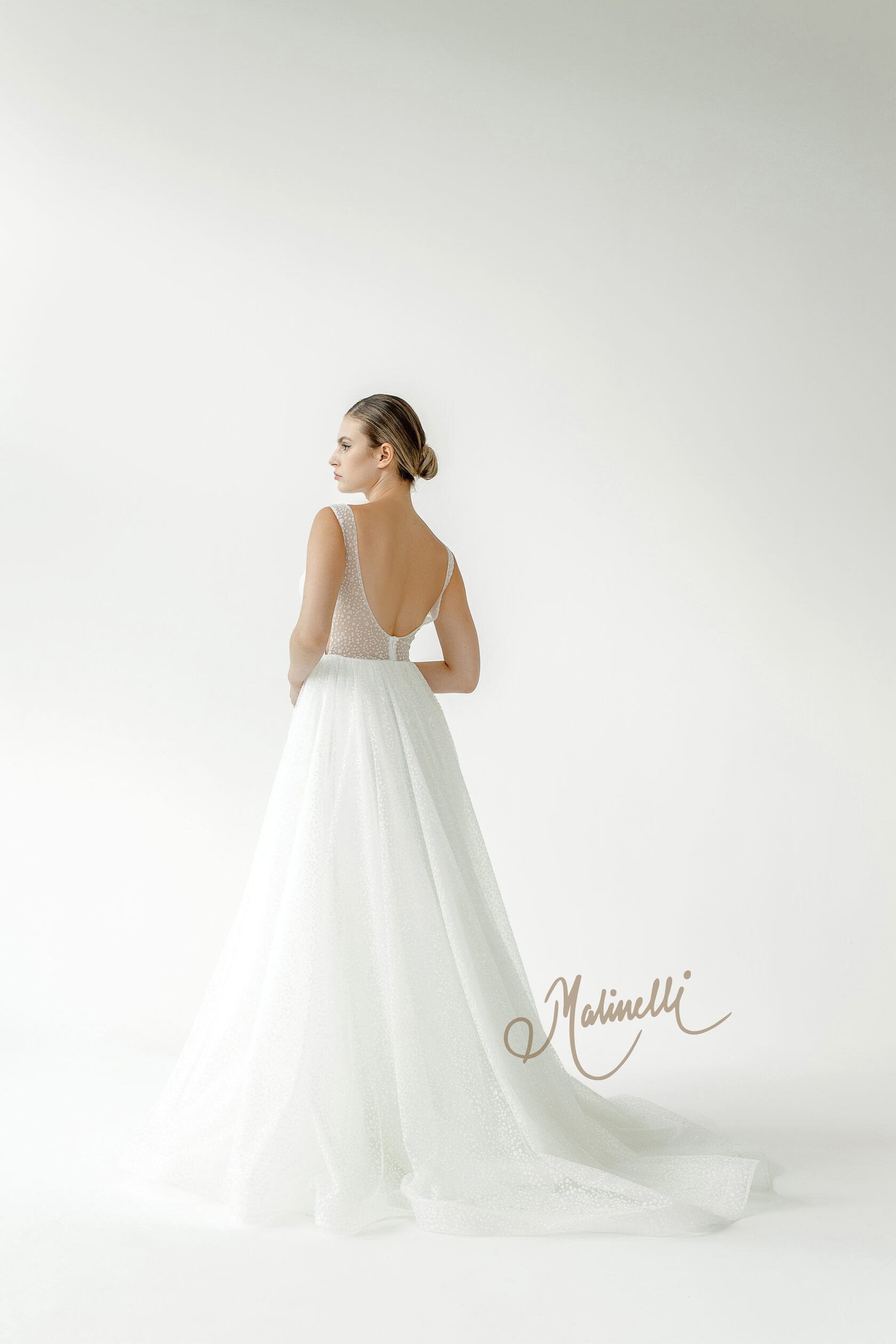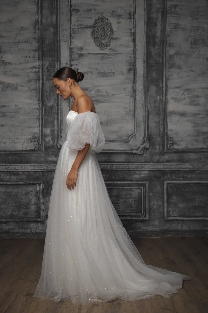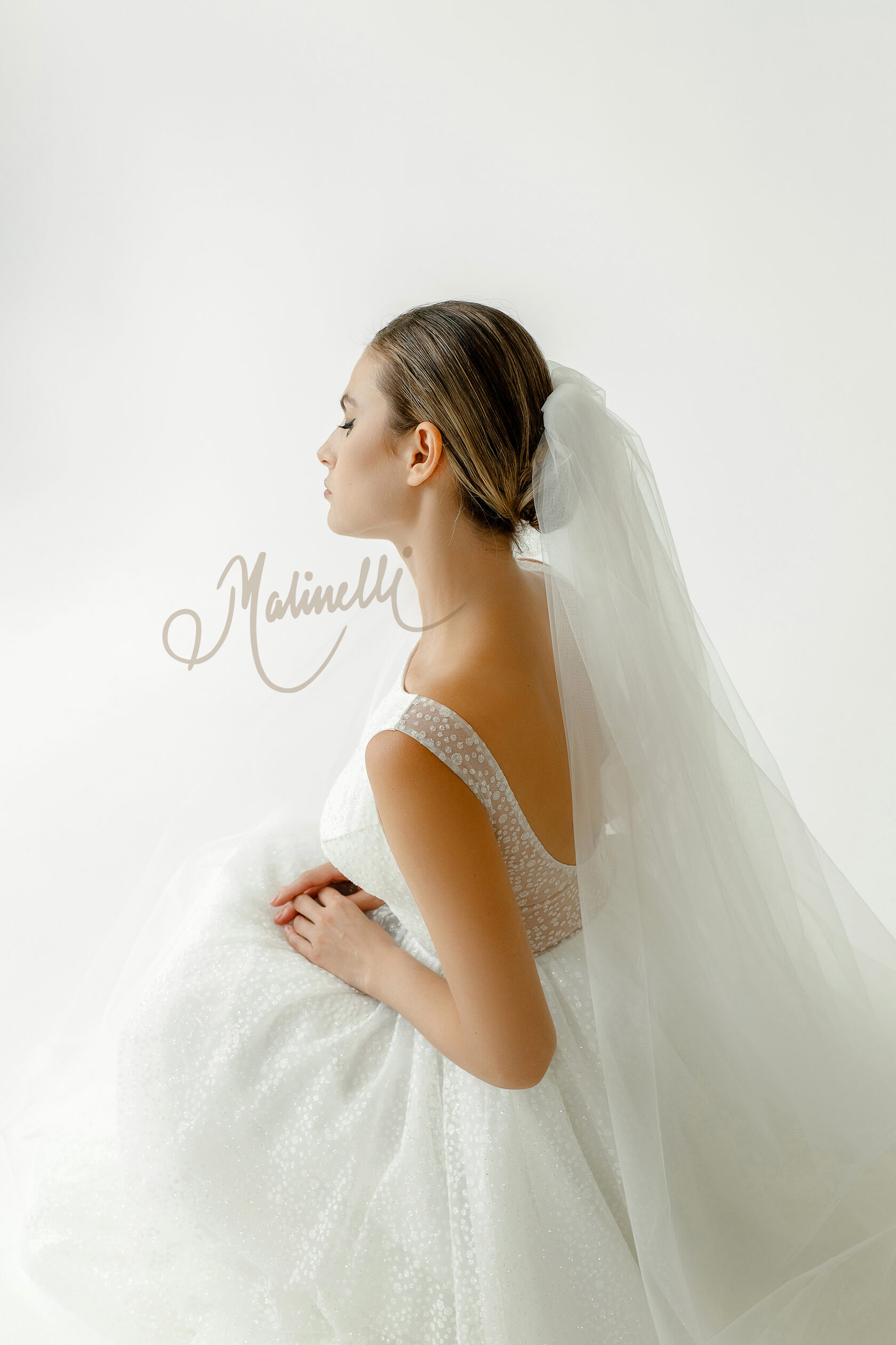 Воздушная юбка с добавлением мерцания из росшива ювелирной пайетки, открытая до талии спина. Модель без корсета, застегивается на молнию.