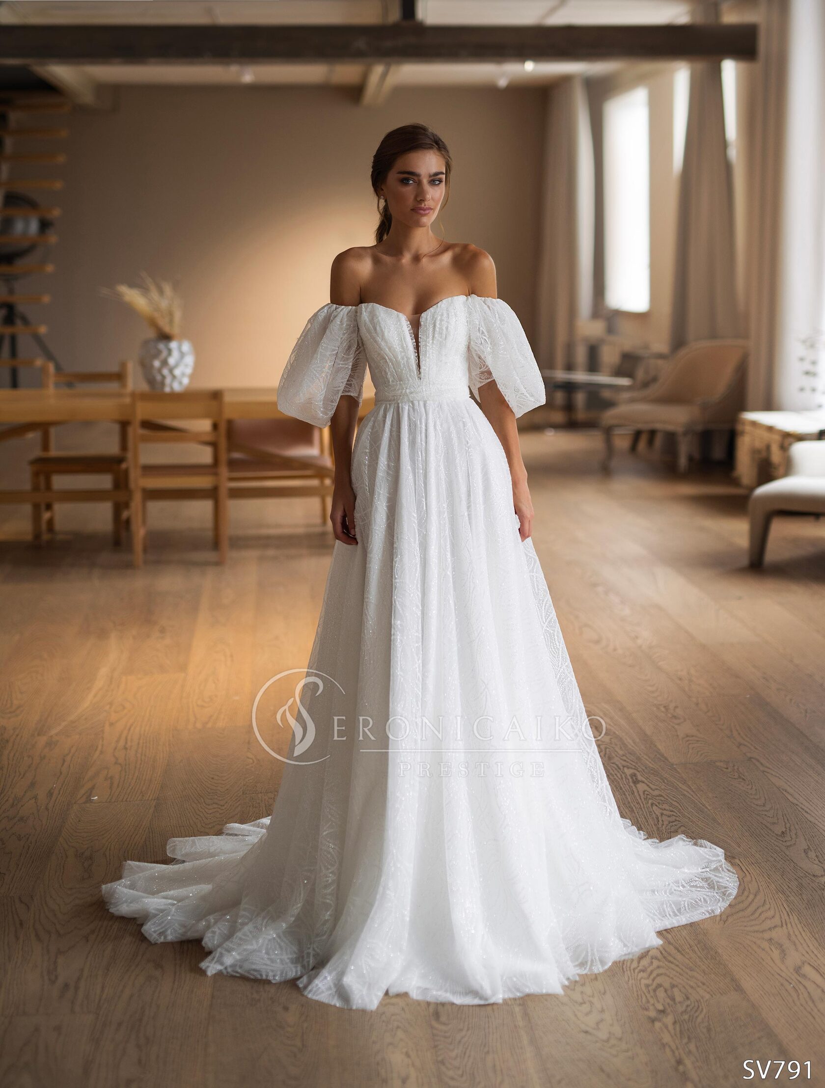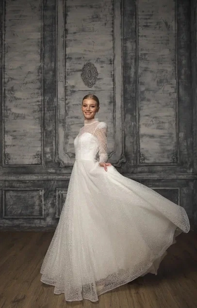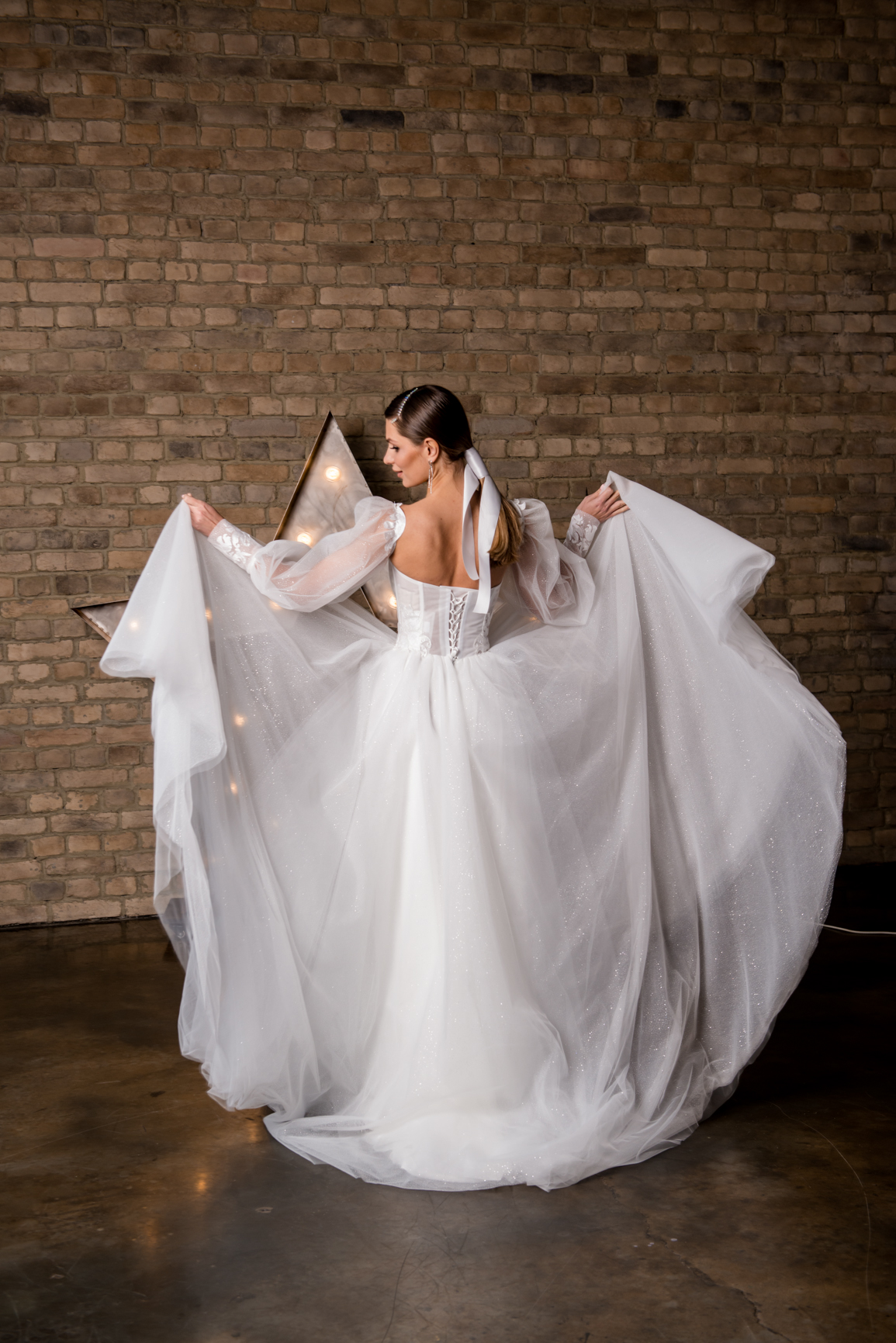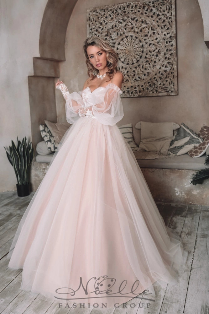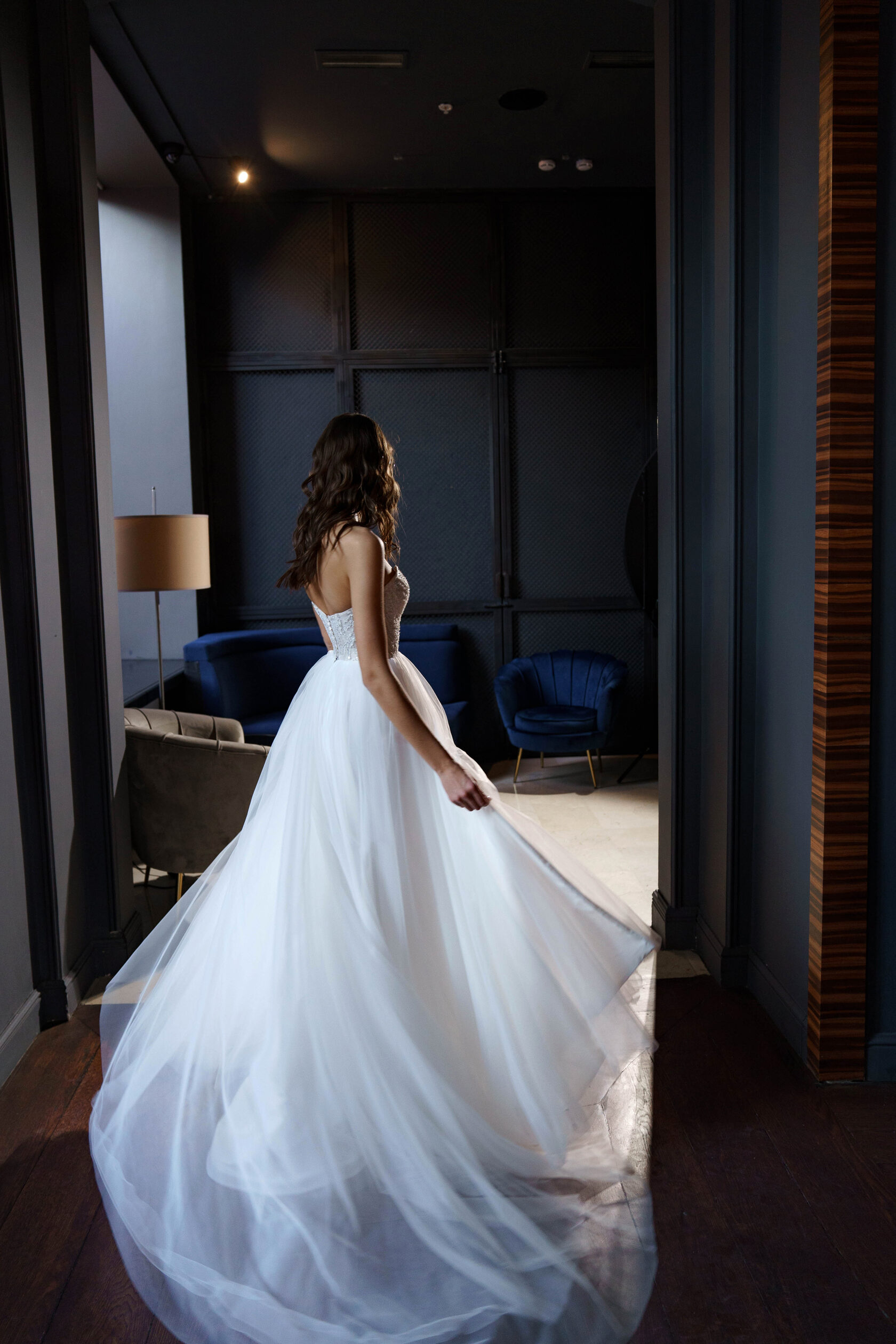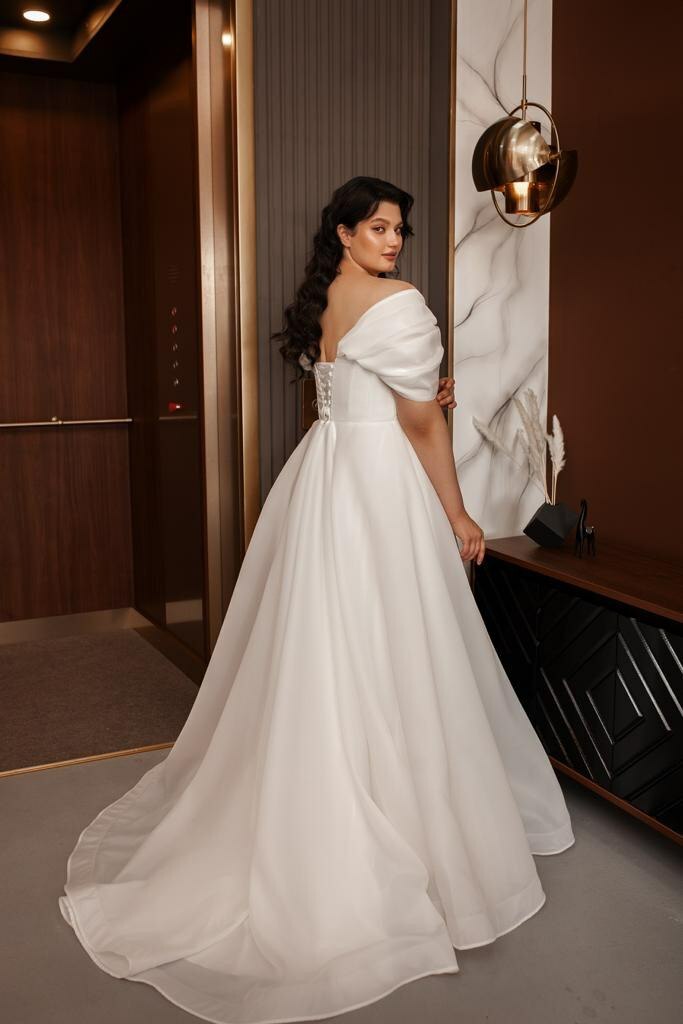 Воздушная юбка с добавлением мерцания из росшива ювелирной пайетки, открытая до талии спина. Модель без корсета, застегивается на молнию.