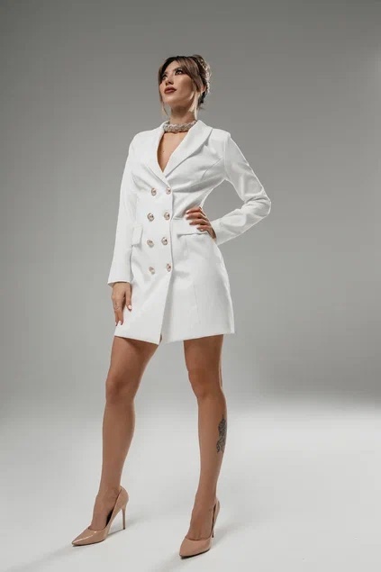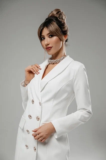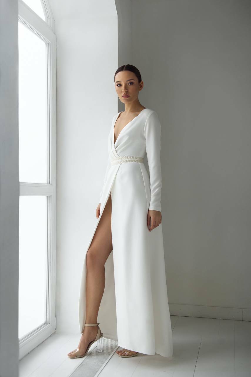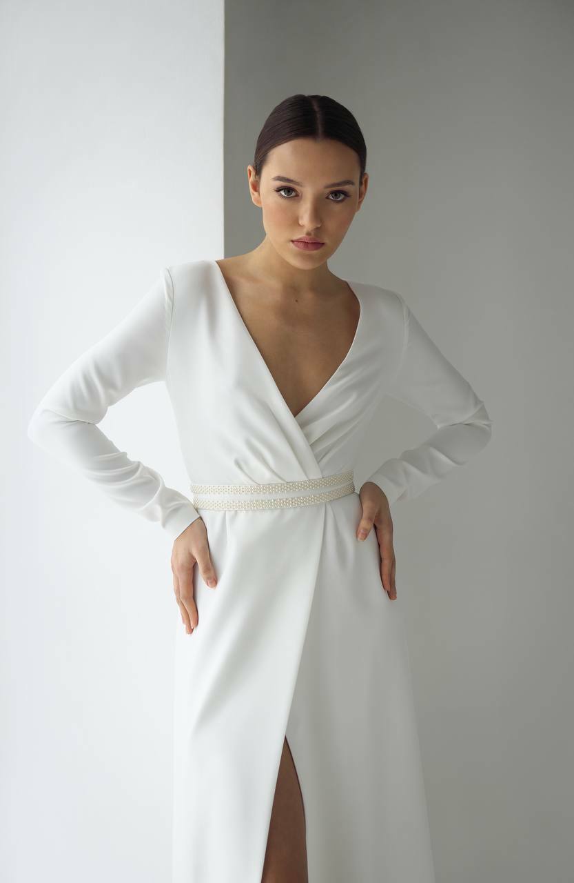 Модель А-силуэта с разрезом по ножке и длинным рукавом , V-образный вырез на запах, подчёркивает талию… Все самые удачные тенденции сочетаются в этой необыкновенной модели.