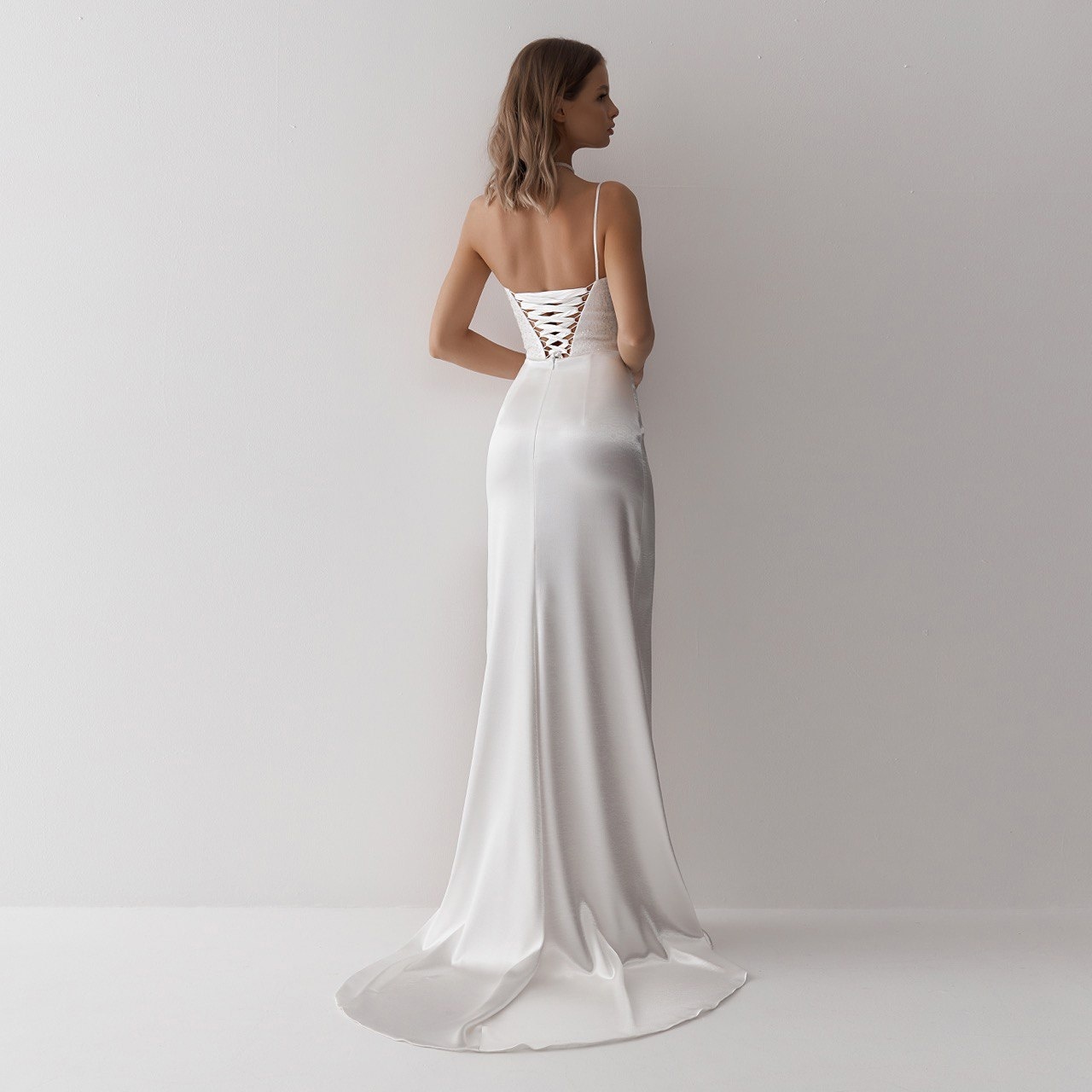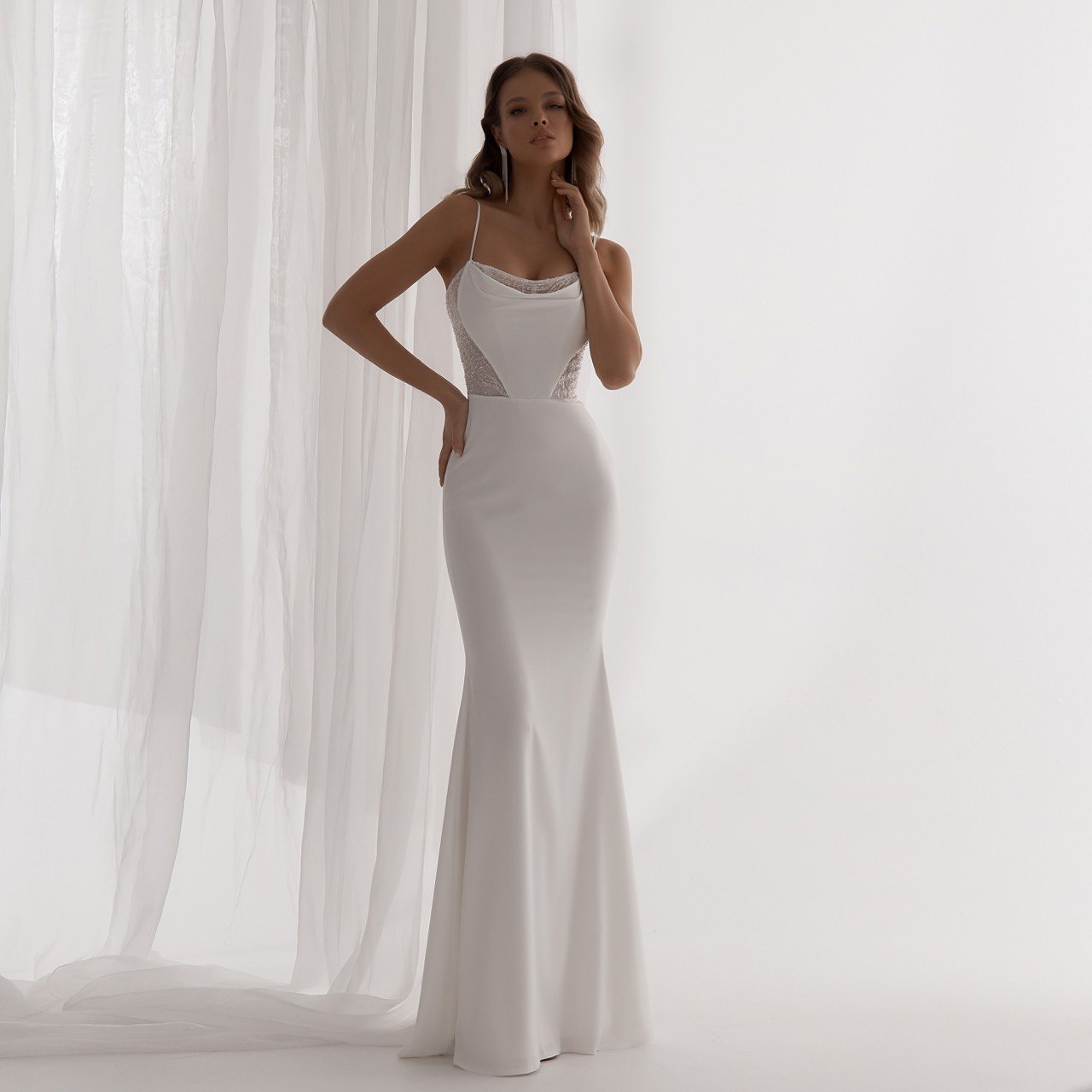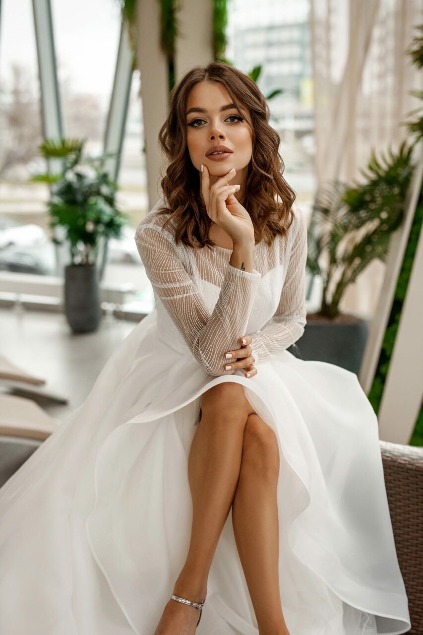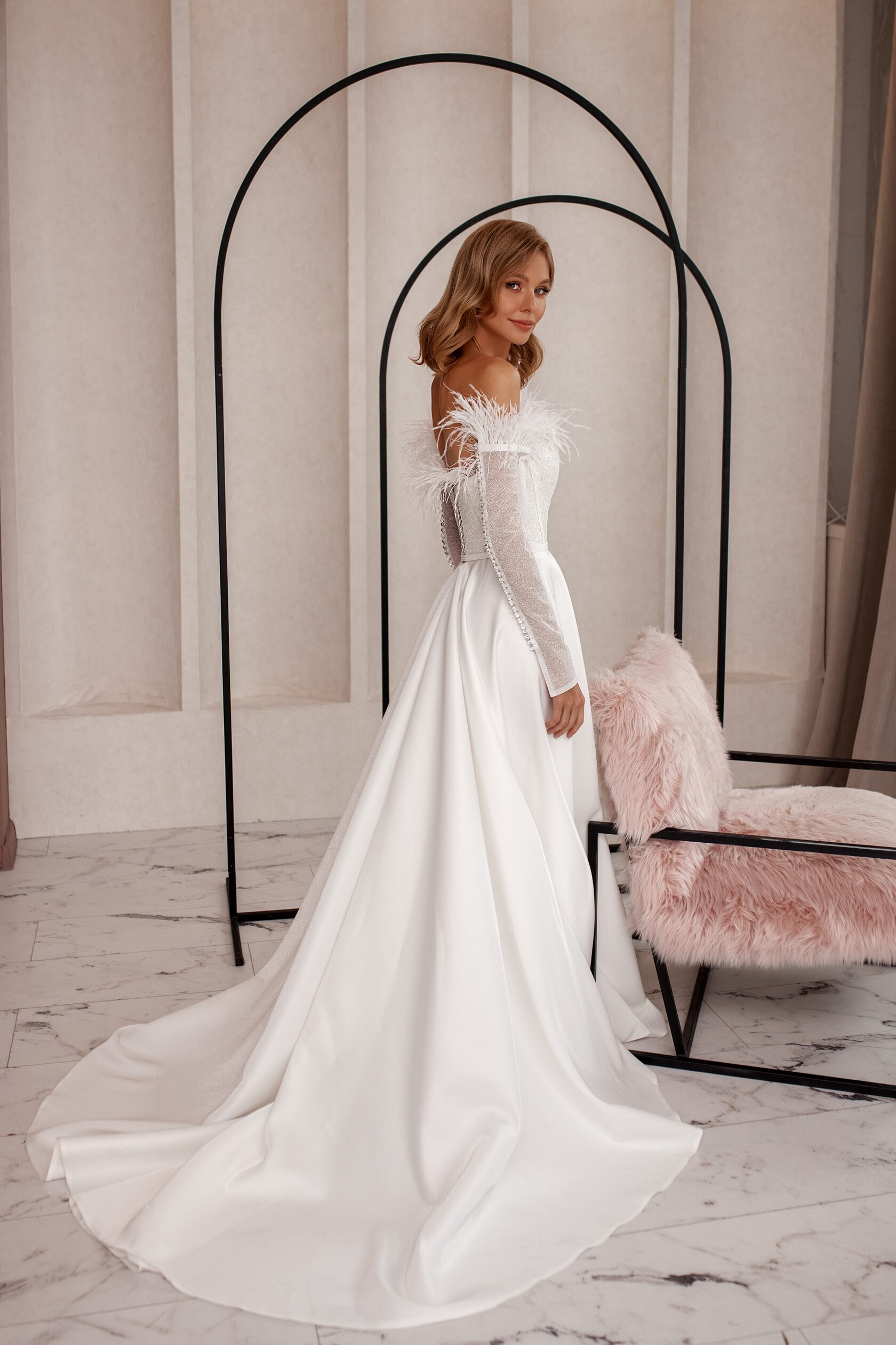 Такое платье подчеркнёт Вашу индивидуальность и стиль. После торжественной регистрации можно снять верхний слой и Вы будете в лаконичной жемчужной комбинации!