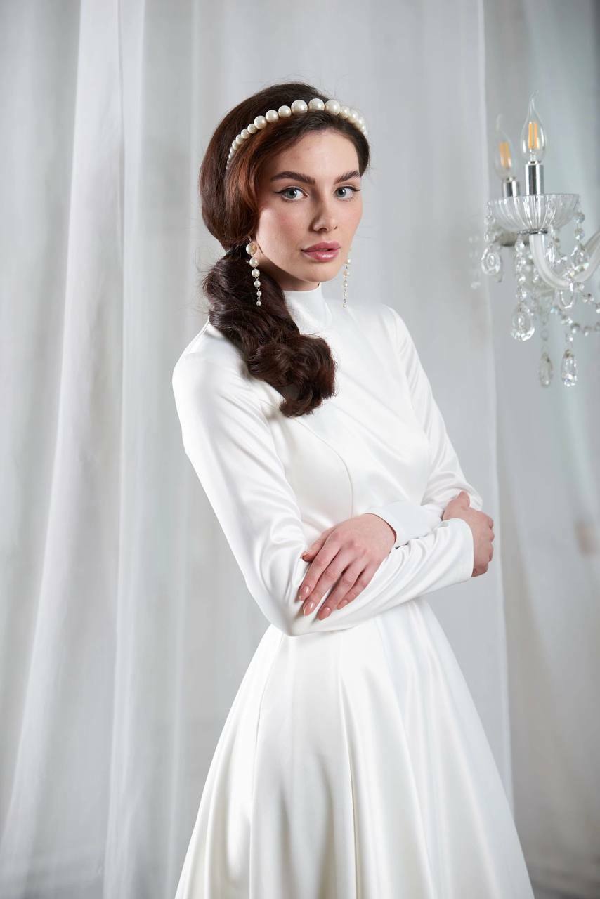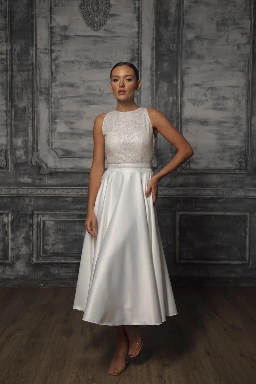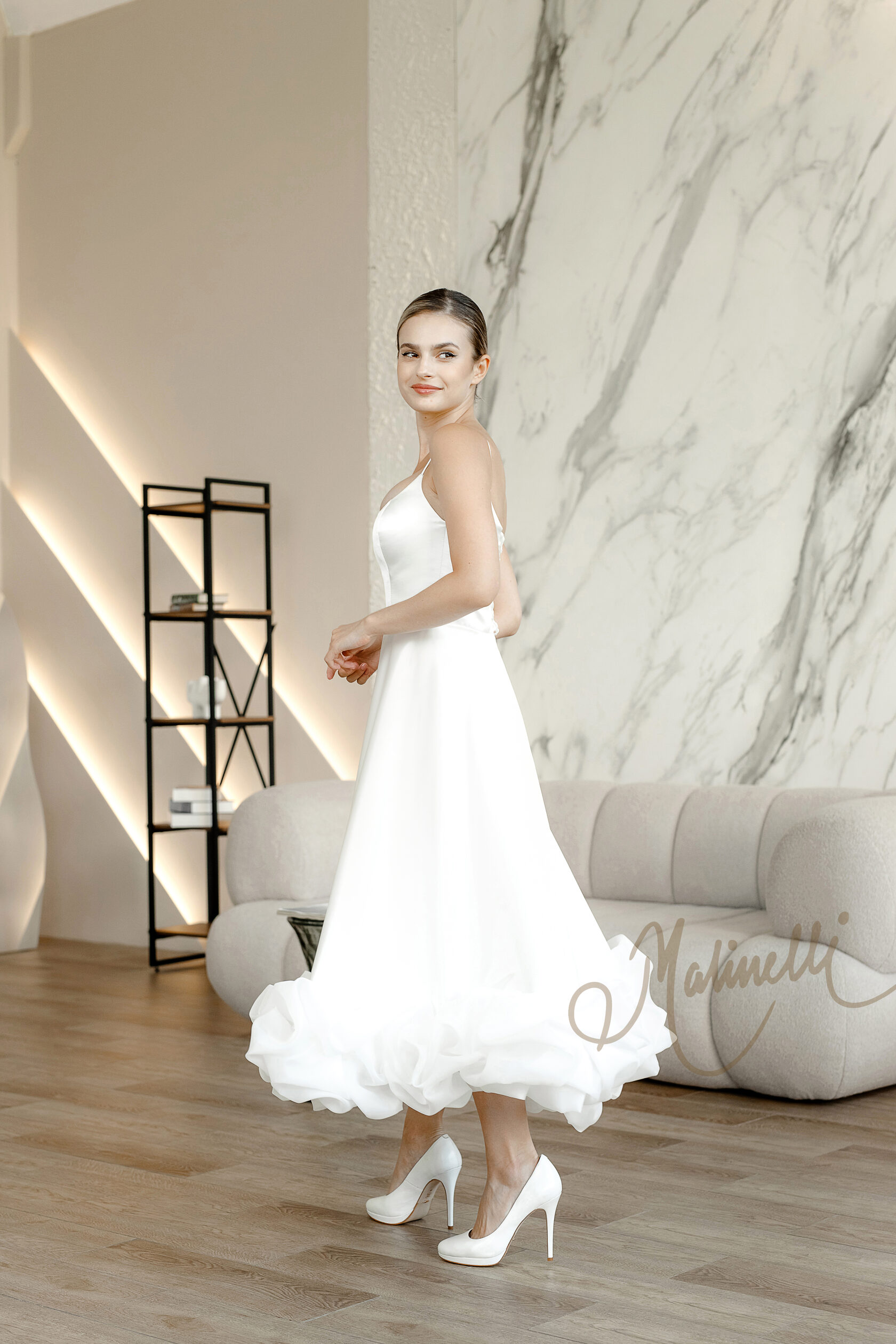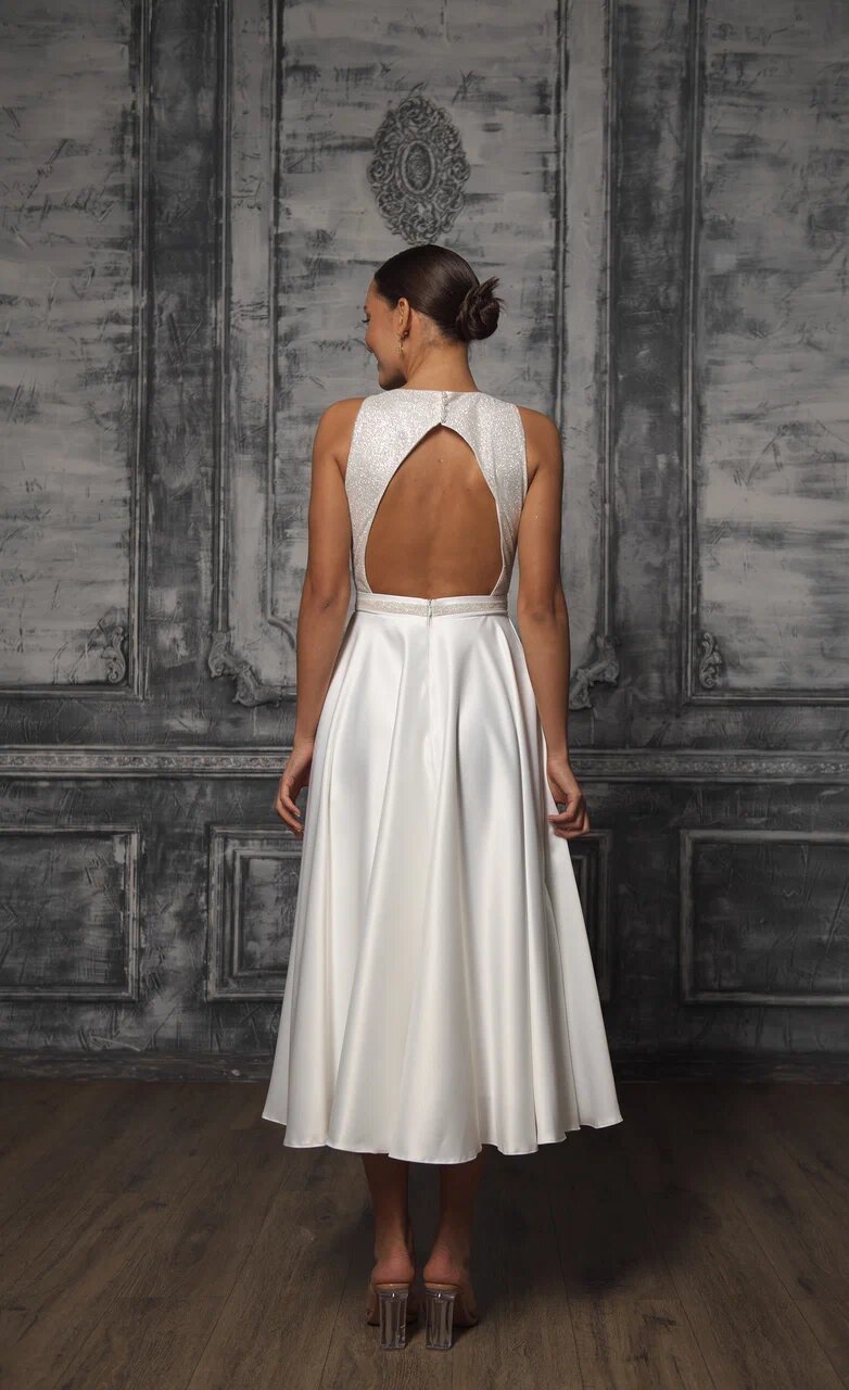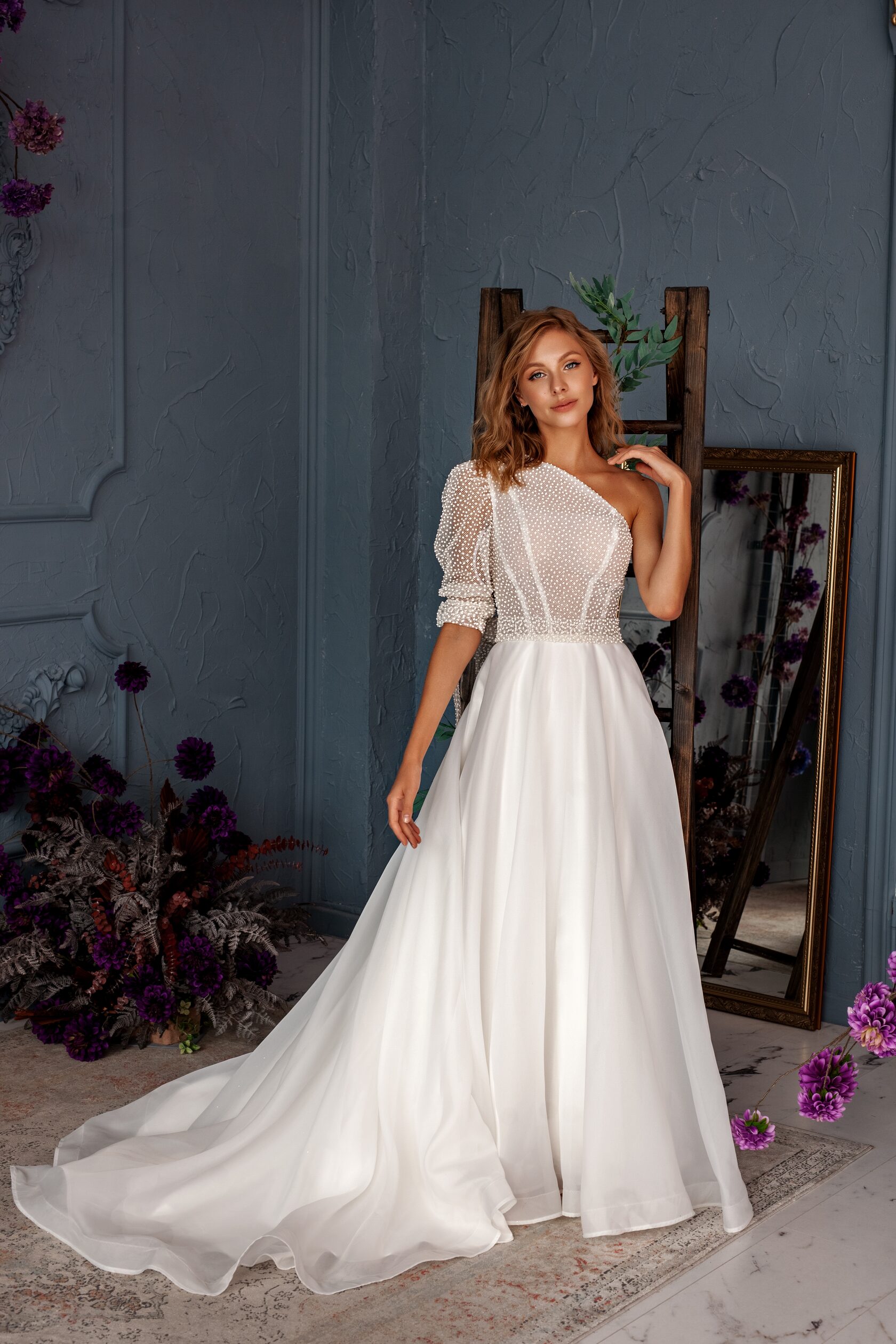 Такое платье подчеркнёт Вашу индивидуальность и стиль. После торжественной регистрации можно снять верхний слой и Вы будете в лаконичной жемчужной комбинации!