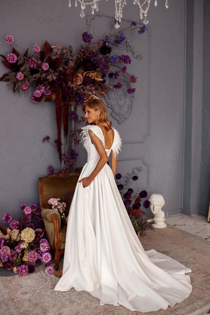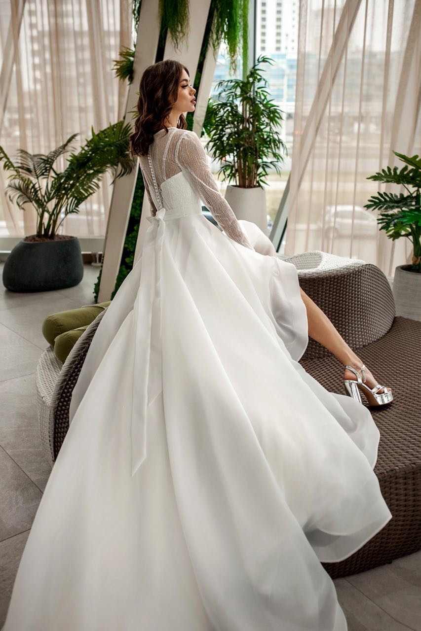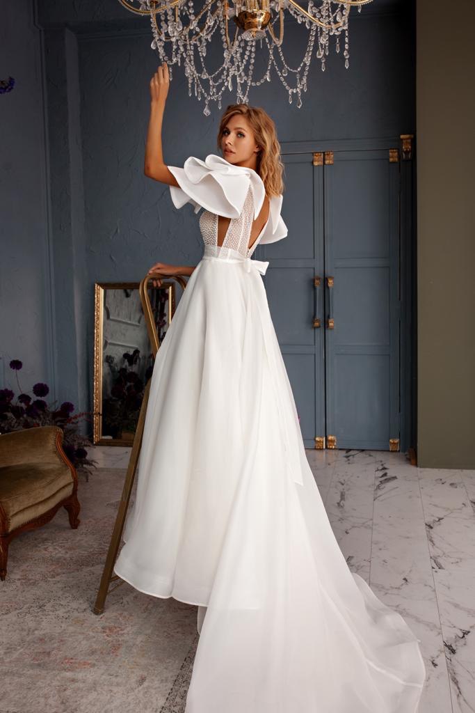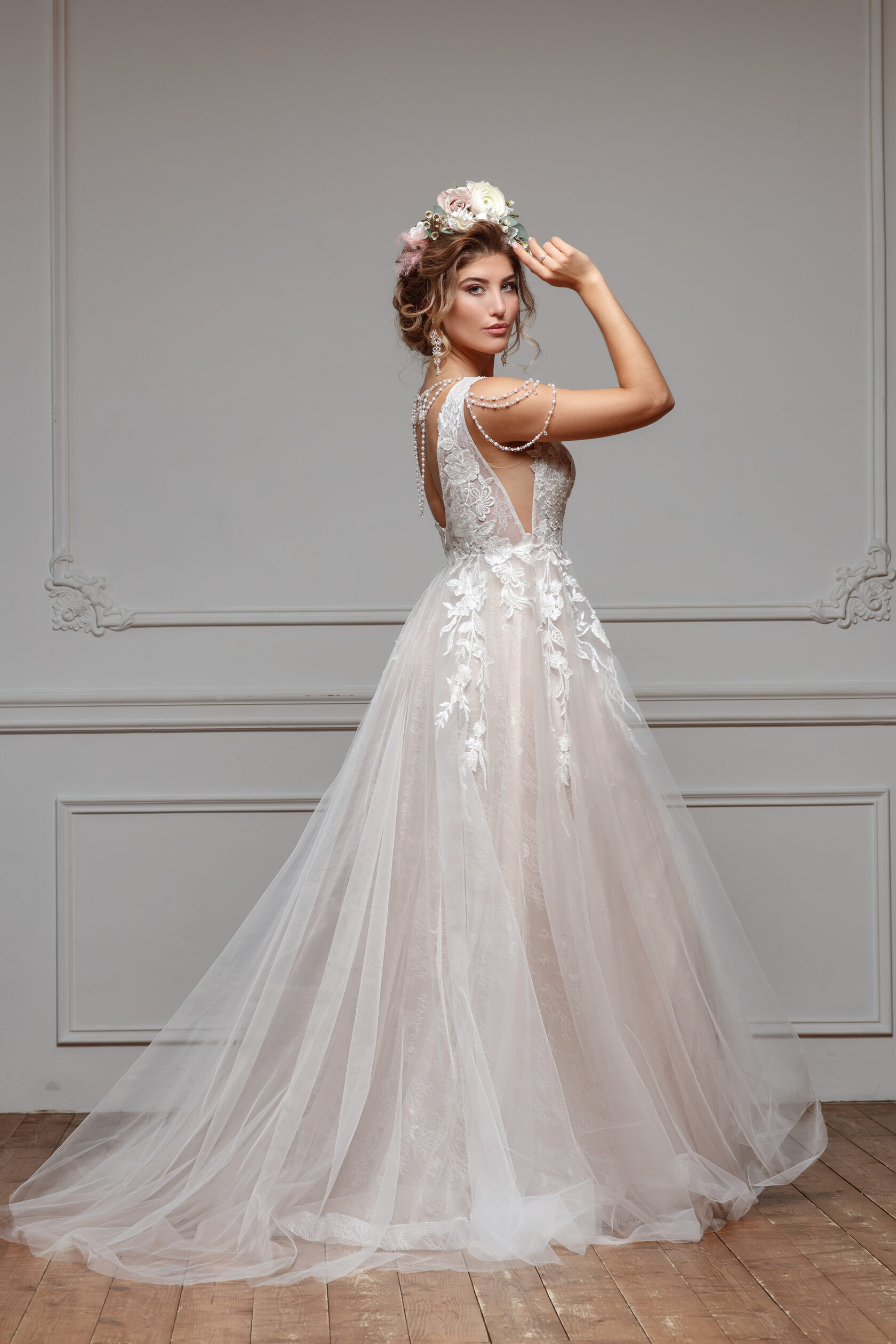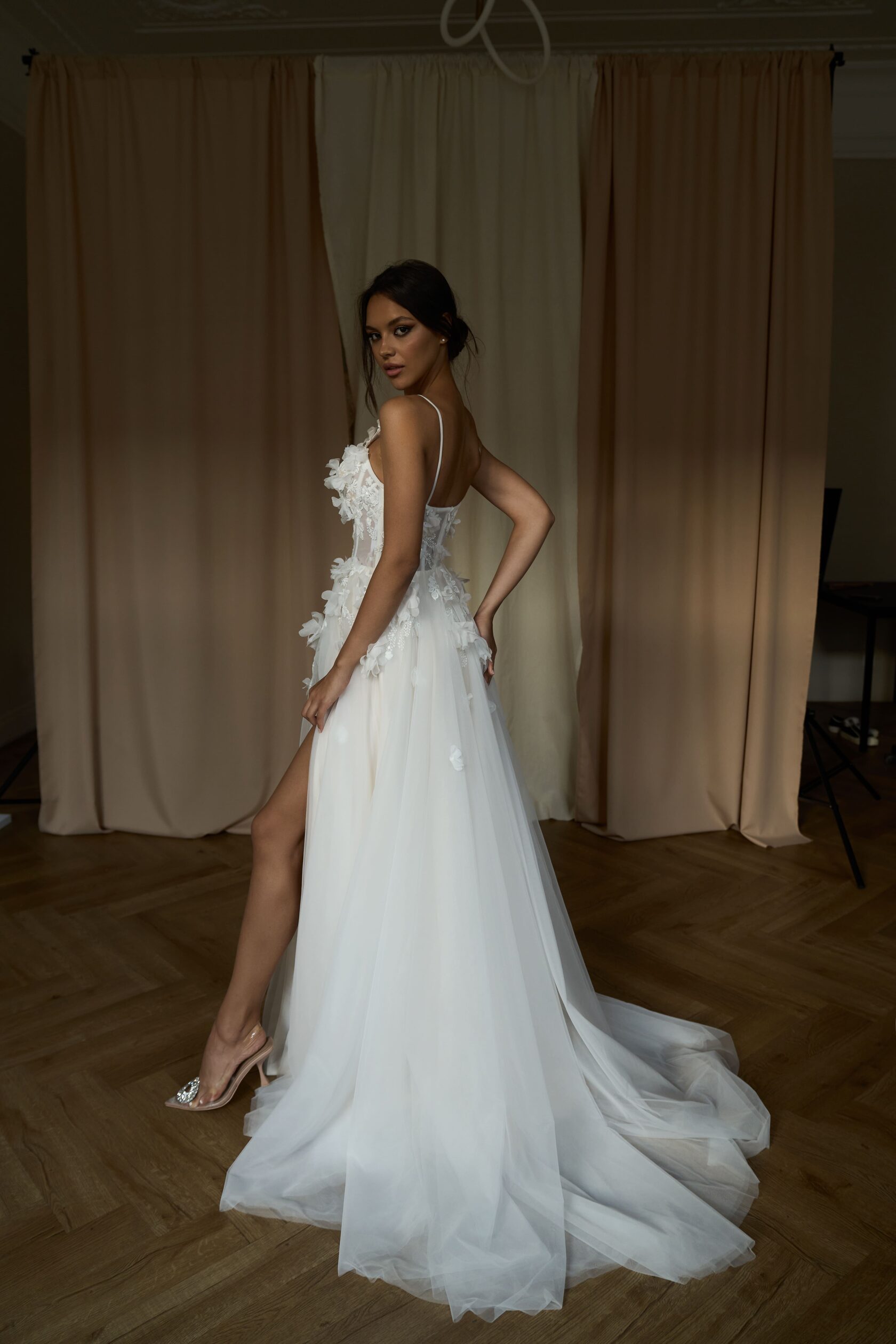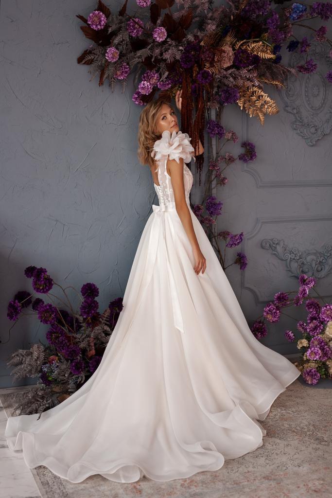 Легкое свадебное платье с пышной юбкой. Прозрачный расколотый лиф с V-образным вырезом и прозрачными треугольными вставками по бокам украшают объемные вышитые цветы и бисер. На открытой спине сверкают бусы, собранные в изысканное украшение.