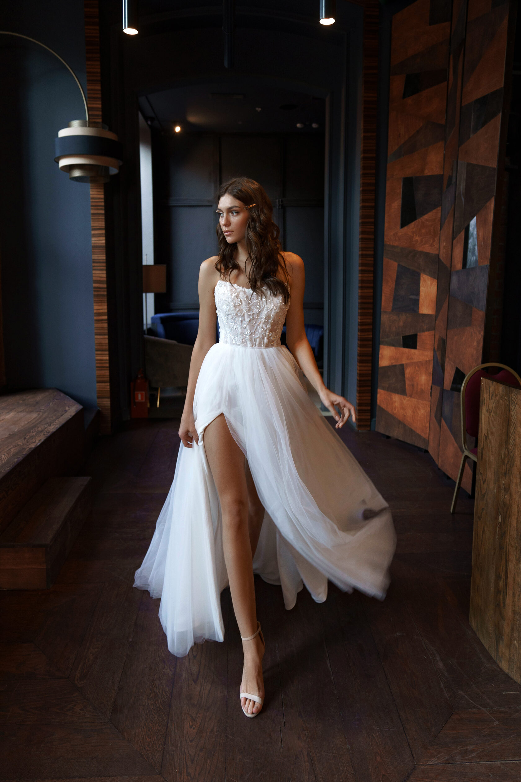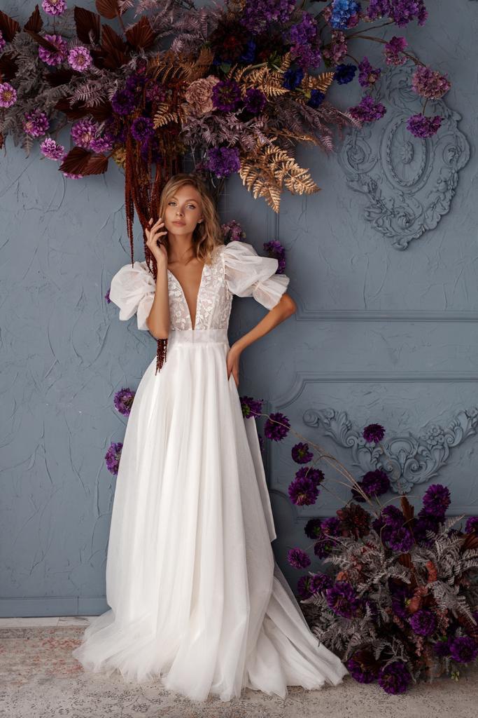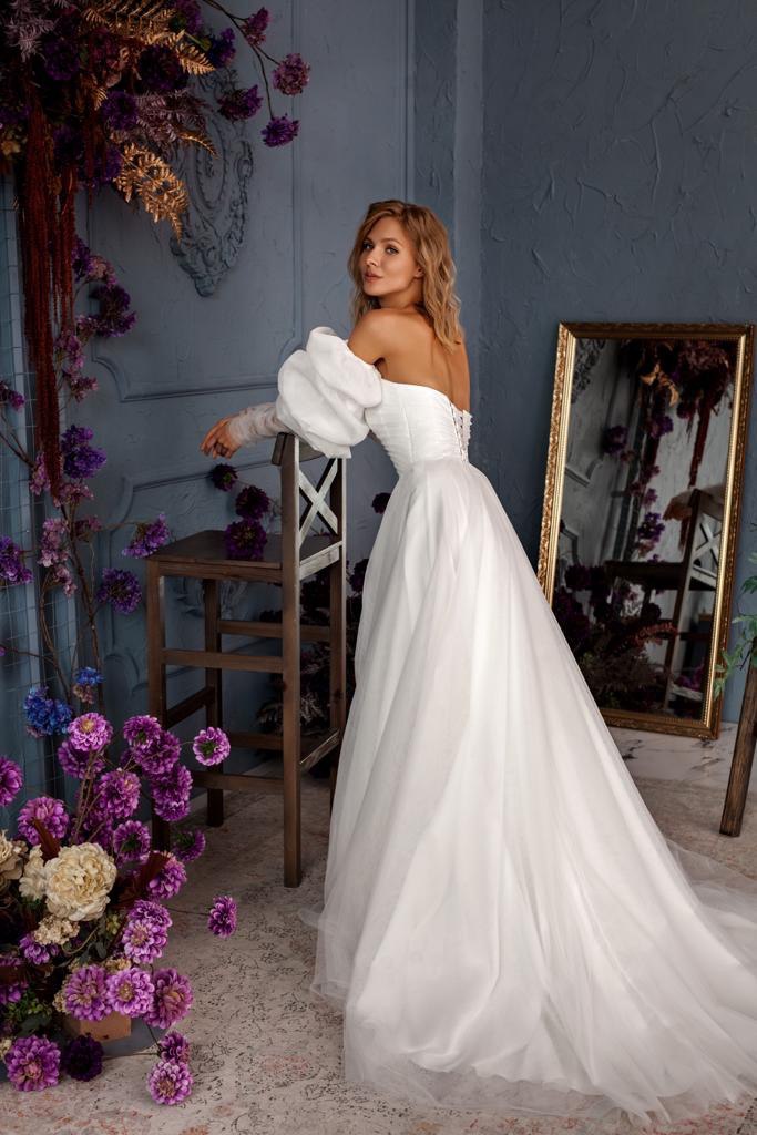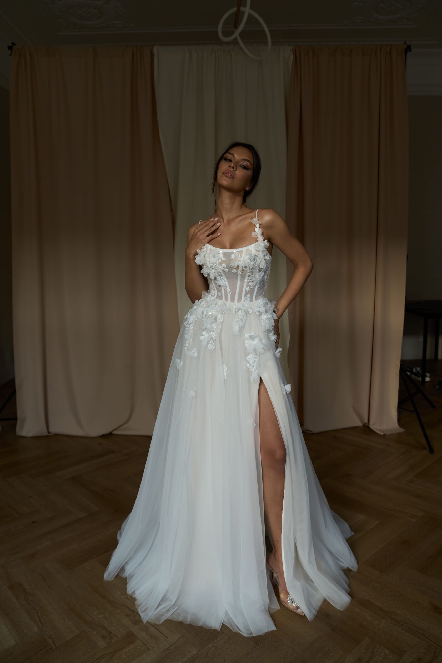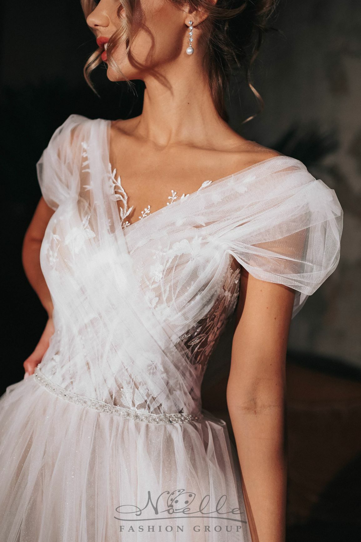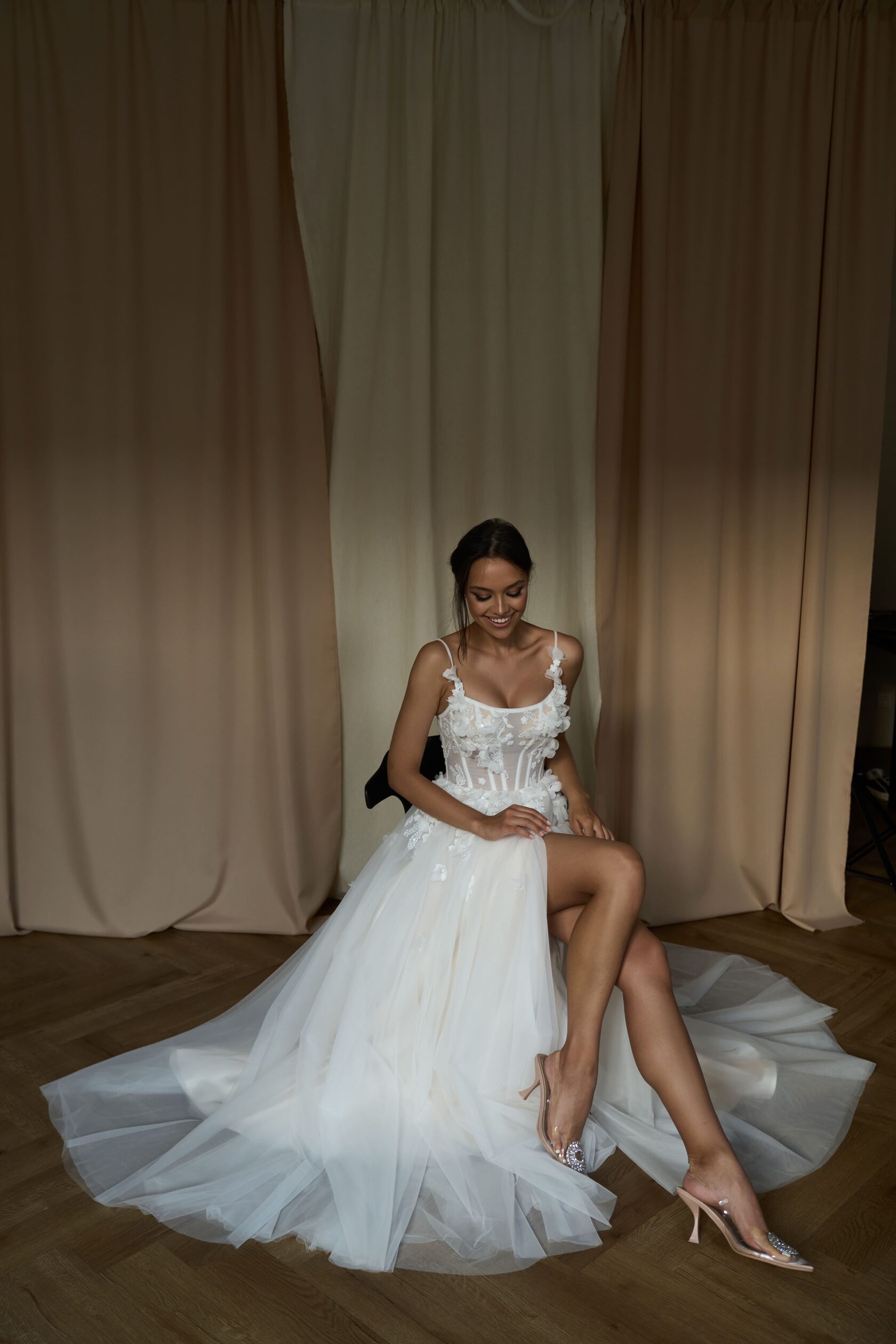 Легкое свадебное платье с пышной юбкой. Прозрачный расколотый лиф с V-образным вырезом и прозрачными треугольными вставками по бокам украшают объемные вышитые цветы и бисер. На открытой спине сверкают бусы, собранные в изысканное украшение.