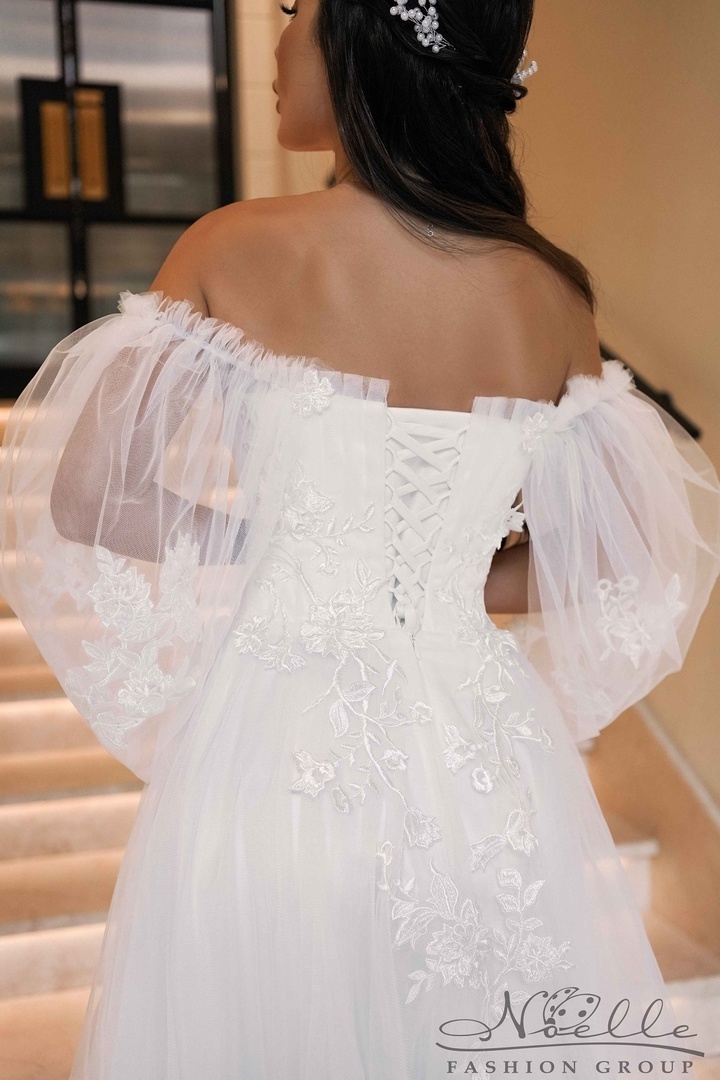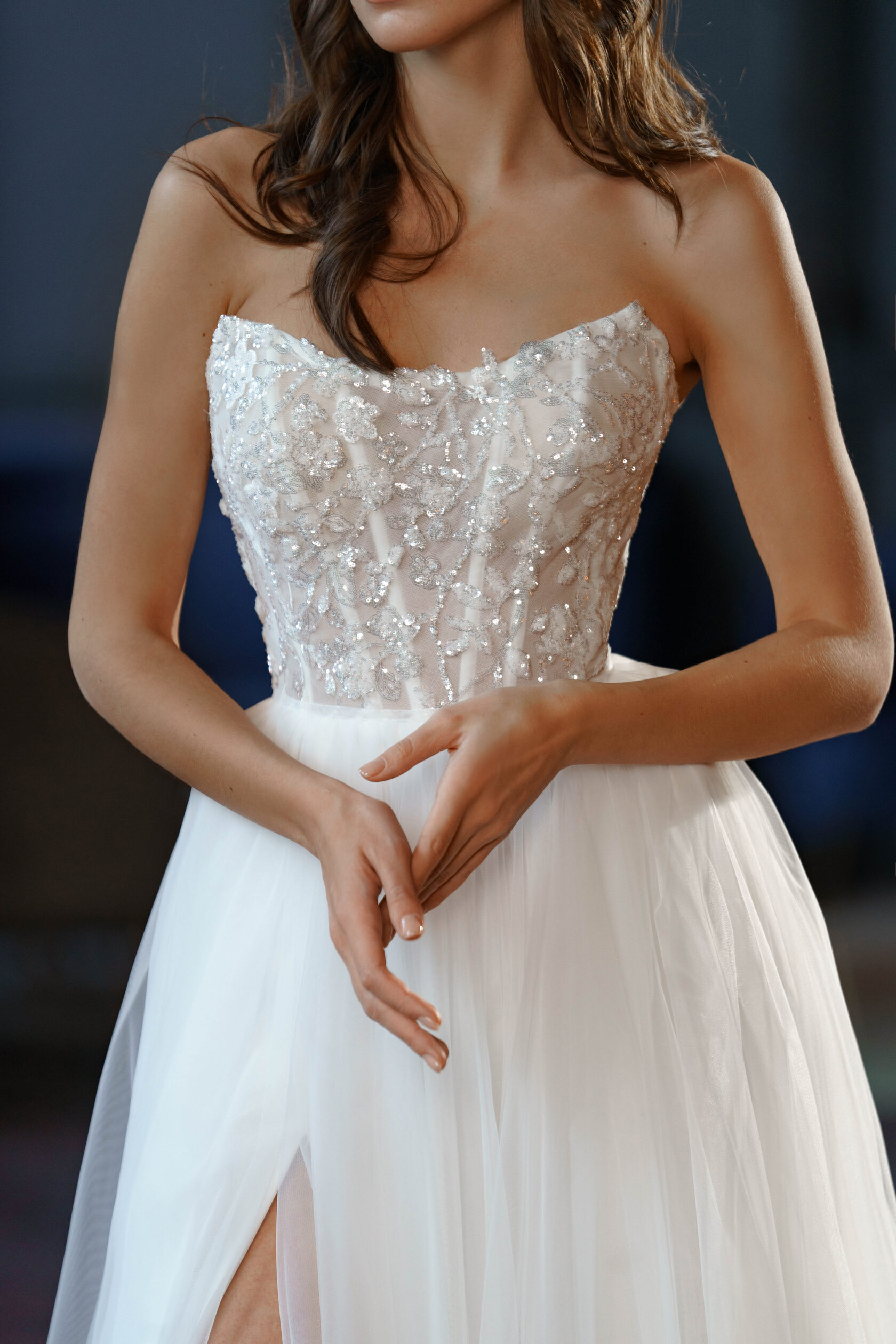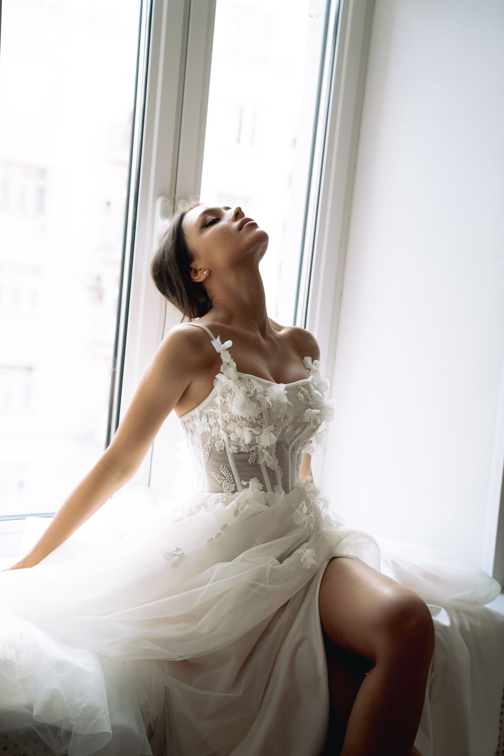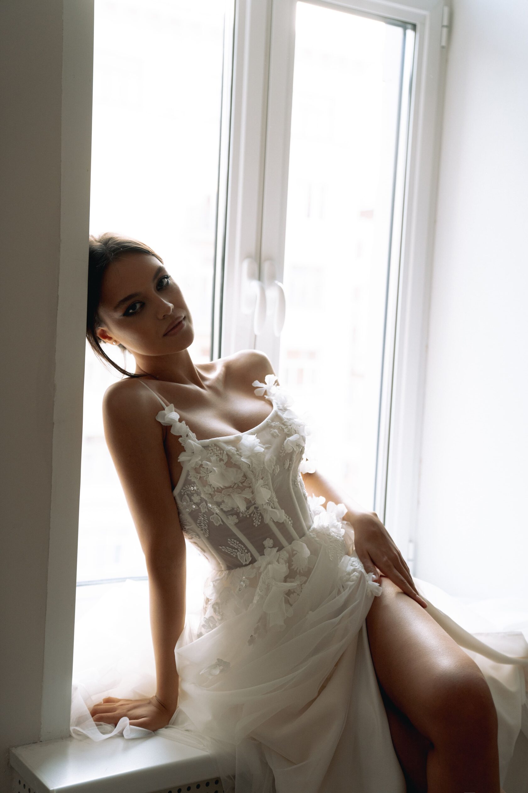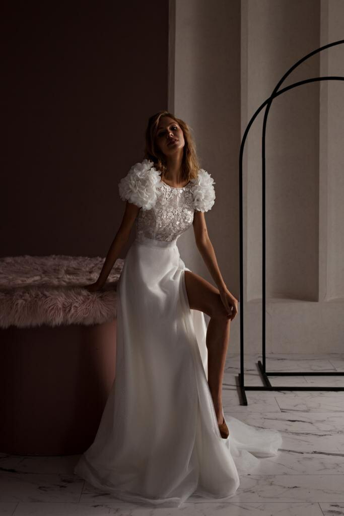 Легкое свадебное платье с пышной юбкой. Прозрачный расколотый лиф с V-образным вырезом и прозрачными треугольными вставками по бокам украшают объемные вышитые цветы и бисер. На открытой спине сверкают бусы, собранные в изысканное украшение.